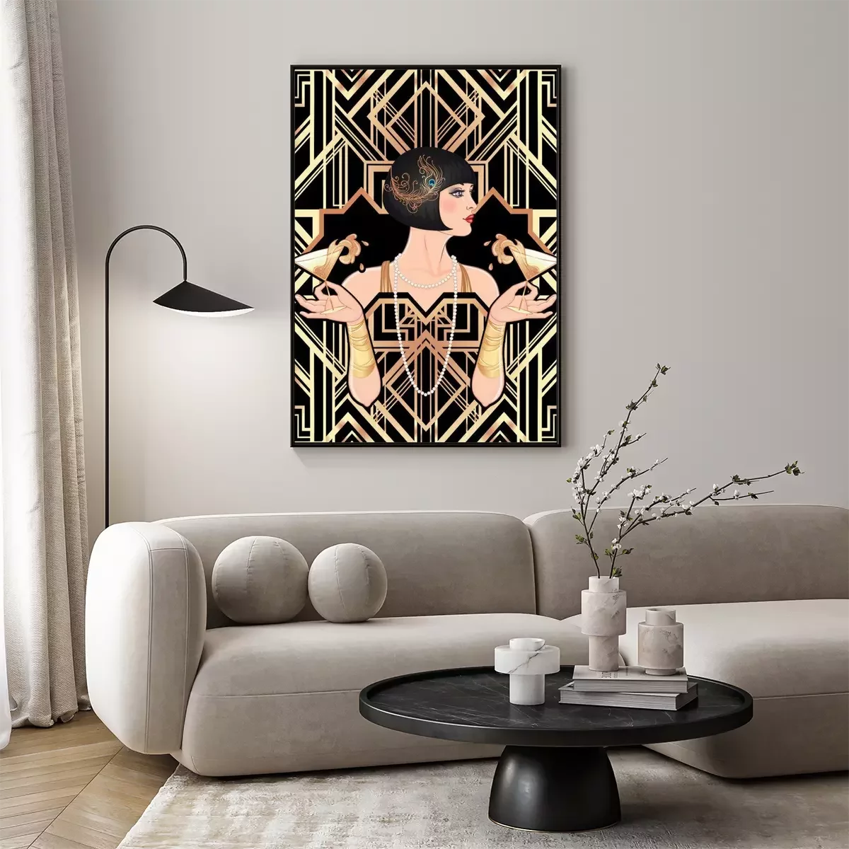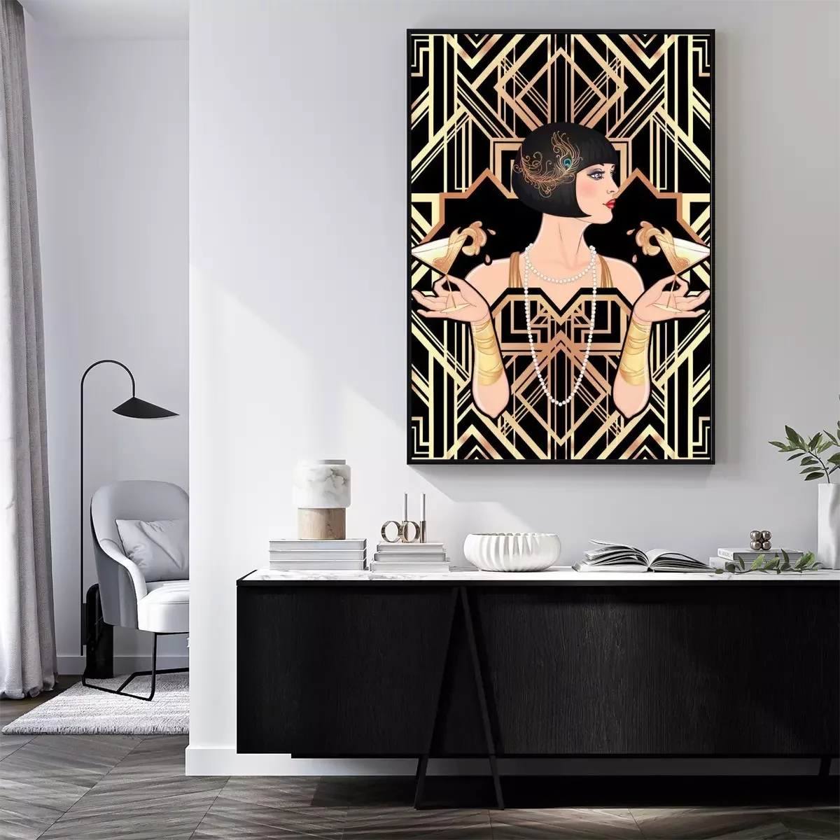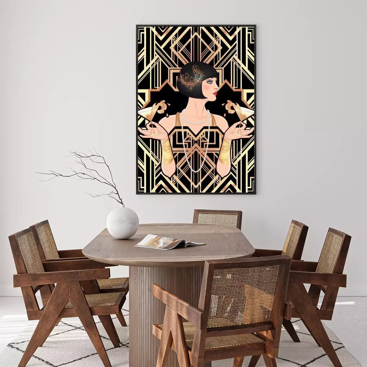 Poster Female hand holding cocktail glass with splash. Art deco (1920's style) vintage invitation template design for drink list, bar menu, glamour event, thematic wedding, jazz party flyer.