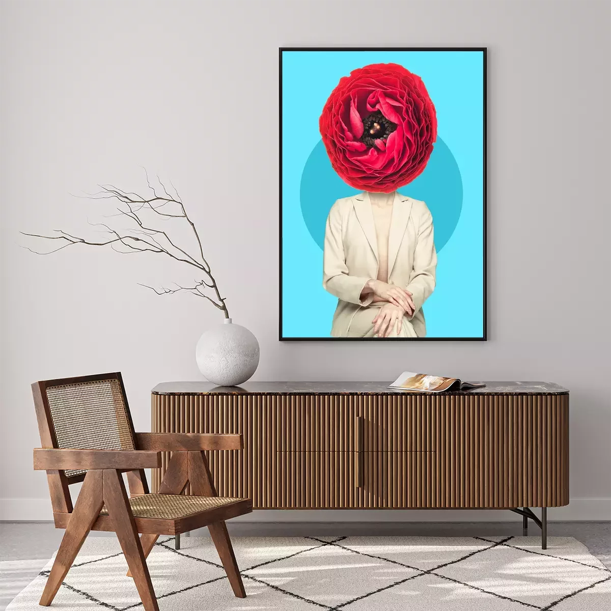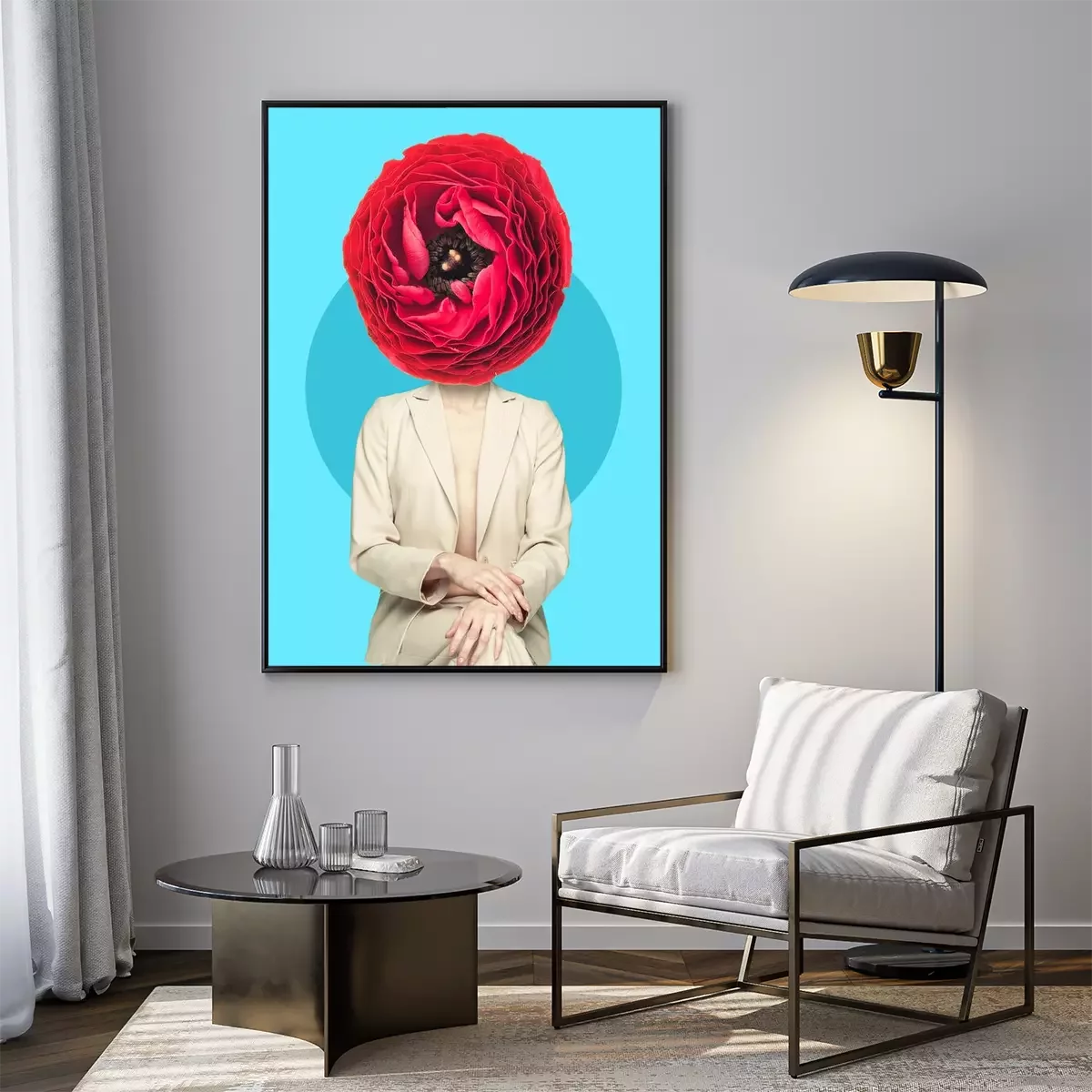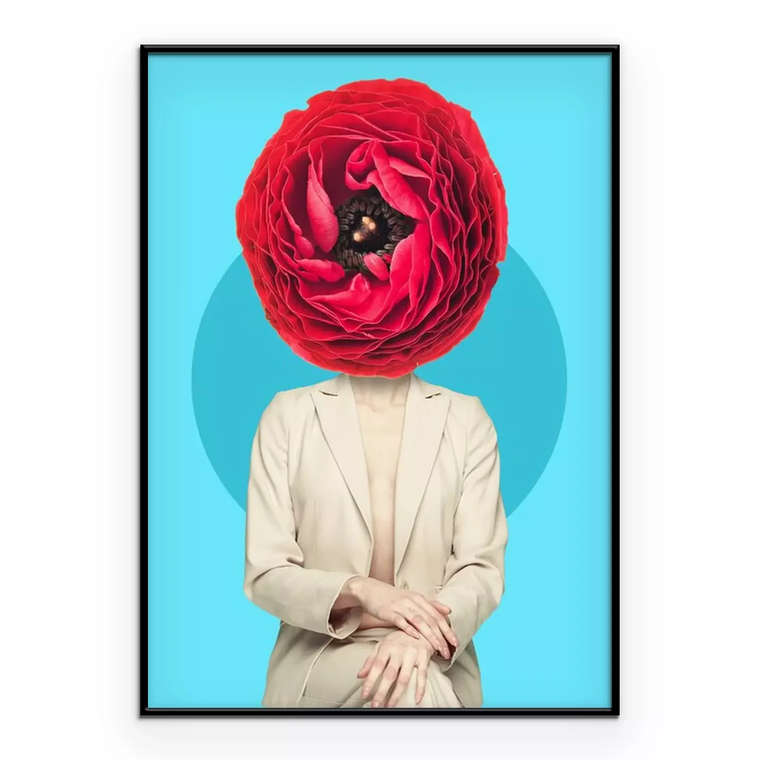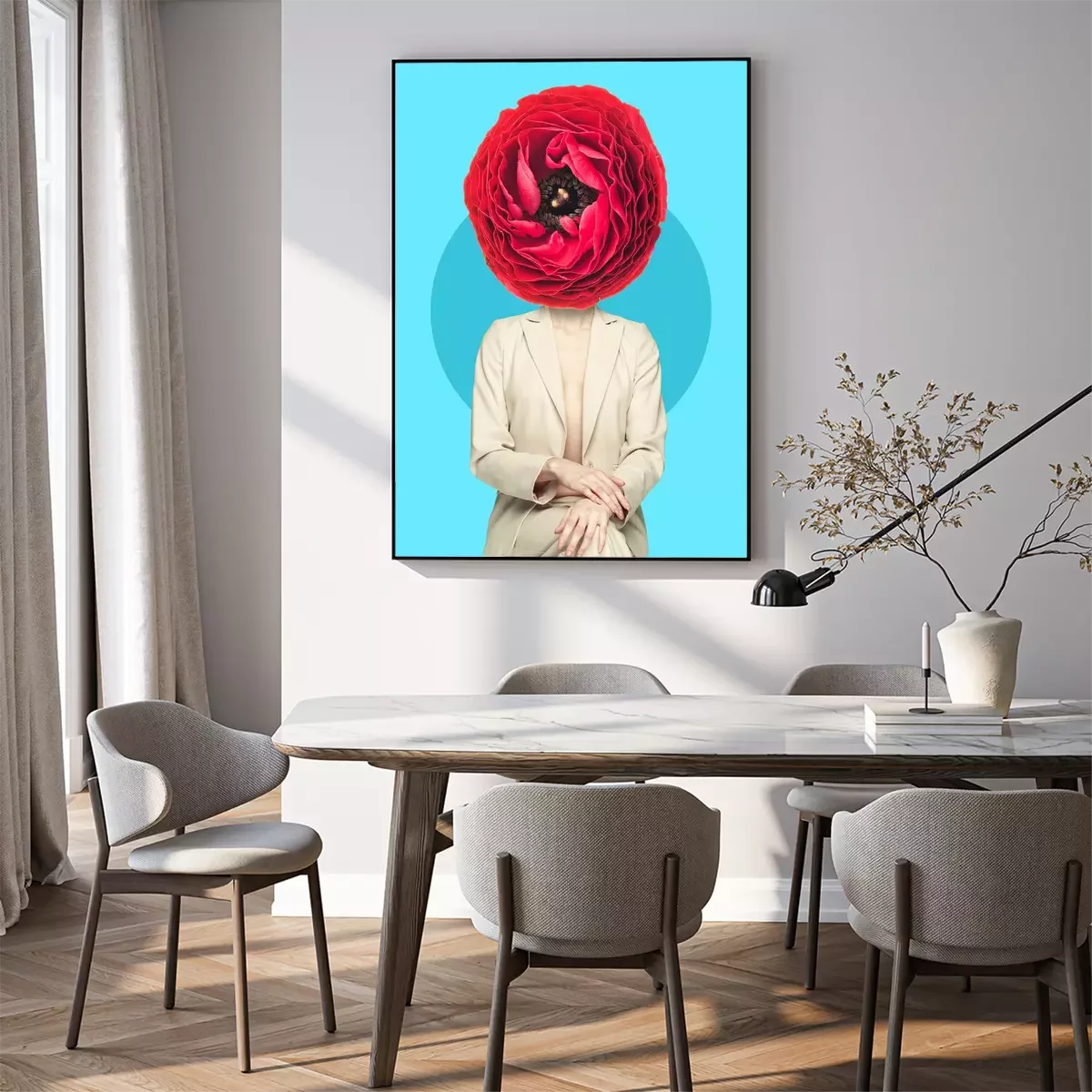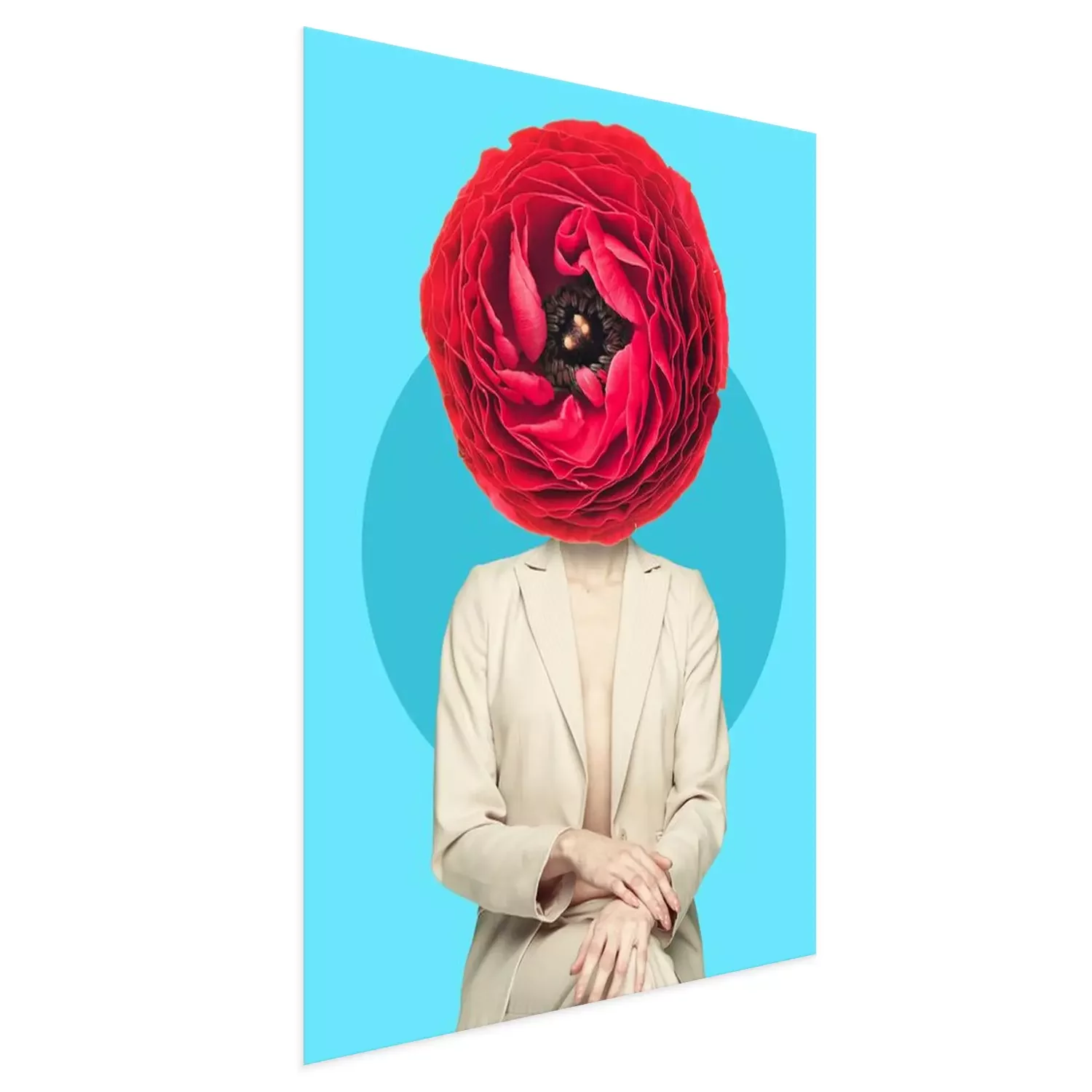 Poster Femininity and clean thoughts. Young woman sitting in beige suit with blooming pink flower as a head against blue background. Modern design. Natural beauty concept. Contemporary pop-art collage.