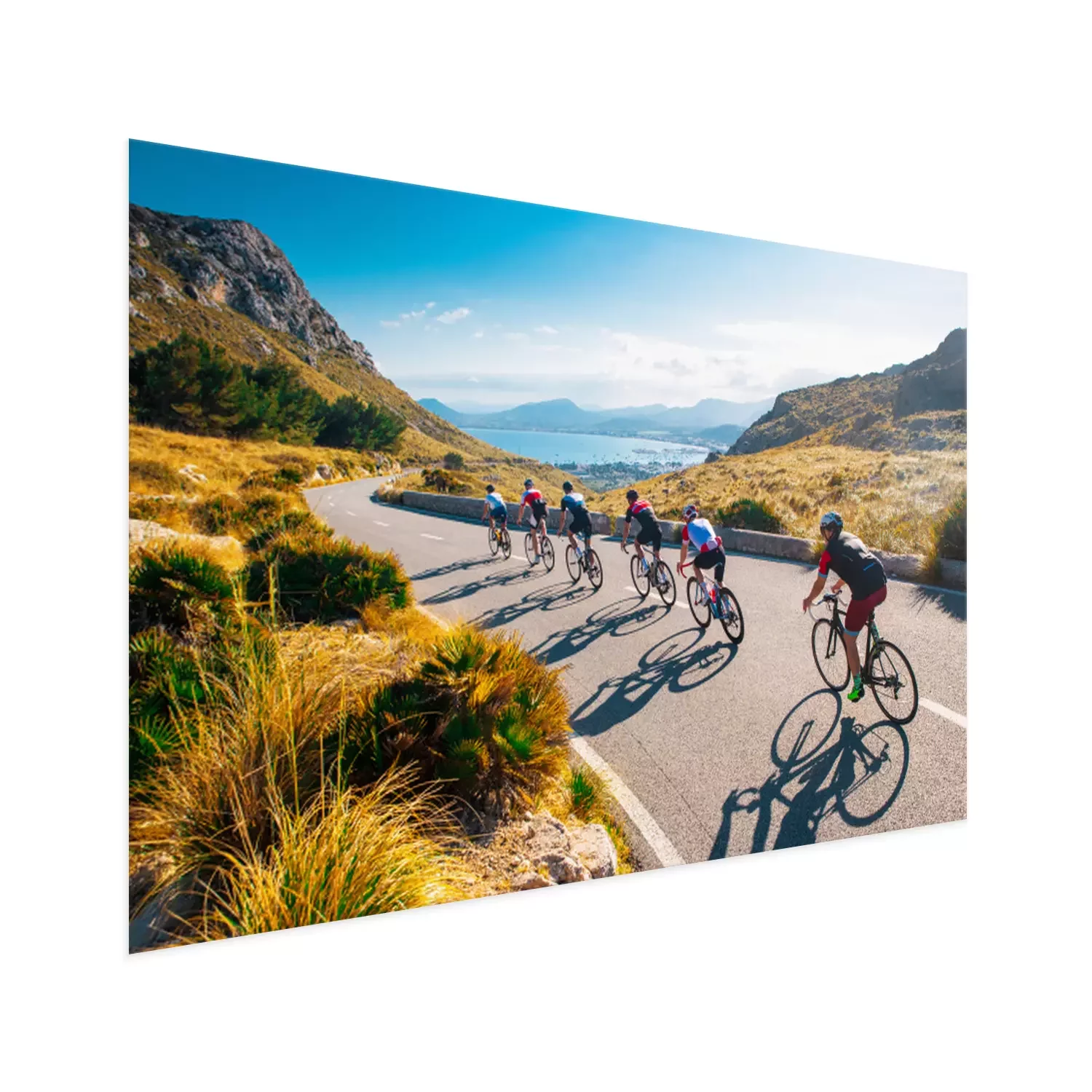 Road cycling photo. Two triathlete train in beautiful nature. Sea and mountains in background. Alcudia, Mallorca, Spain