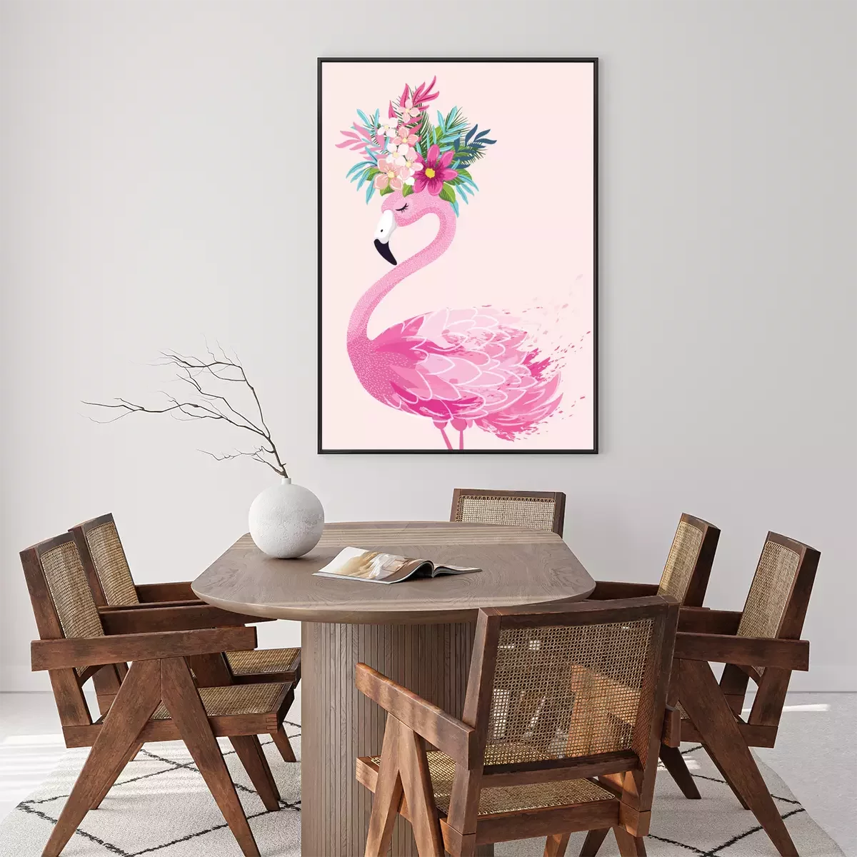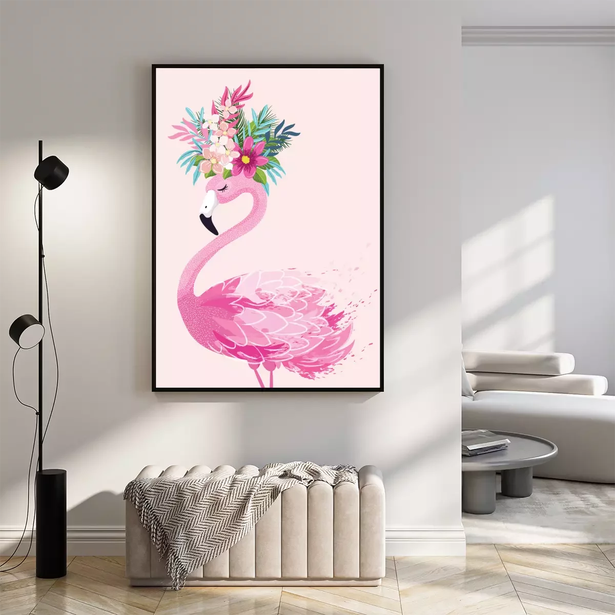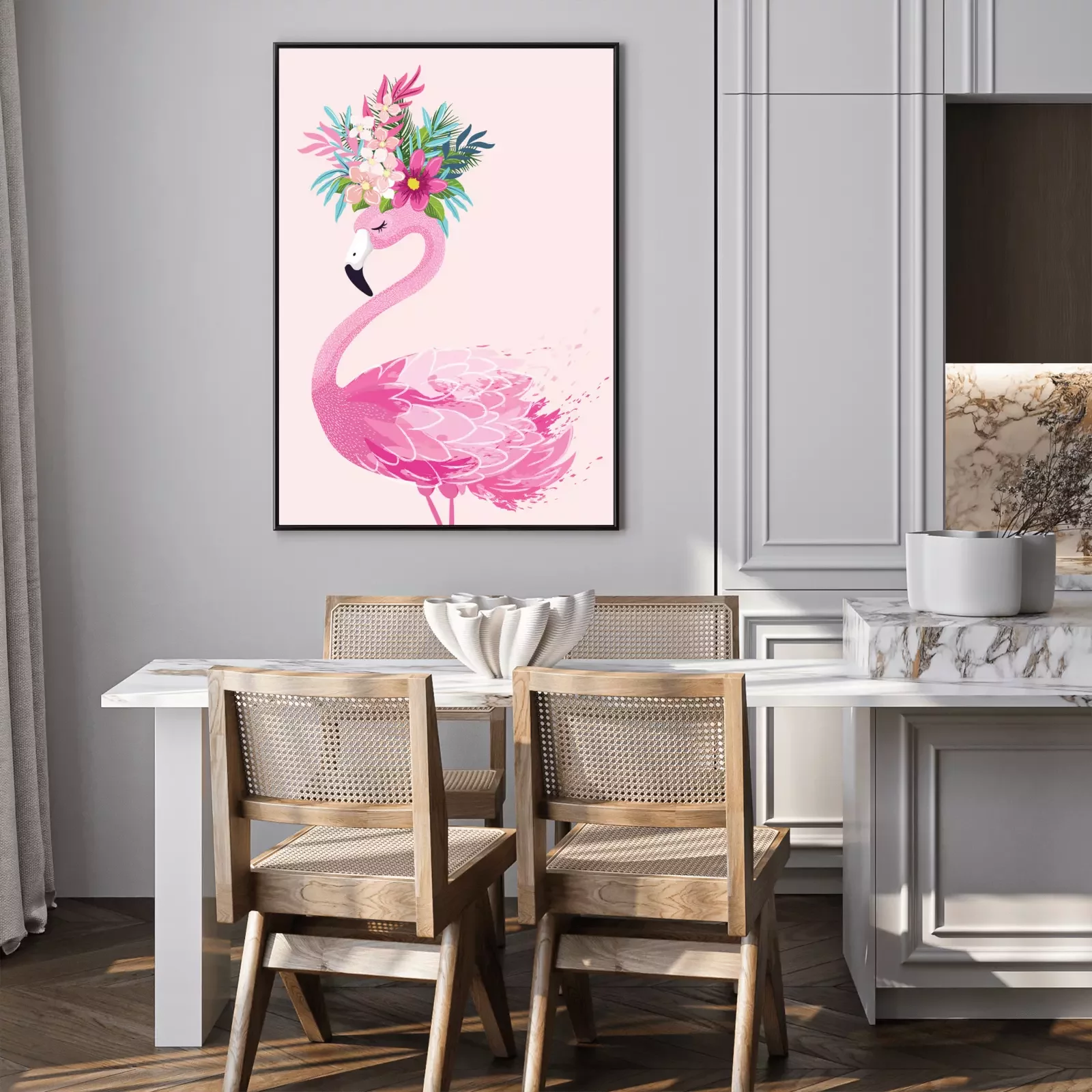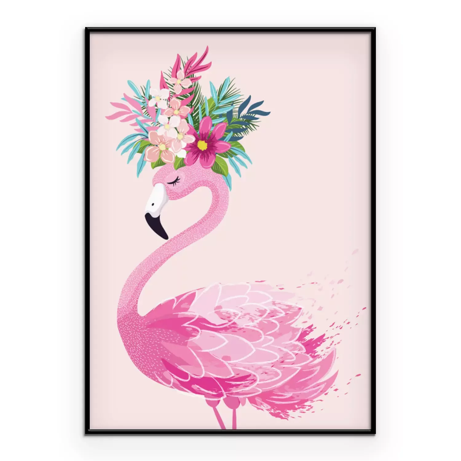 Een roze poster met een flamingo is een perfect voorbeeld van hoe je je interieur met een knipoog kunt decoreren en een vrolijke en speelse sfeer kunt creëren. Een expressieve illustratie met een exotische vogel zal het bestaande interieur verlevendigen en er prachtig uitzien in een ruimte met tropische kamerplanten – ficussen, monsteraplanten of bananenbomen. Het enige wat je nodig hebt, is één grote poster. Flamingo zal zo’n dominant element in de ruimte worden dat hij de hele kamer een geheel nieuwe uitstraling geeft. Hoewel het een sprookjesachtige illustratie is, staat niets in de weg om deze in een woonkamer of slaapkamer op te hangen. Deze roze poster, waarop de flamingo een bloemenkrans op zijn hoofd draagt, zal prachtig staan boven een kast waarop een vaas met bloemen of een bloeiende kamerplant staat. Bloemenmotieven zijn altijd in de mode. Voordat je hem aan de muur hangt, is het de moeite waard om de poster in te lijsten. Flamingo zal bijzonder goed tot zijn recht komen in een zwarte lijst als het interieur moderne meubels bevat. Heeft het interieur retro-elementen, dan is een houten lijst in een bruine tint een geweldige optie. In een woonkamer of slaapkamer zal een exotische flamingo altijd een mooie aanvulling zijn. Deze poster met een roze vogel past echter ook perfect in een kinderkamer. Dit schattige dier zal een sprookjesachtige sfeer creëren en het kind blij maken, vooral als het van dieren houdt. De bloemen op het hoofd van de flamingo maken het een ideale decoratie voor een meisjeskamer. Poster kan boven het bed of bureau worden gehangen, waardoor een gezellige hoek ontstaat om te tekenen en huiswerk te maken. Wil je een unieke inrichting voor een kinderkamer creëren, dan is de flamingo een perfect uitgangspunt. Poster deze met een tropisch dier kan worden aangevuld met andere afbeeldingen van exotische vogels, zoals papegaaien en toekans, of met bloemmotieven. Ook roze, gestoffeerde panelen die op de muur achter het bed worden geplakt als hoofdbord, zullen perfect passen. Hang de poster erboven, en je creëert een prachtige slaapplek voor je kind.