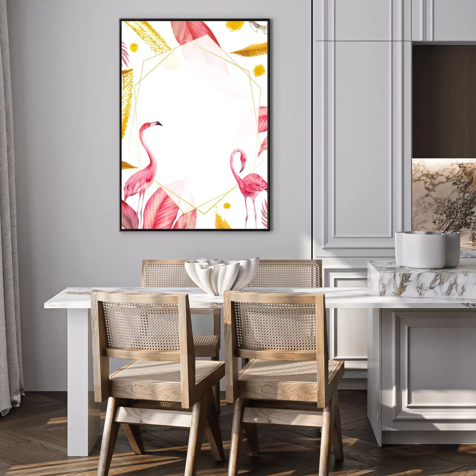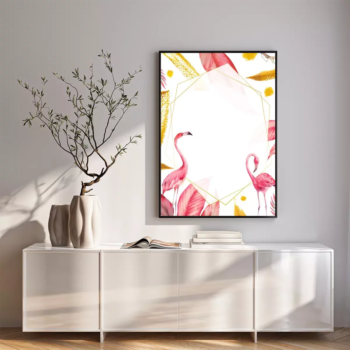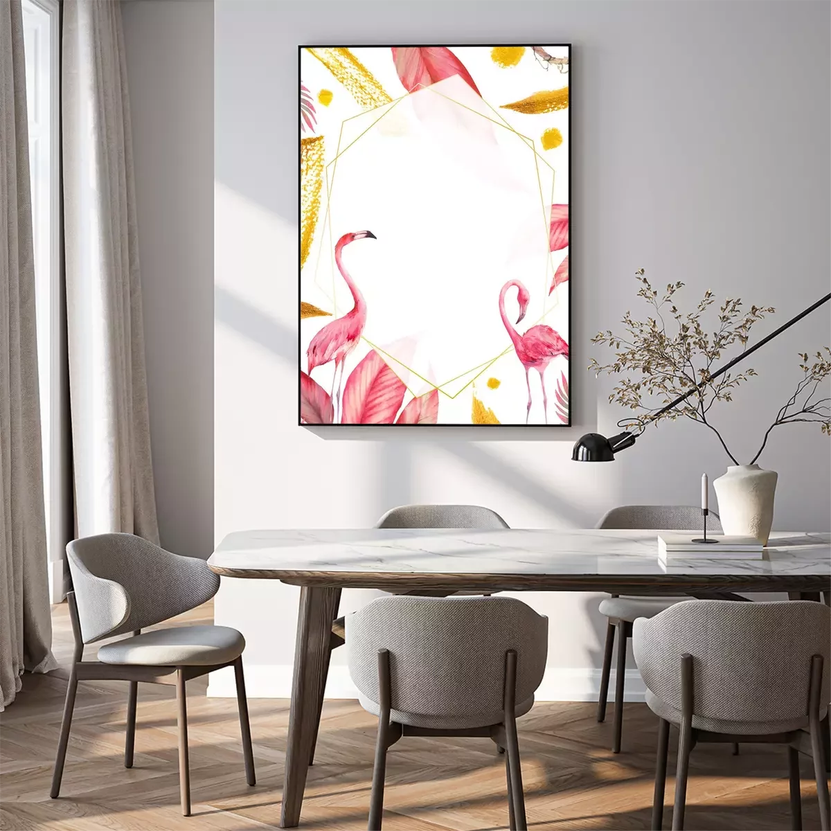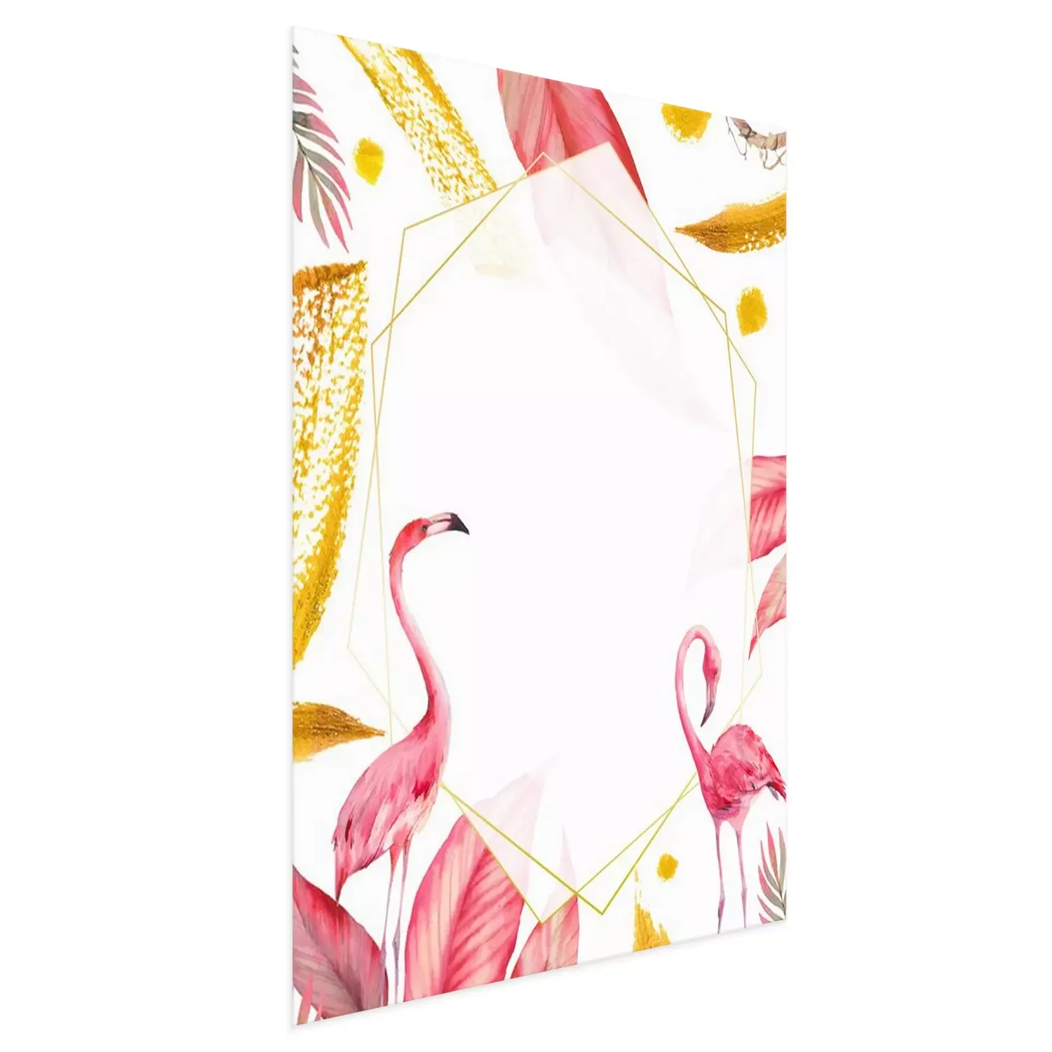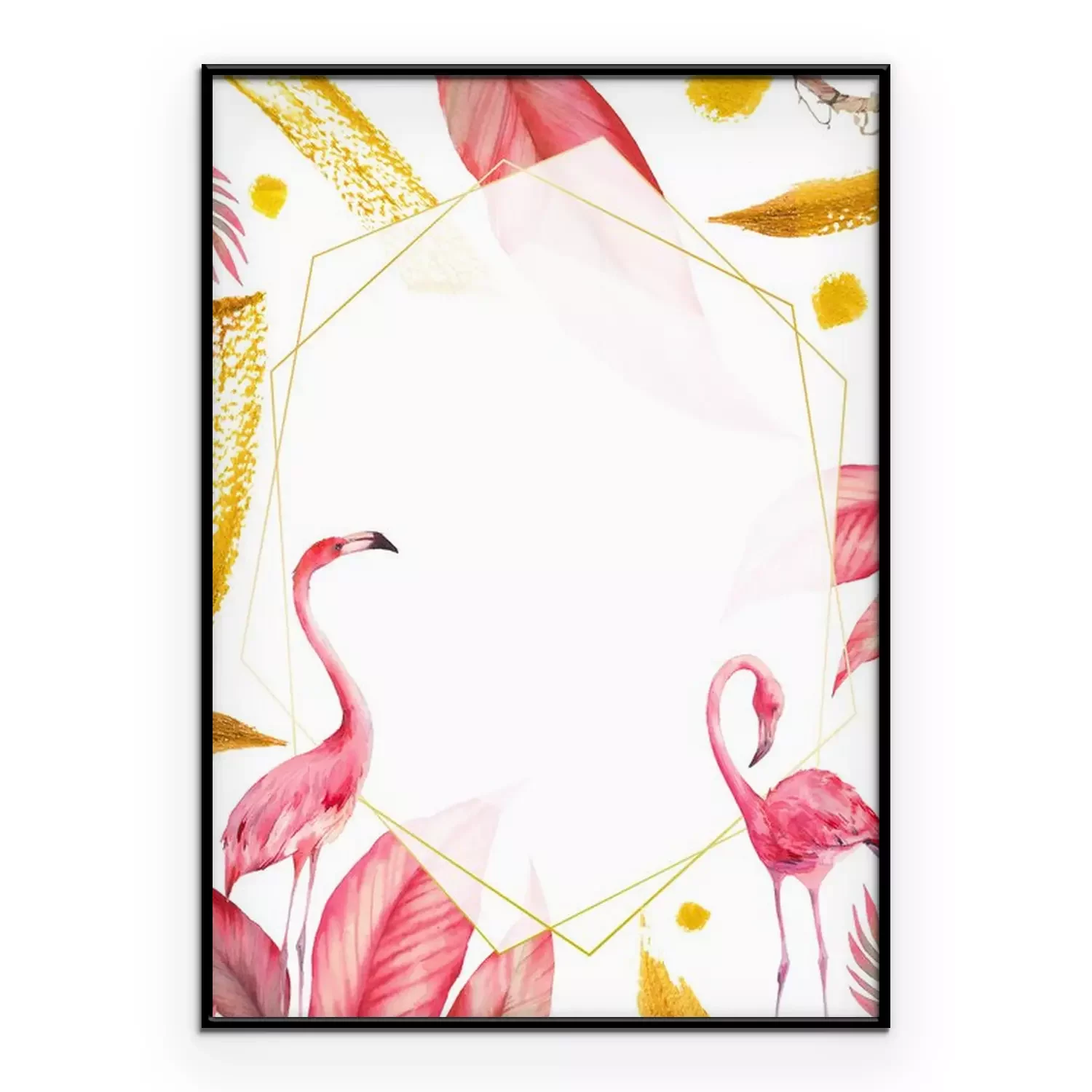 Poster Flamingos party invitation. Watercolor tropical illustration with flamingo couple, golden strokes and exotic tree leaves background. Hand drawn bright card design
