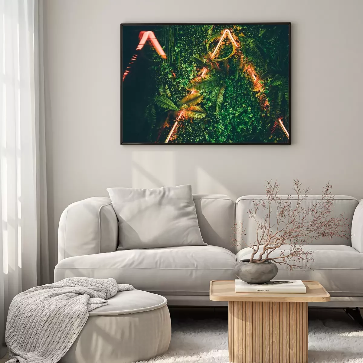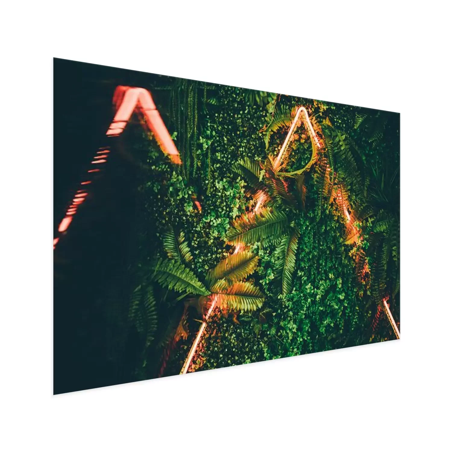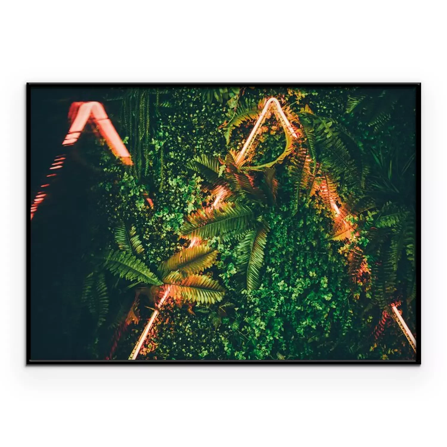 Poster: Flat lay. Creative fluorescent color layout made of tropical leaves with neon light triangle .