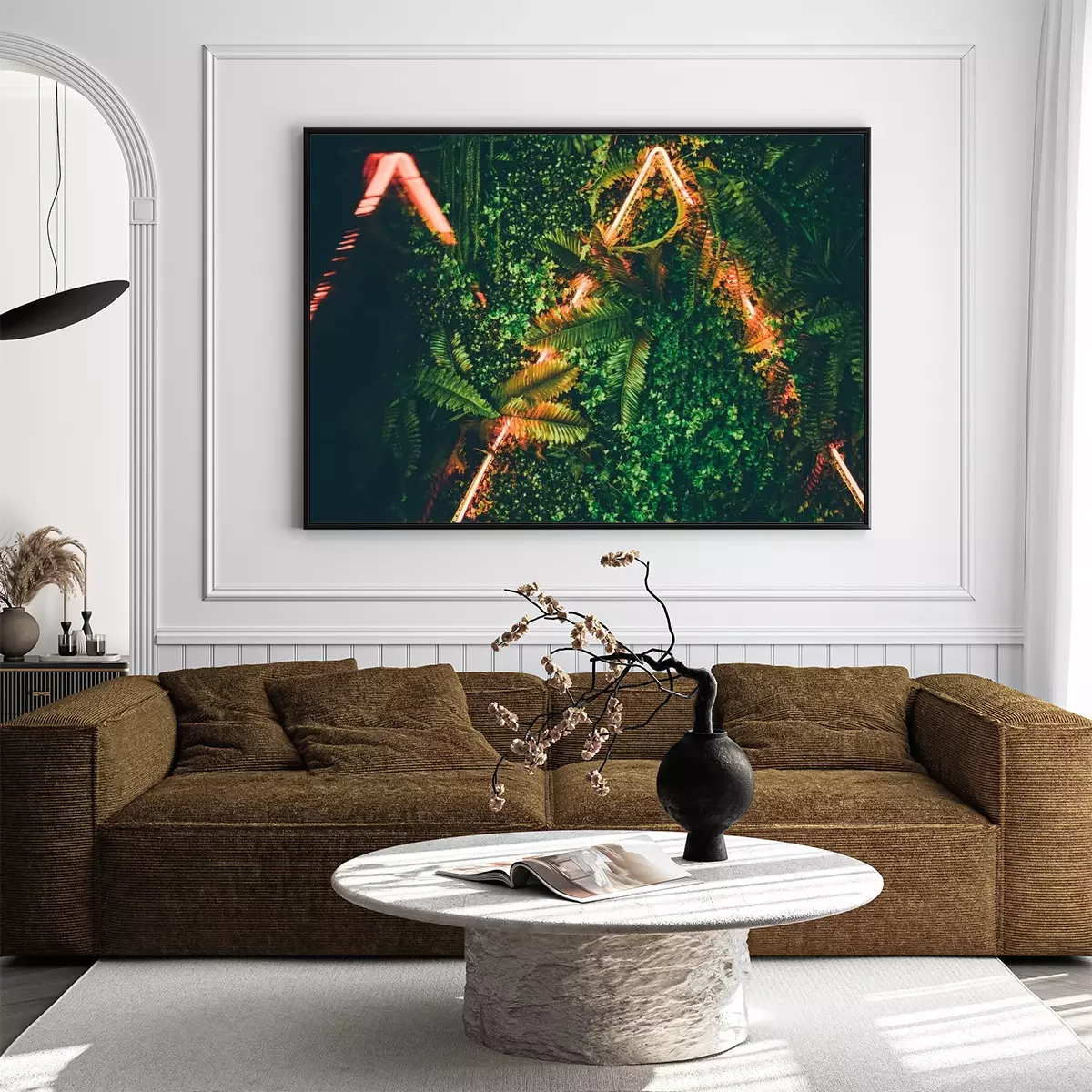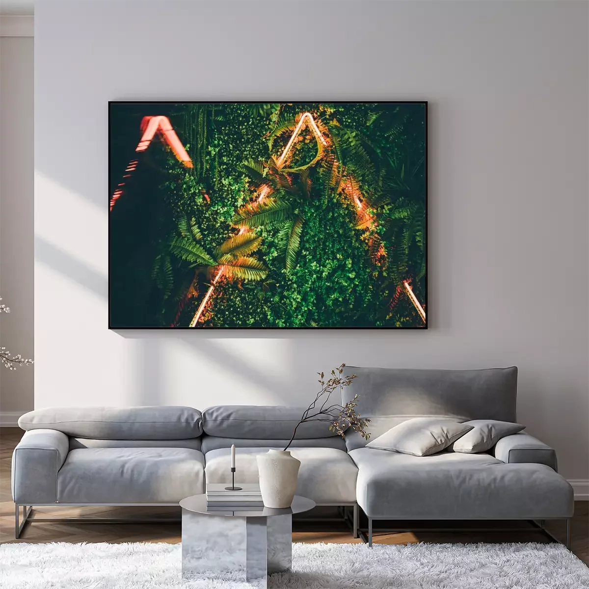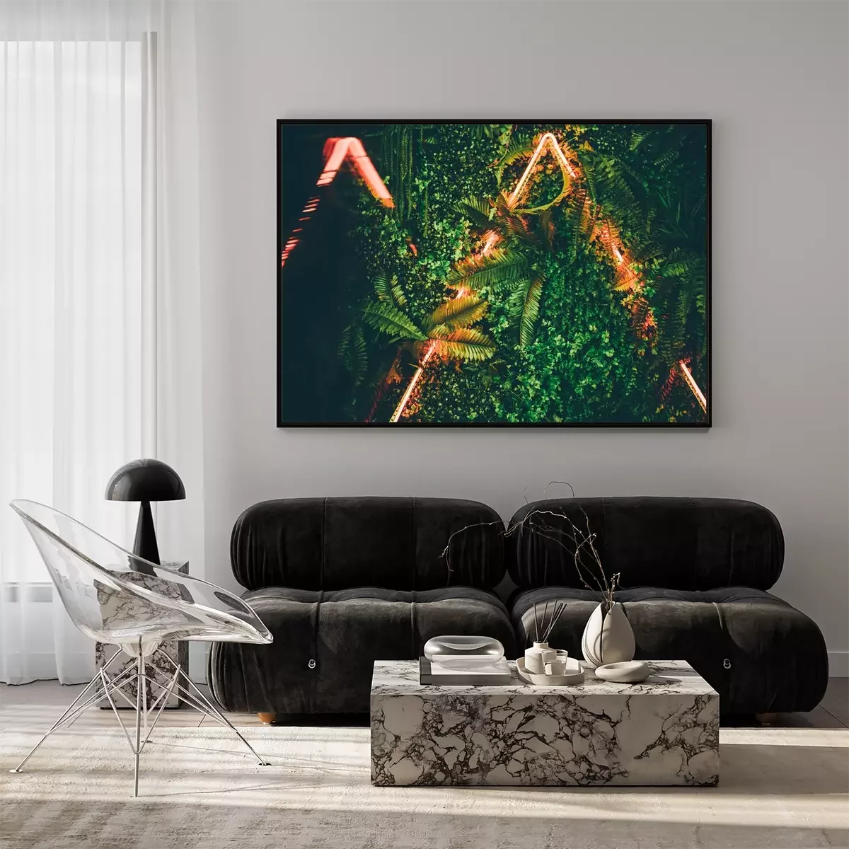 Poster: Flat lay. Creative fluorescent color layout made of tropical leaves with neon light triangle .