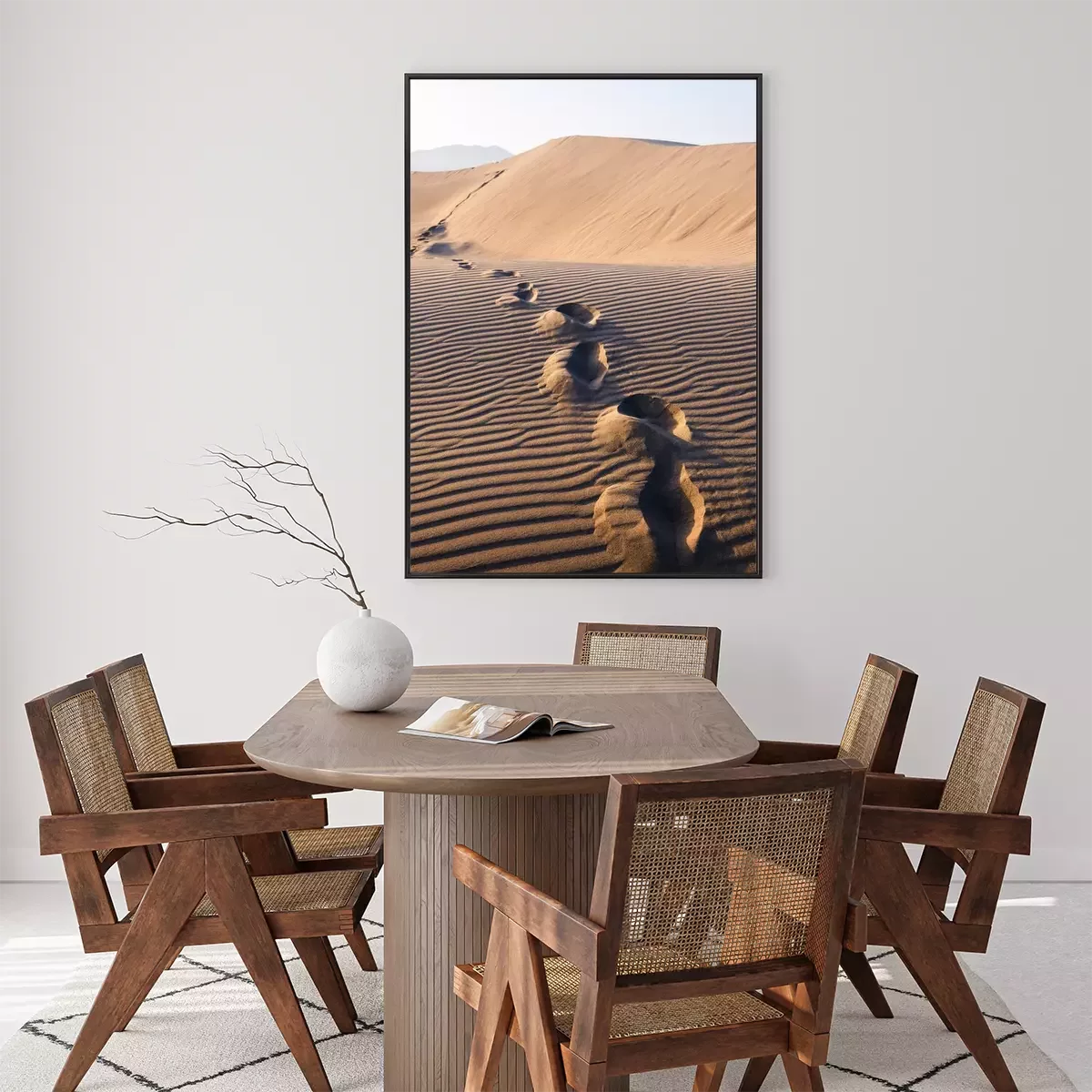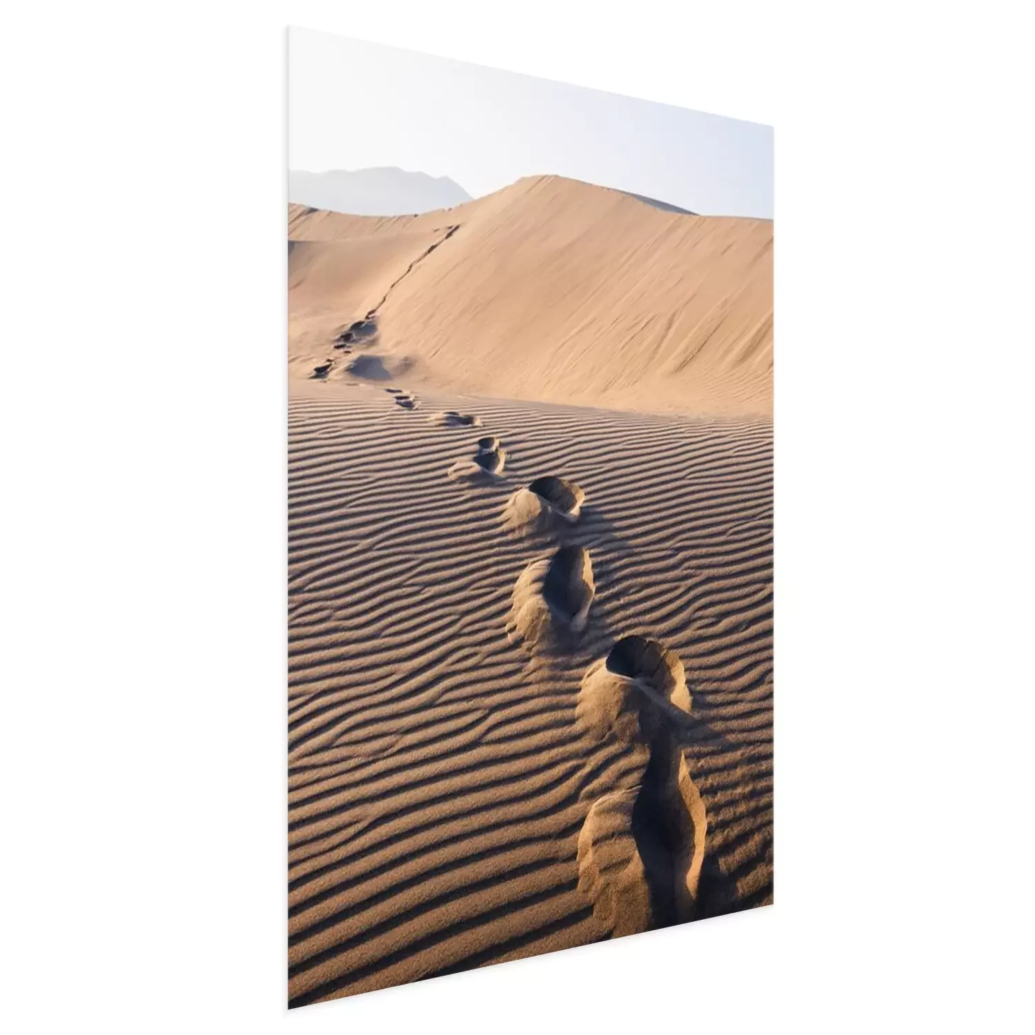 Poster: Footprints on sand in the desert stretching into the distance. Hot landscape with sand dunes against the clear sky