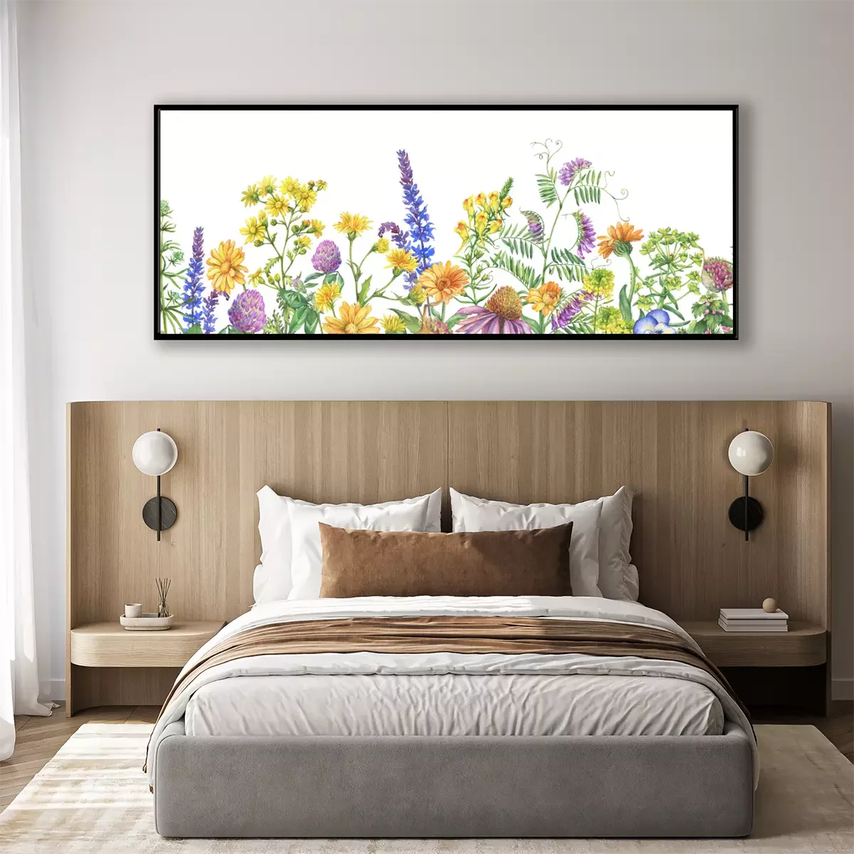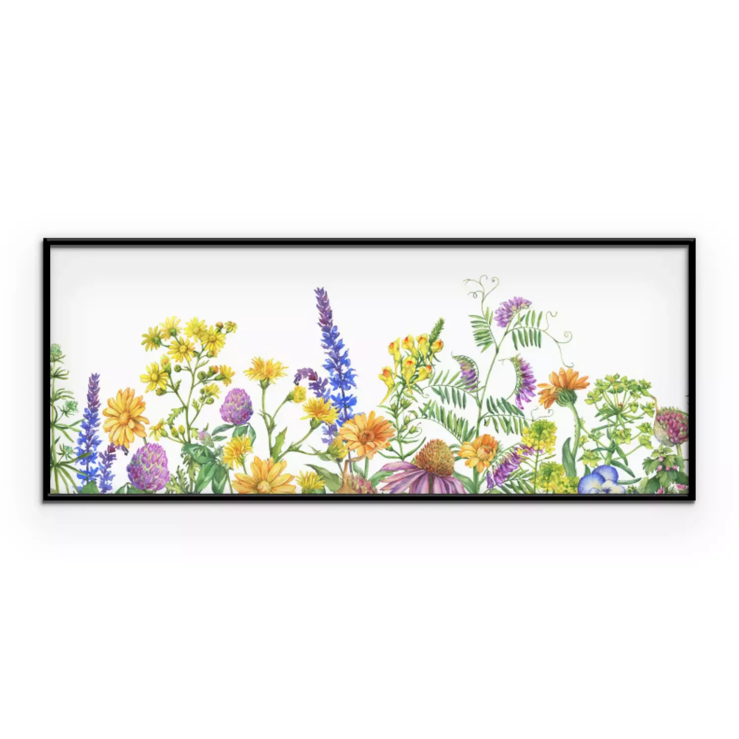 Poster Frame, rand met bloeiende wilde bloemen, medicinale kruiden. Waterverfhand getrokken die het schilderen illustratie op een witte achtergrond wordt geïsoleerd.