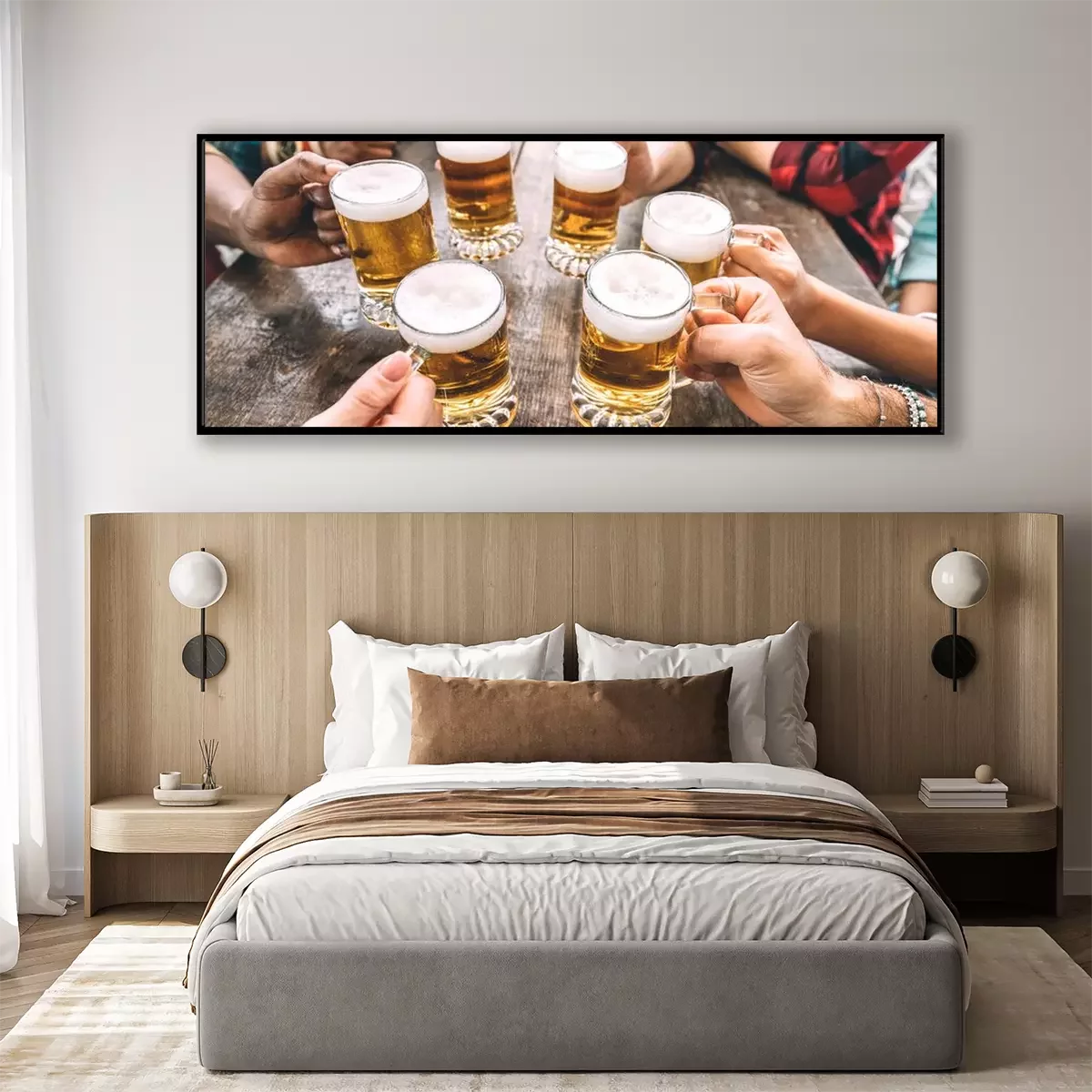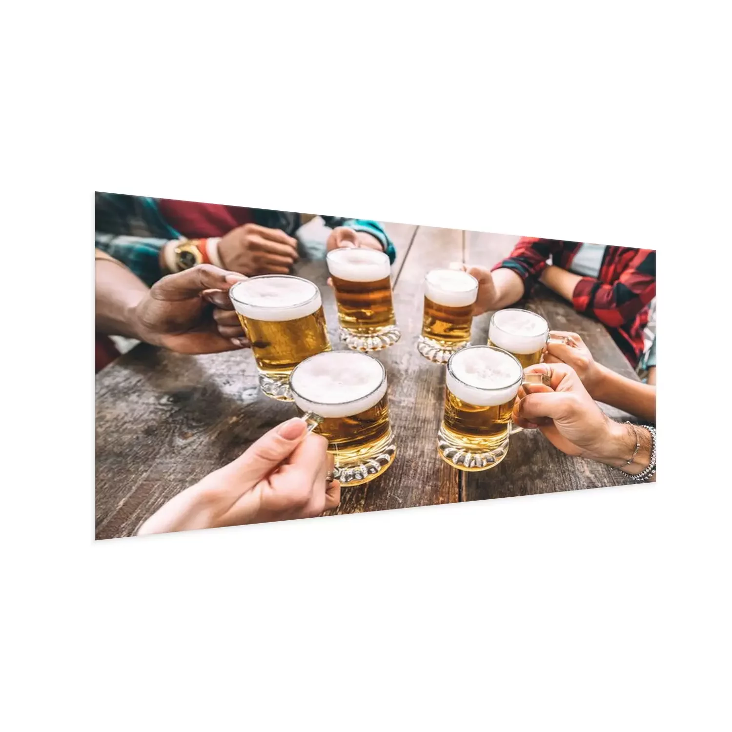 Poster: Friends hands toasting beer pints at brewery pub restaurant - Beverage concept with young people enjoying time together and having fun at vintage brew bar - Focus on right lower glass - Warm filter