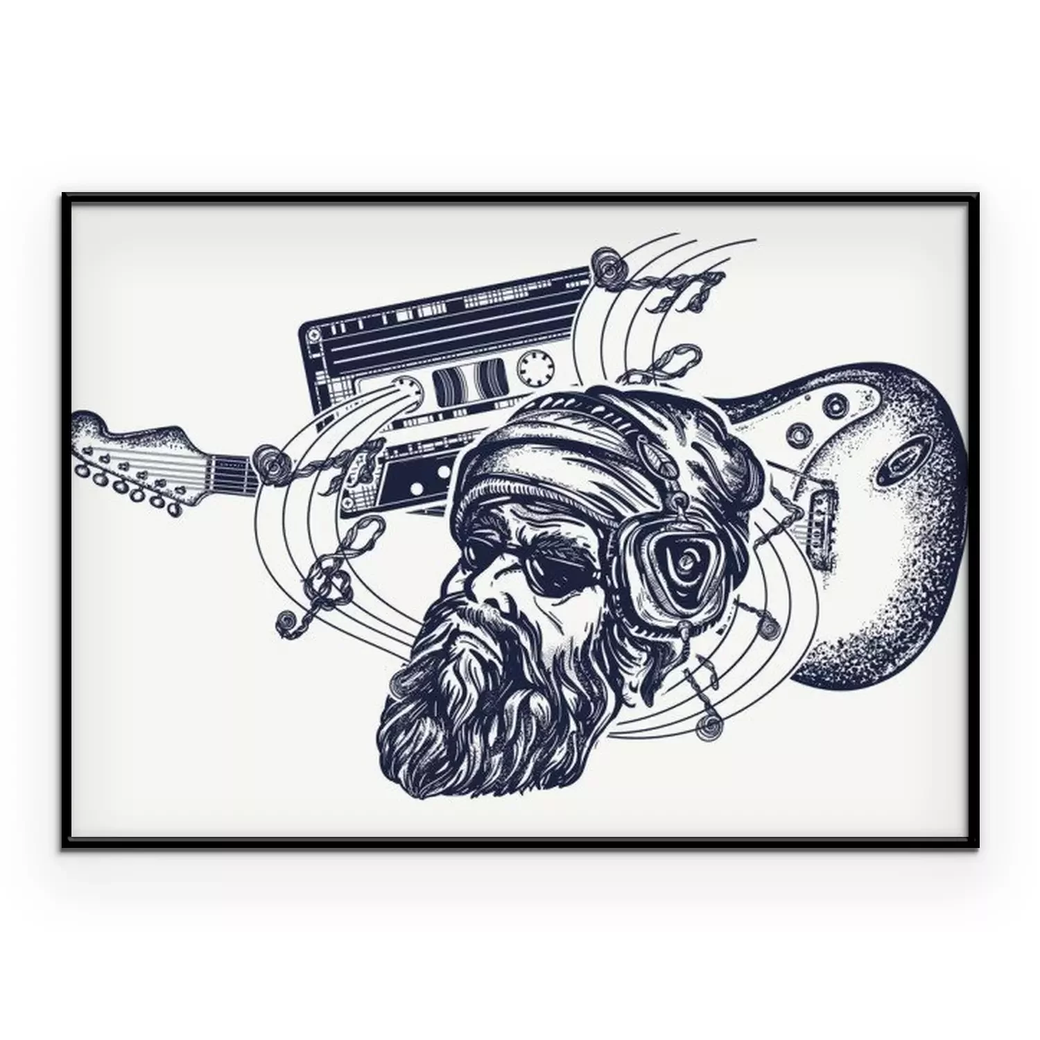 Poster: Gebaard man, gitaar en audiocassette tattoo en t-shirt design. Electro gitaar en muziek notities rock, symbool van hard rock, punk muziek, rock and roll-kunst