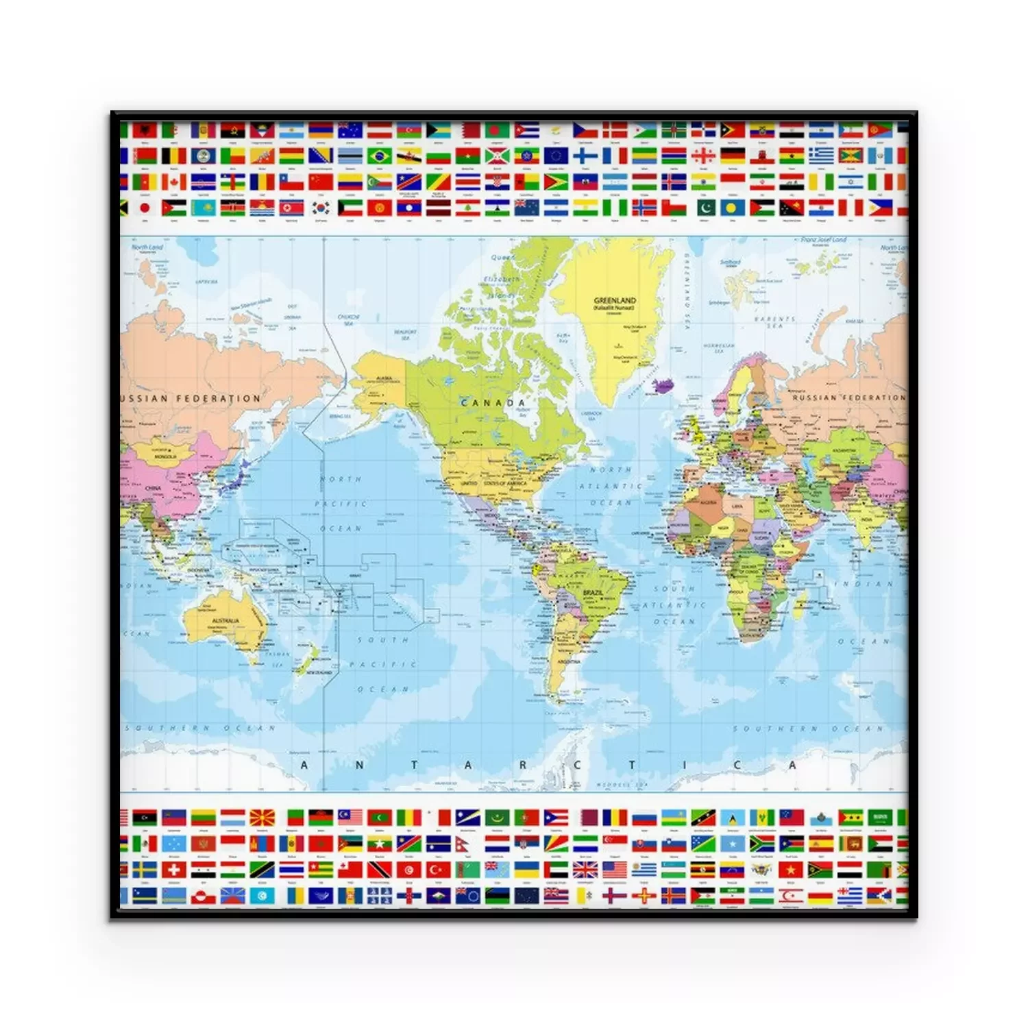 Poster Gecentreerd America Political Map World en All World Country Flags-Bathymetry