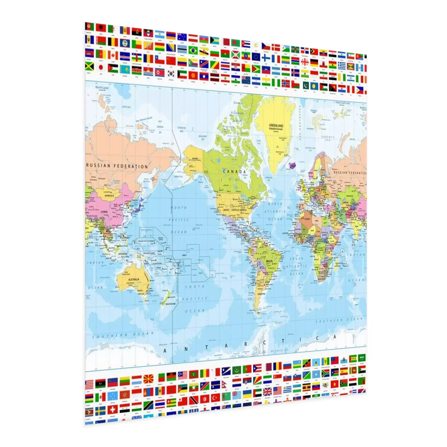Poster: Gecentreerd America Political Map World en All World Country Flags-Bathymetry