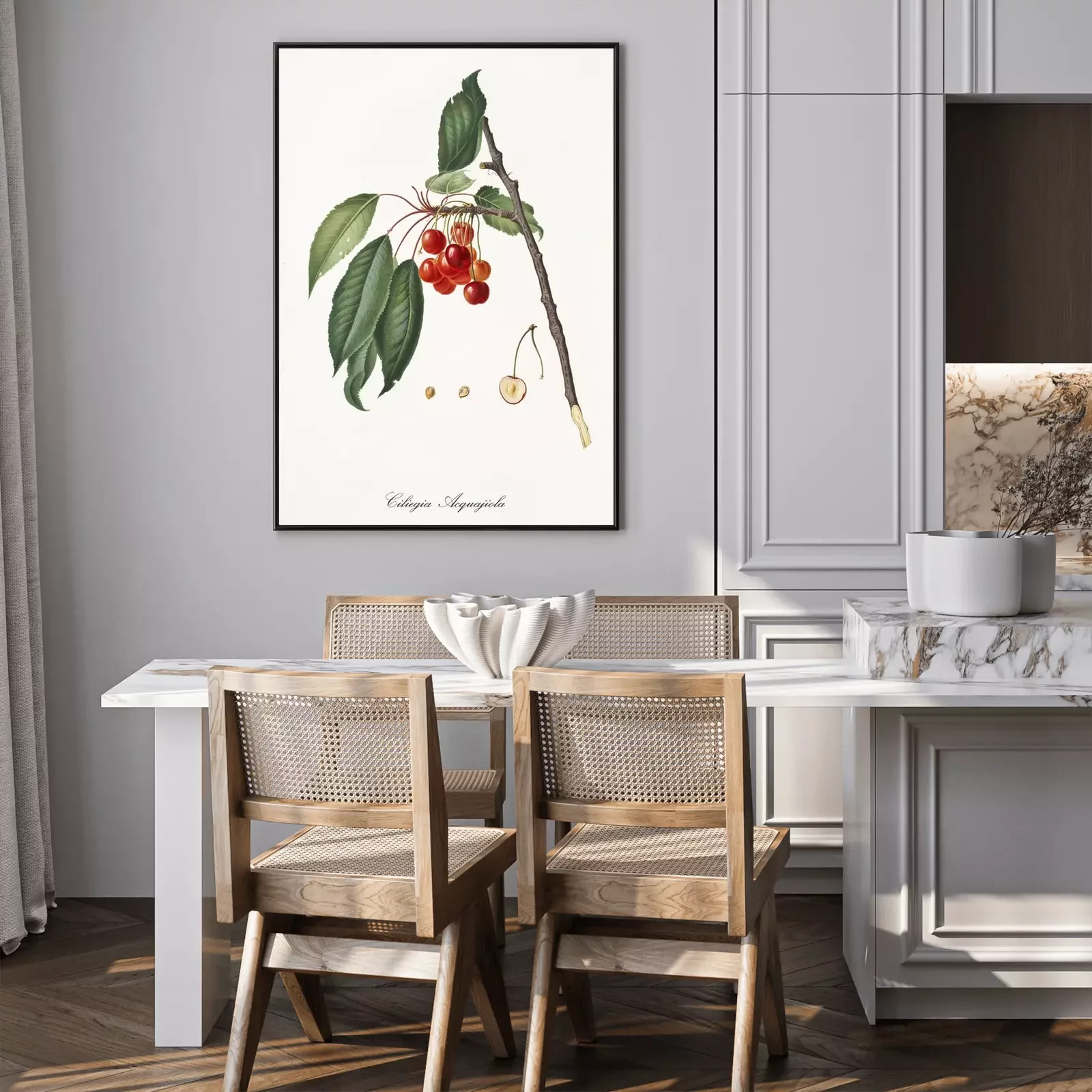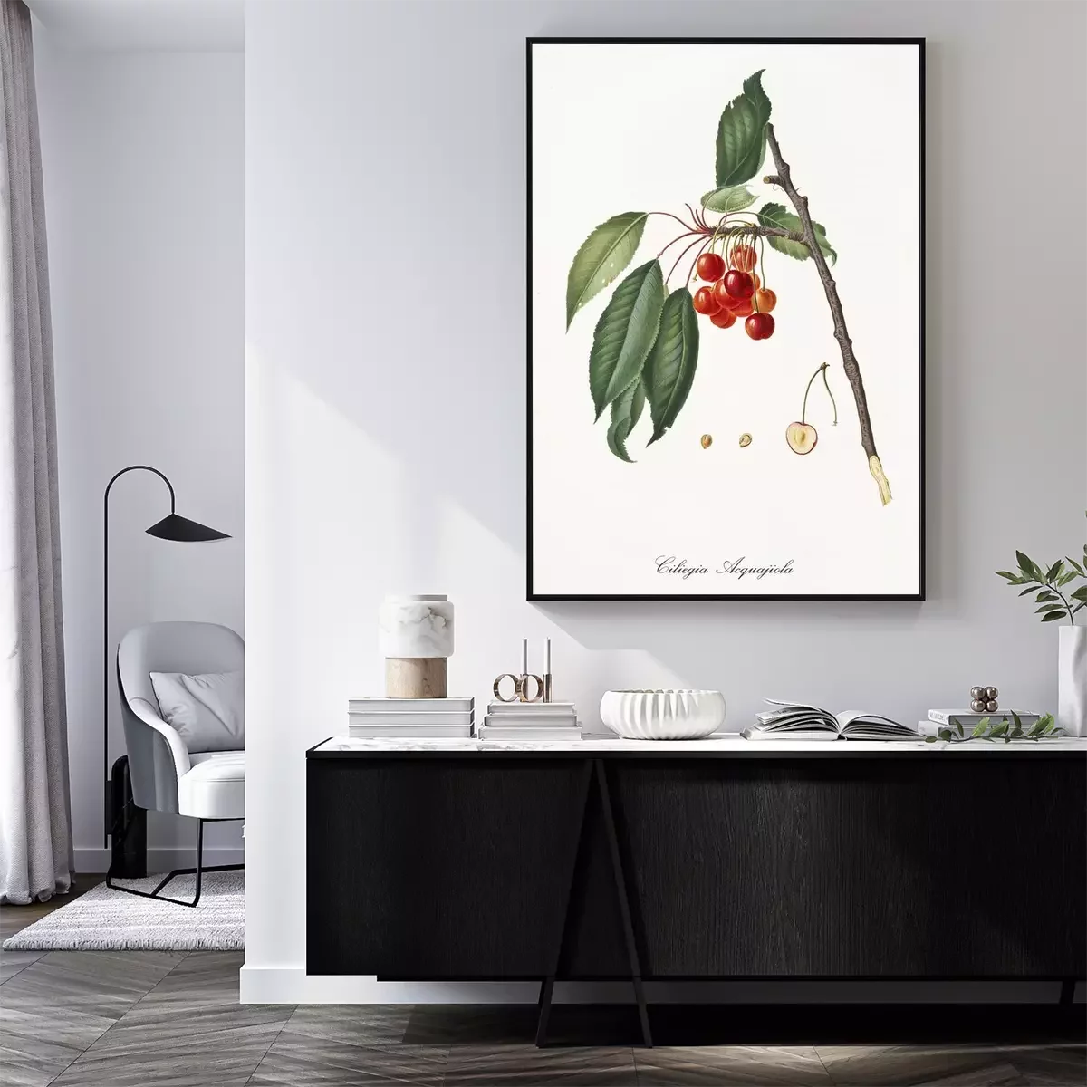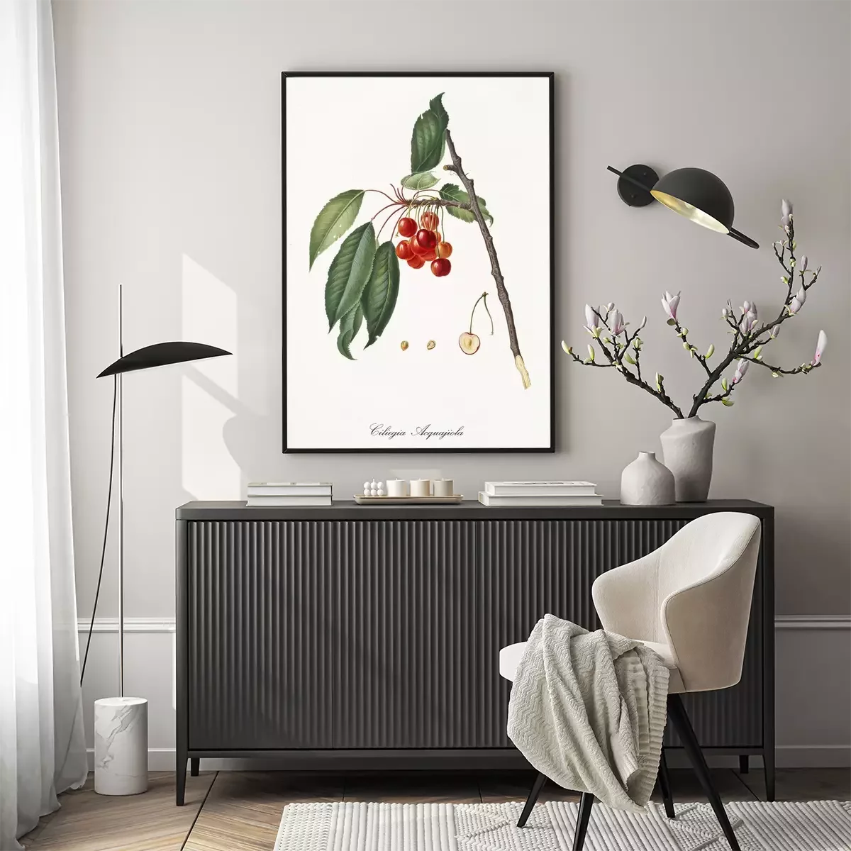 Poster: Geïllustreerd natuurtakje met bungelende kersen