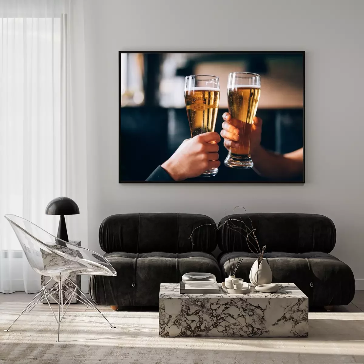 Poster Gejuich. Close-up van twee mannen in shirts roosteren met bier aan de bar