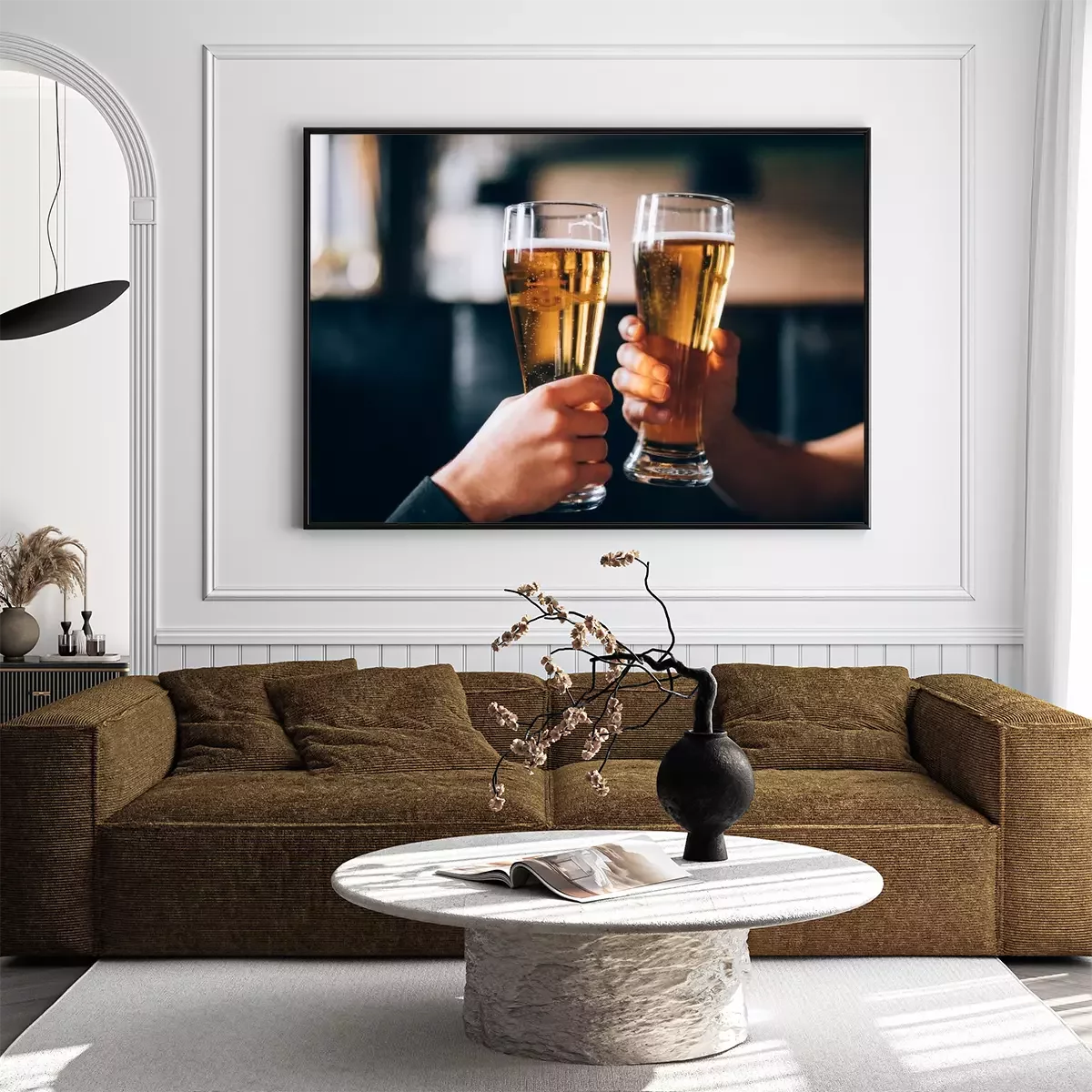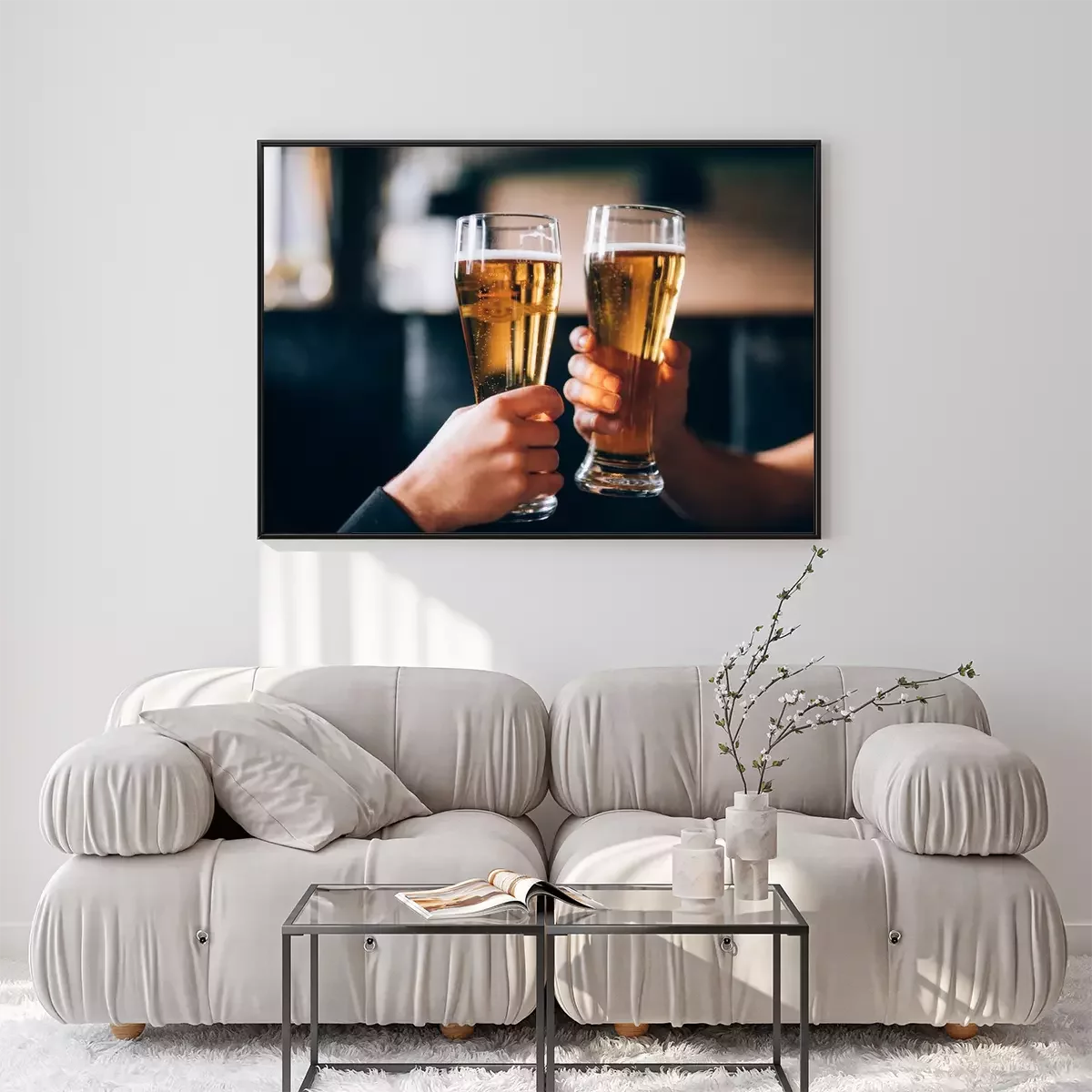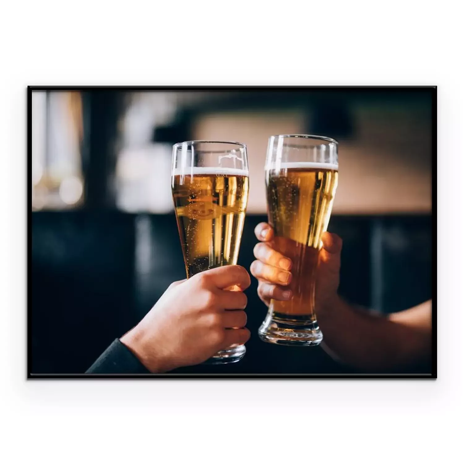 Poster: Gejuich. Close-up van twee mannen in shirts roosteren met bier aan de bar