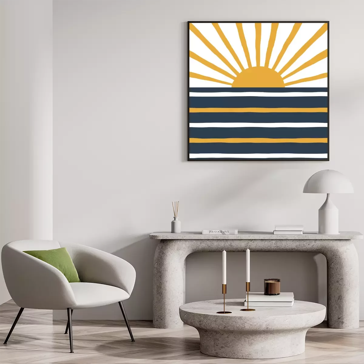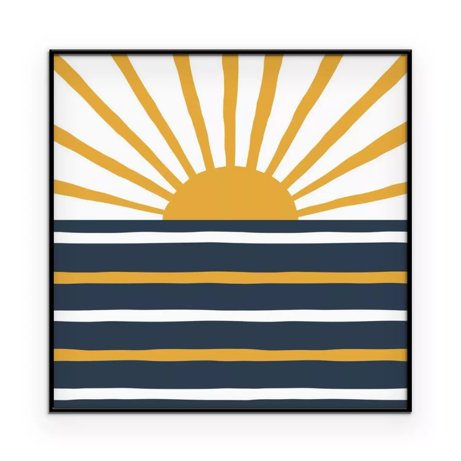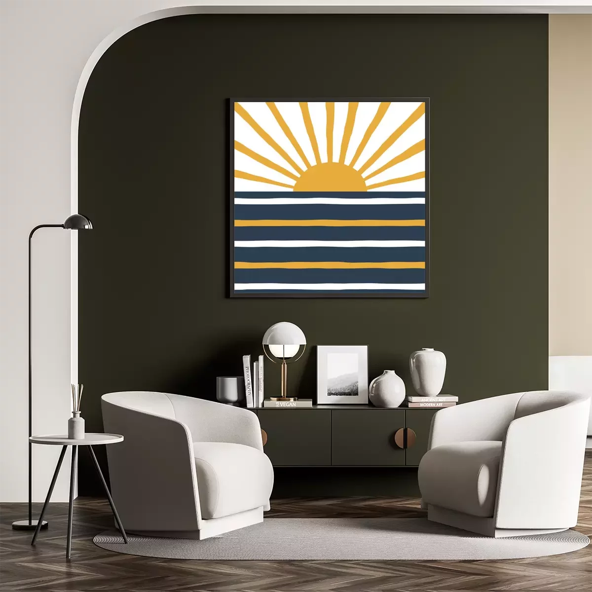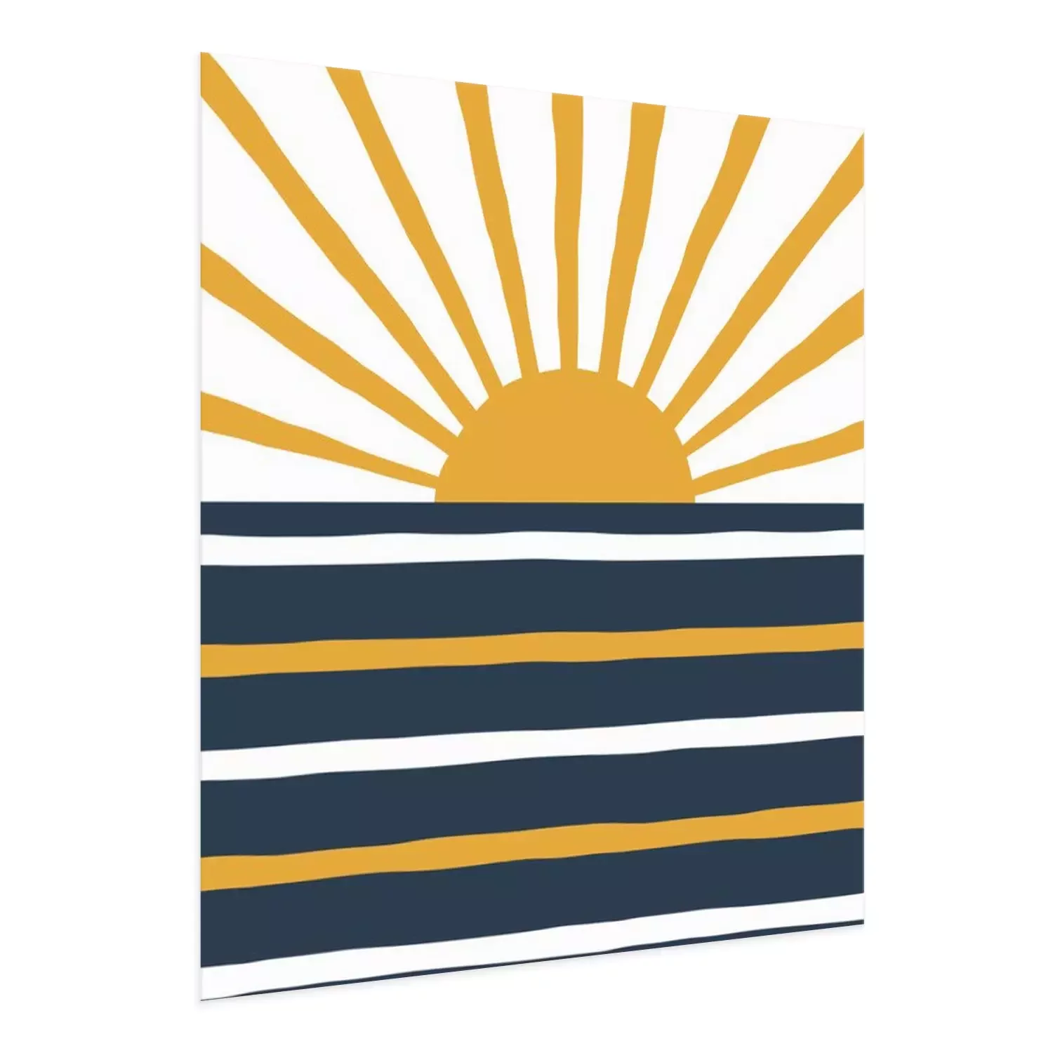 Poster Geometric sunrise and sea simple illustration. Stripy navy blue and yellow solar print in vector. Simple abstract landscape background.