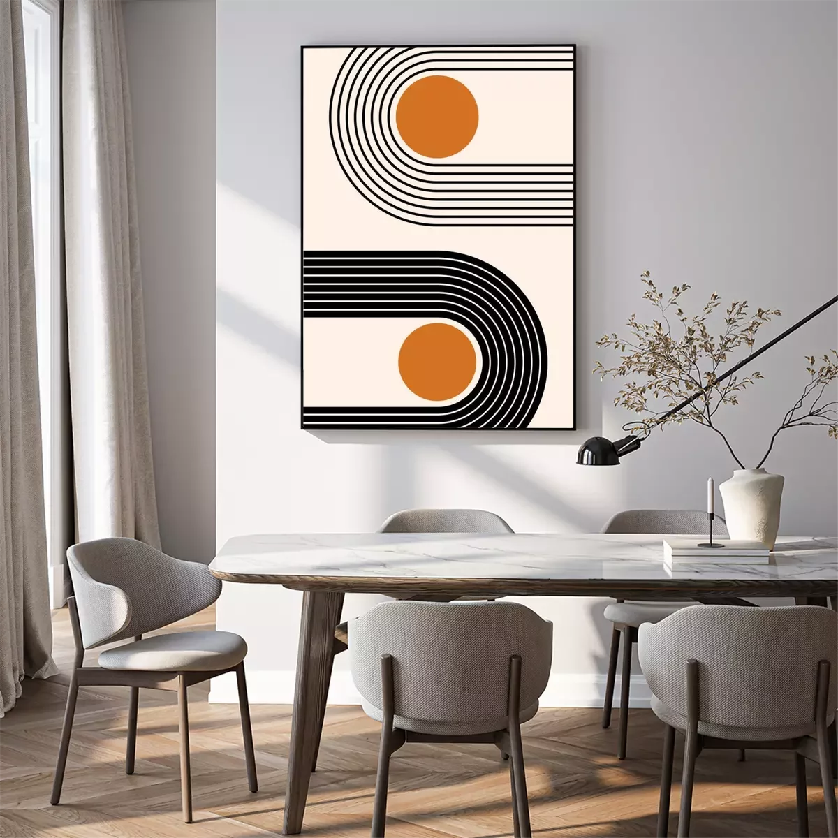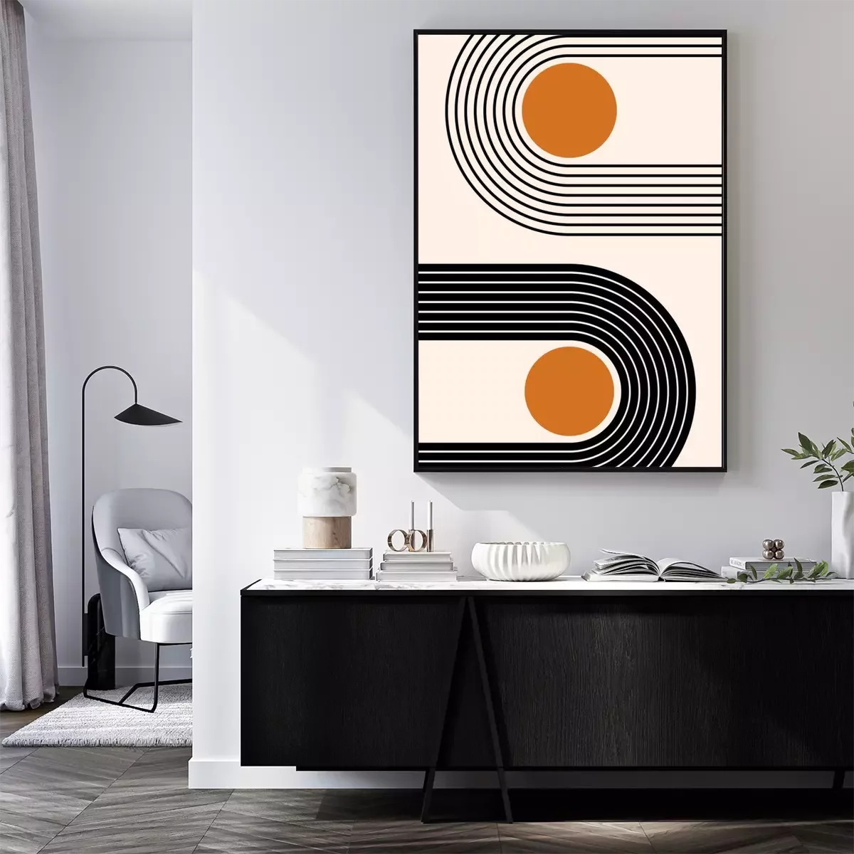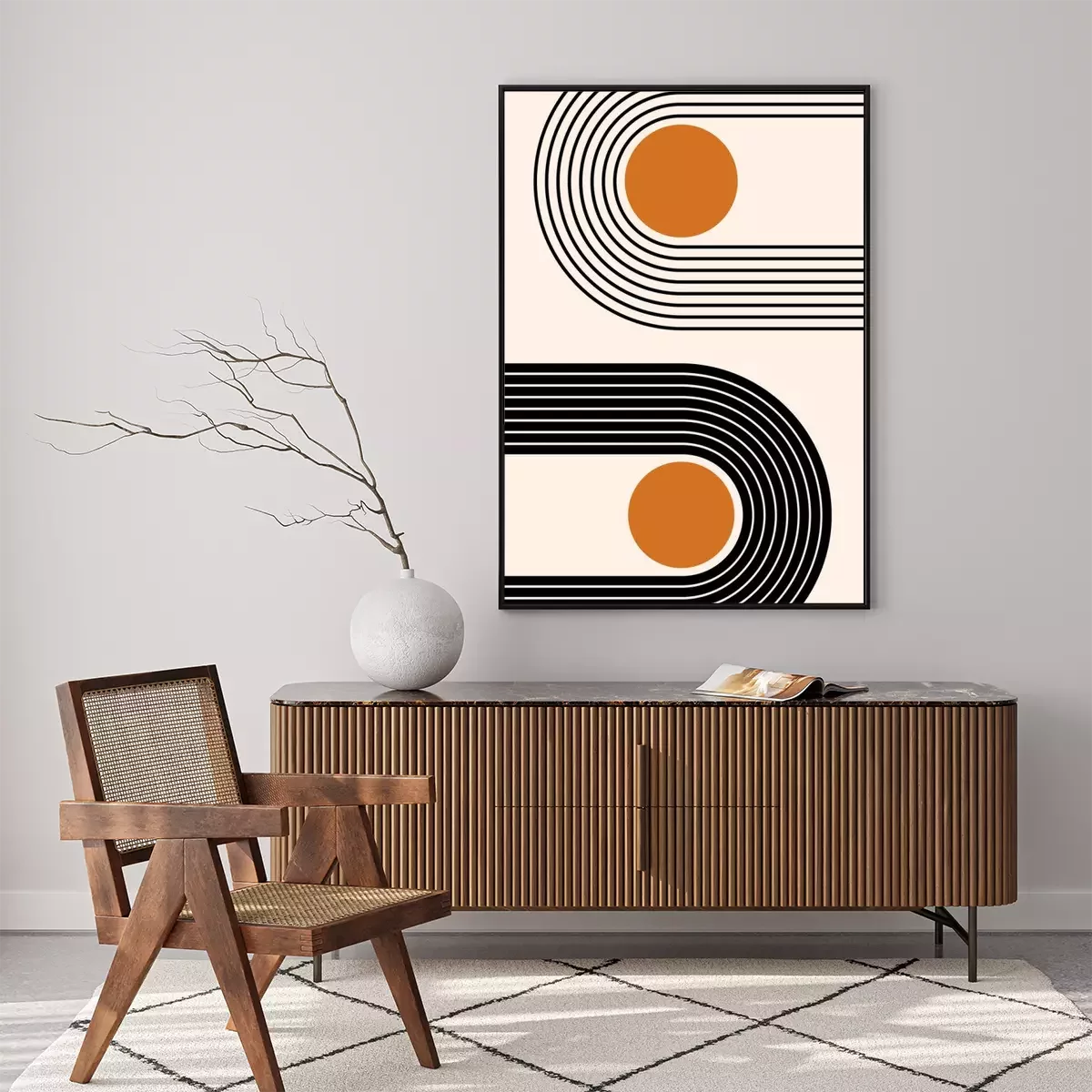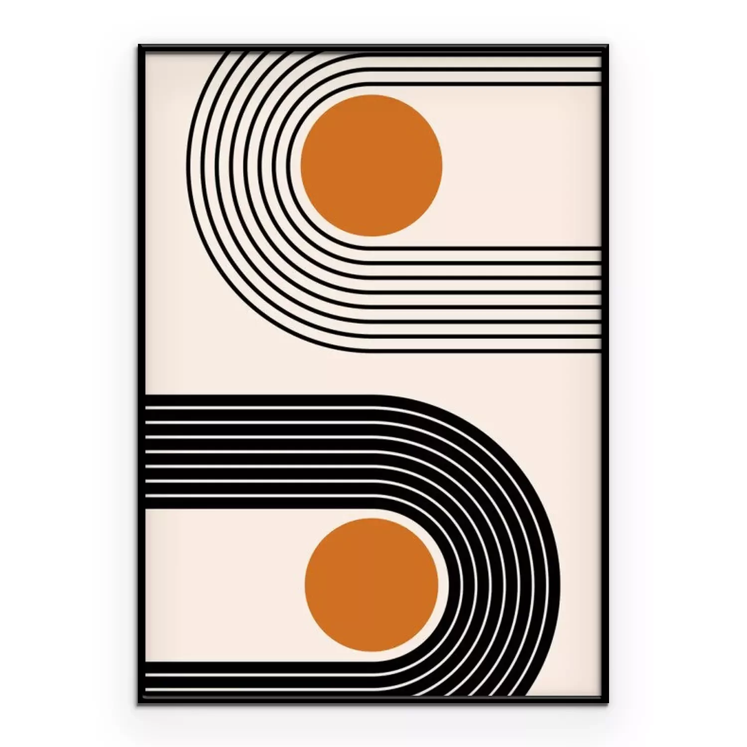 Abstract contemporary aesthetic background with geometric balance shapes, two rainbow and sun circles. Boho wall decor. Mid century modern minimalist print. Neutral Geometric art. Organic shape.