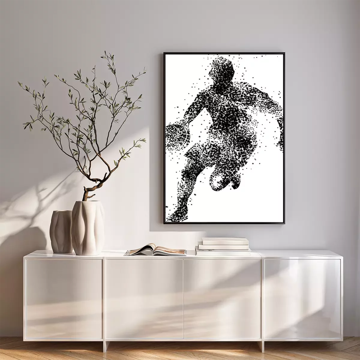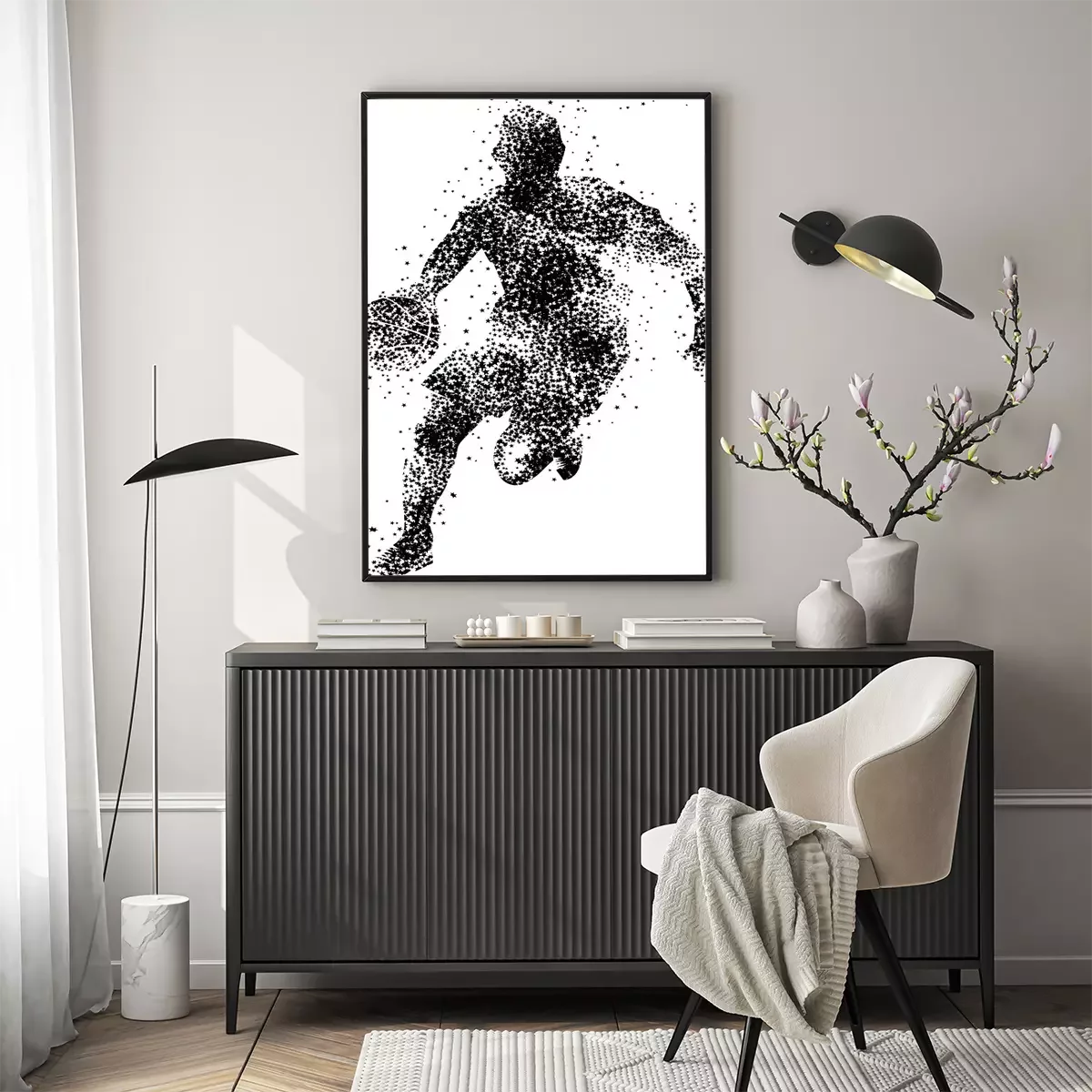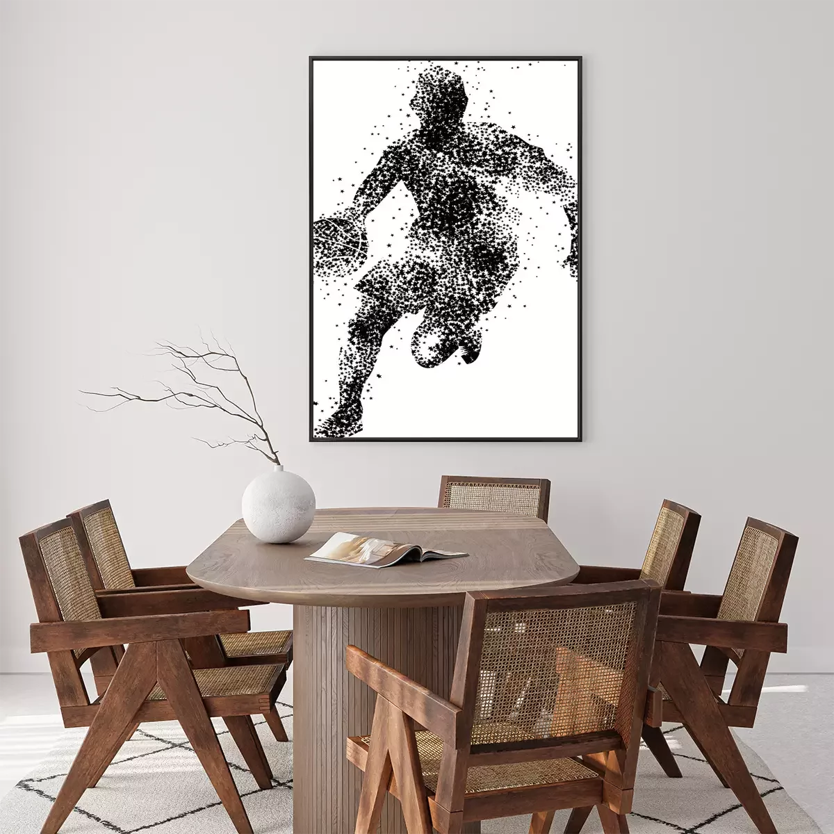 Poster: Gestippeld silhouet van een basketballer met een bal