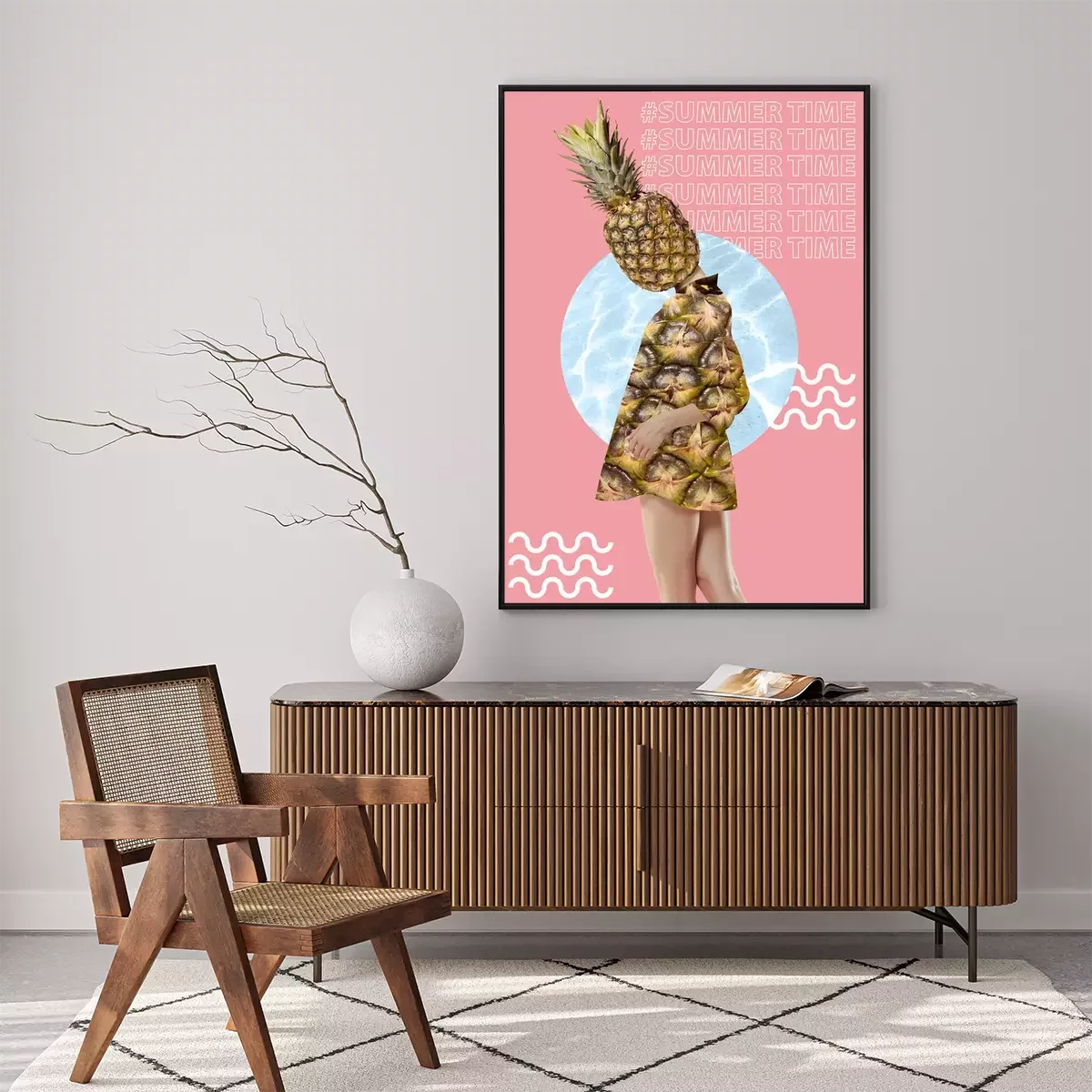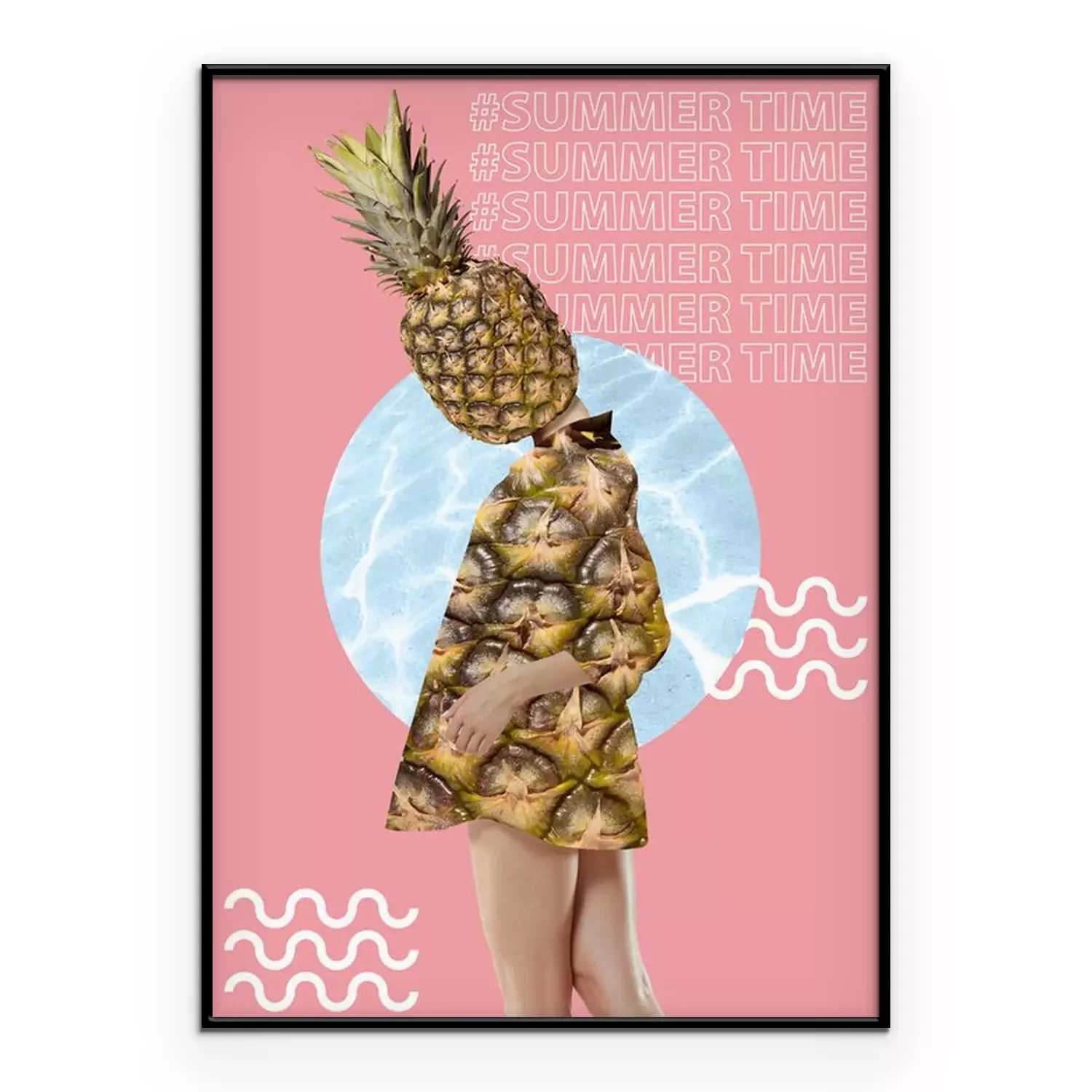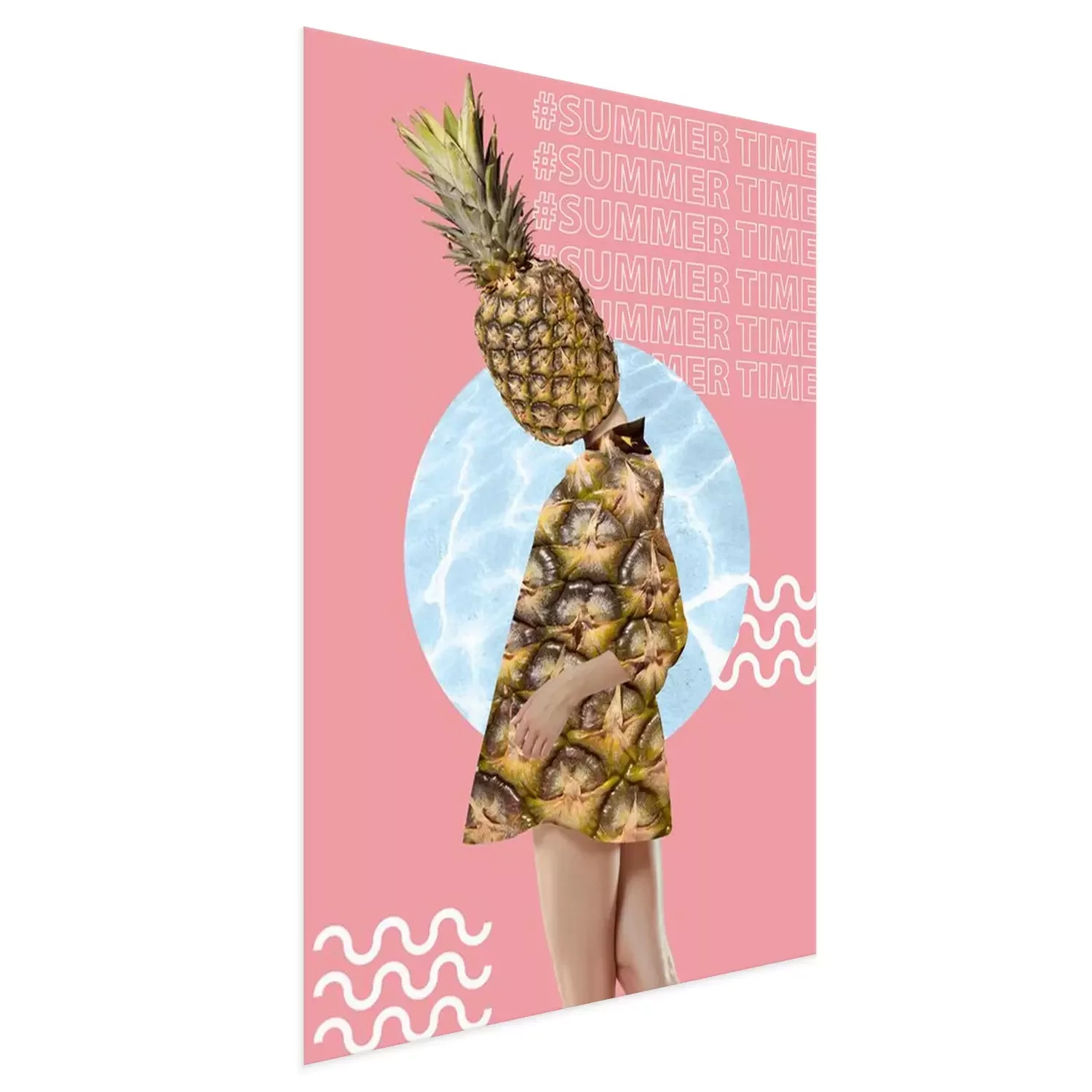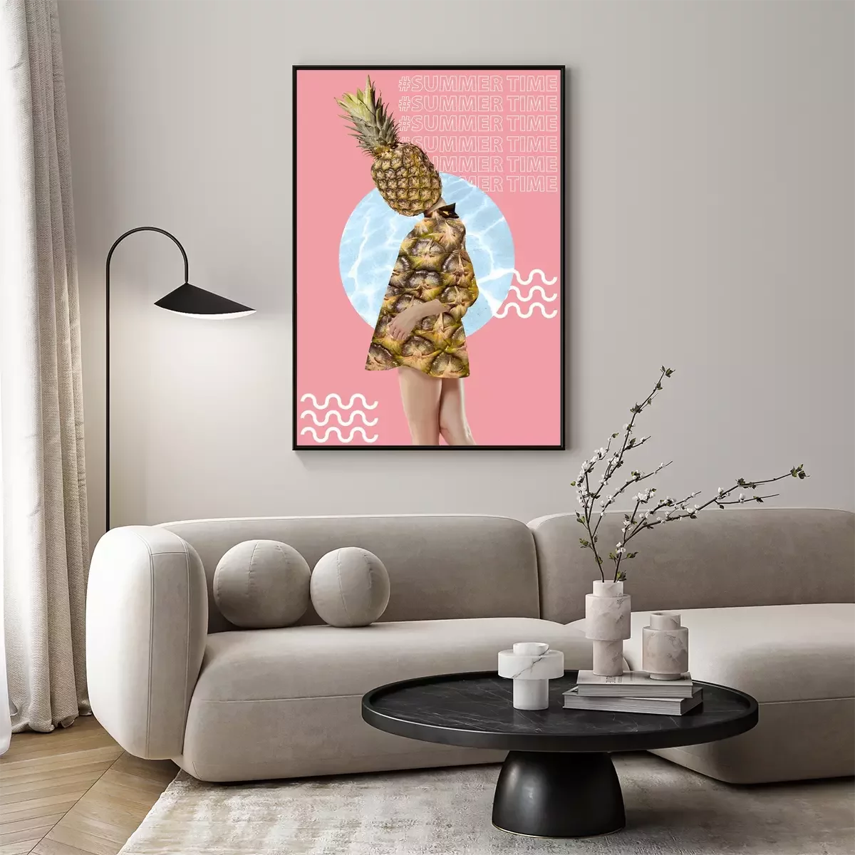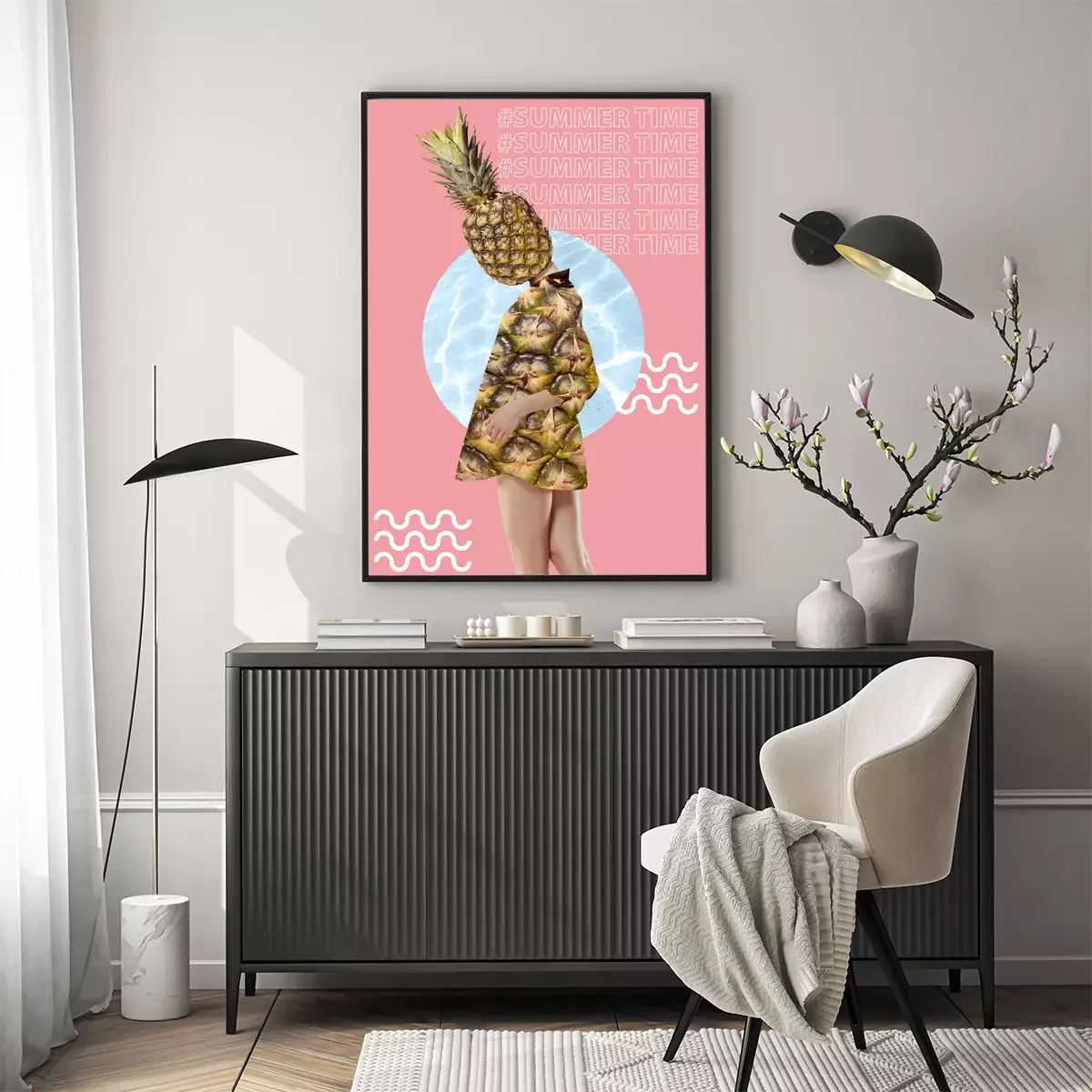 Poster: Girl with pineapple head. Contemporary modern art collage. Summer time, holiday, party, sea concept