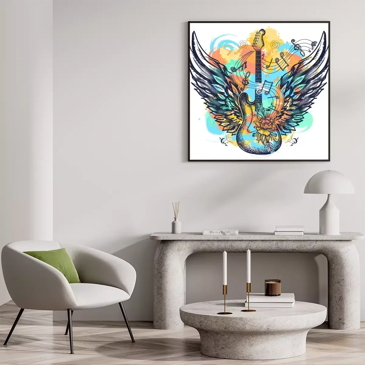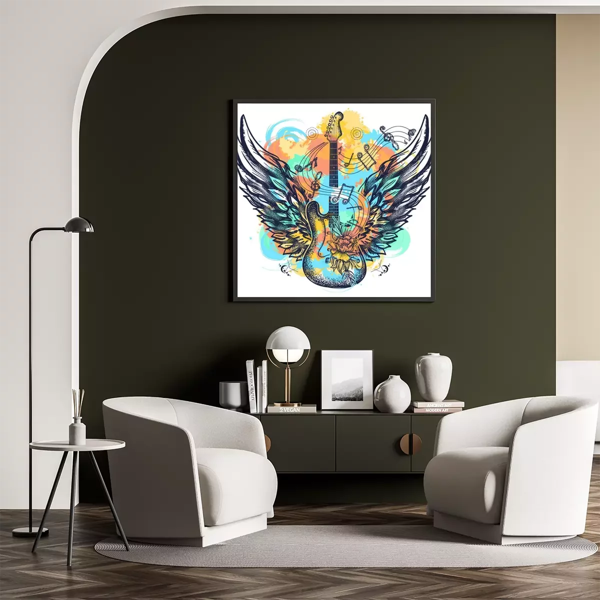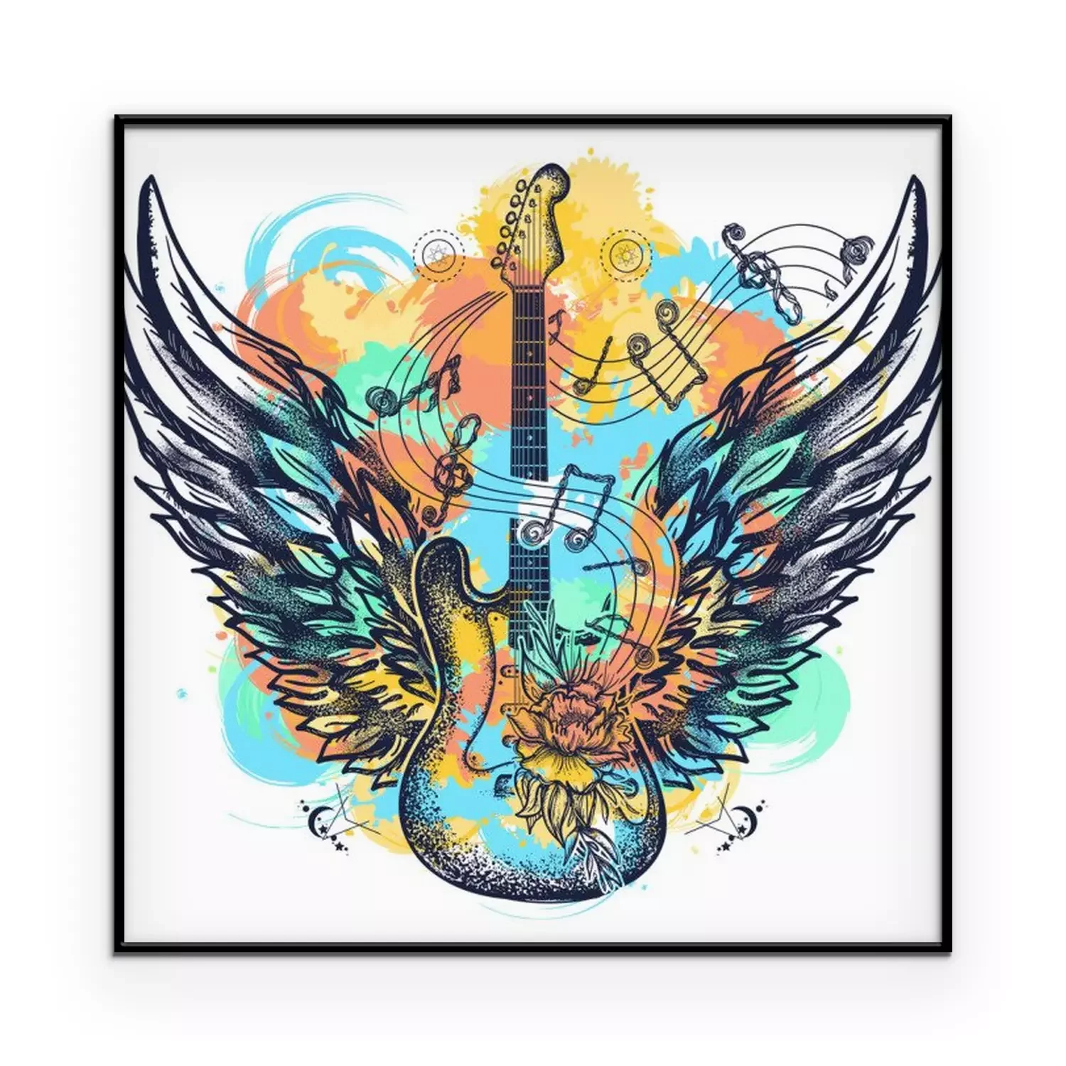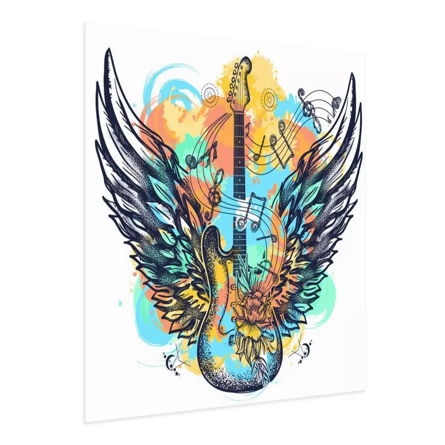 Poster: Gitaar en vleugels tatoeage aquarel spatten stijl. Rock-'n-roll t-shirtontwerp. Symbool van muziek, muziekfestivals. Elektrische gitaarkunst