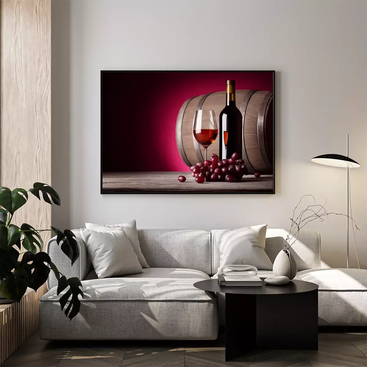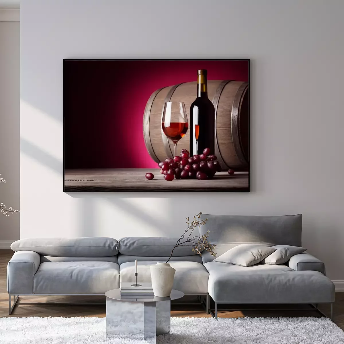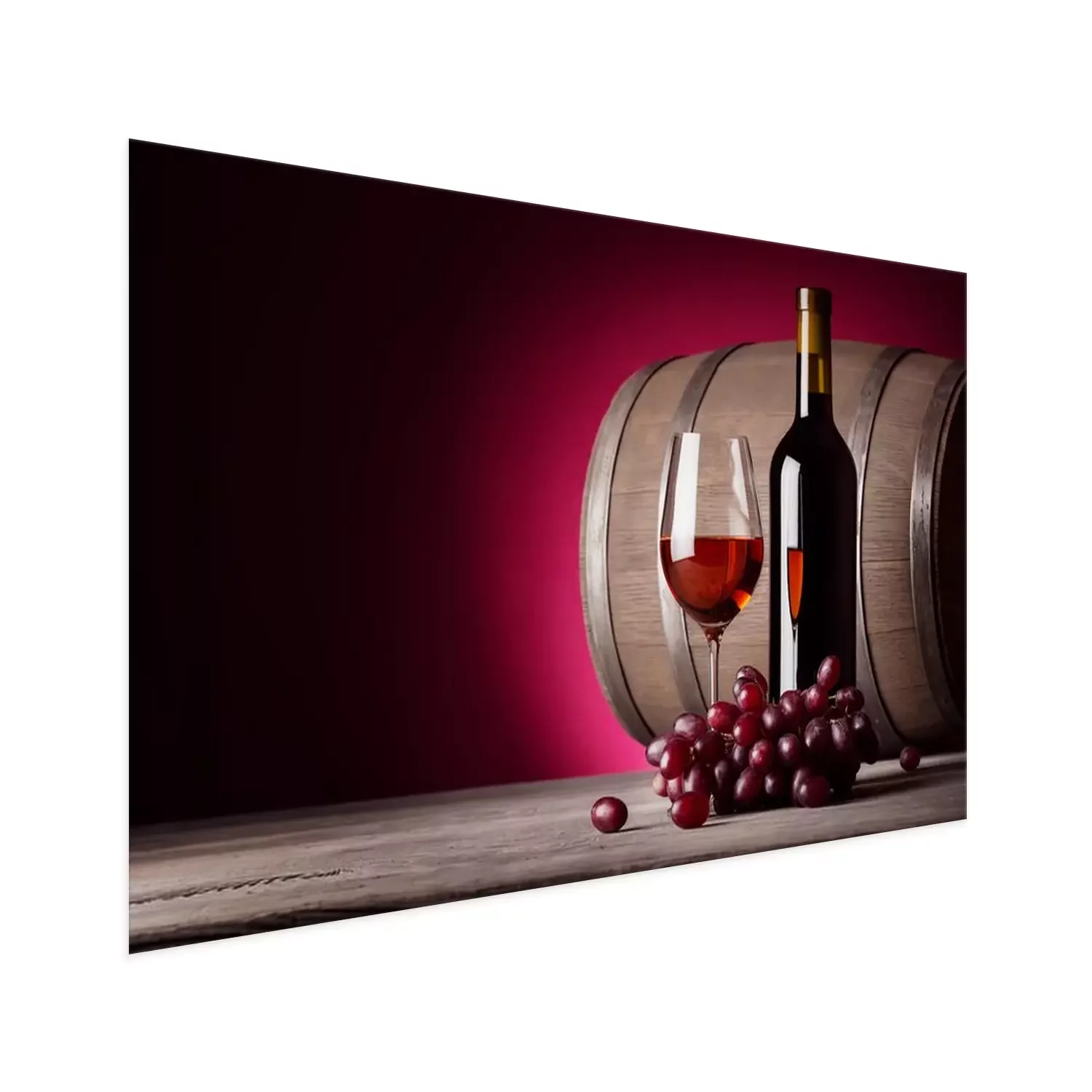 Poster: Glas rode wijn met fles en druiven
