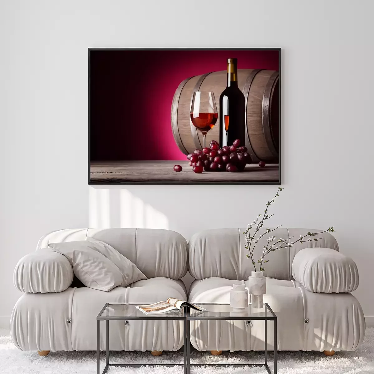 Poster Glas rode wijn met fles en druiven