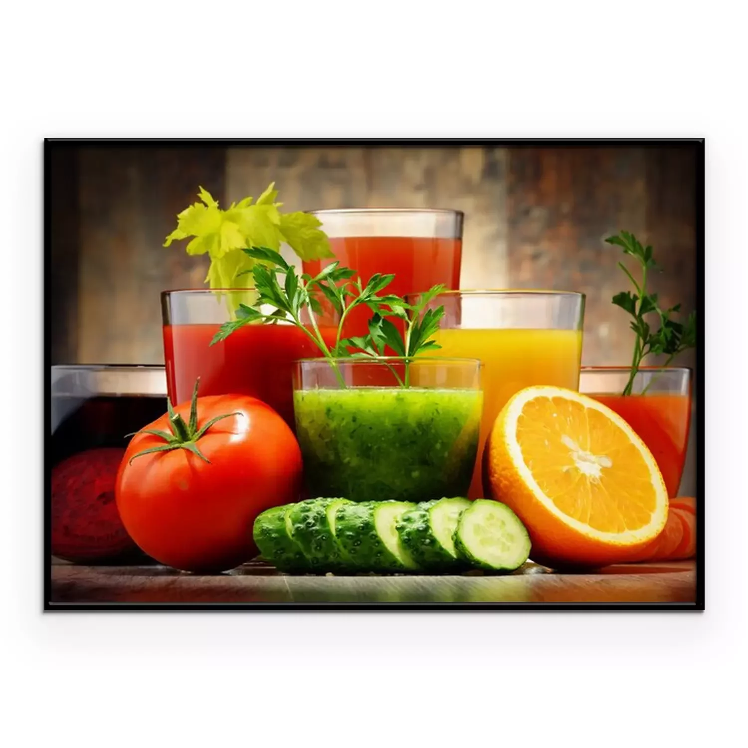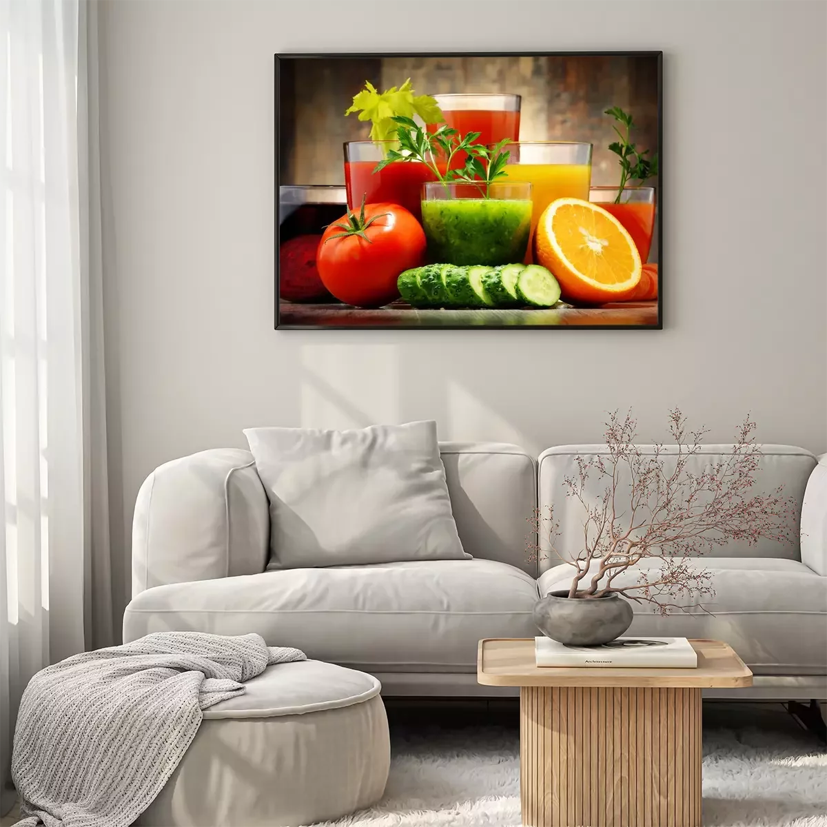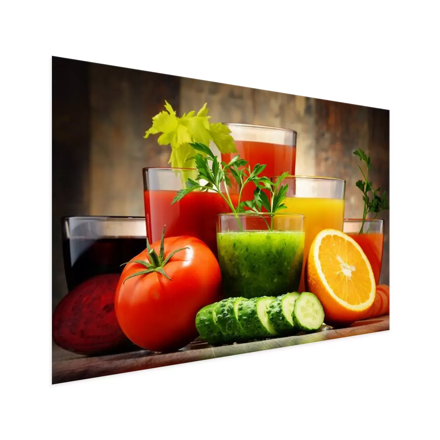 Poster: Glazen met verse biologische groenten en vruchtensappen