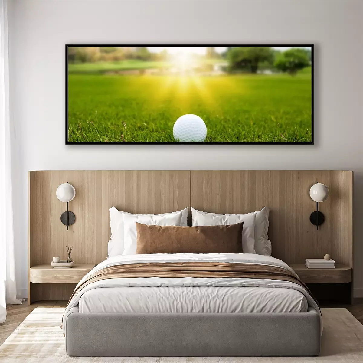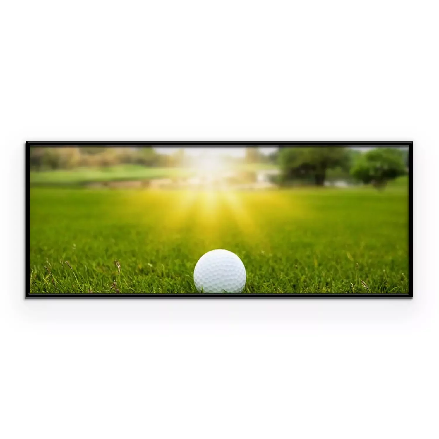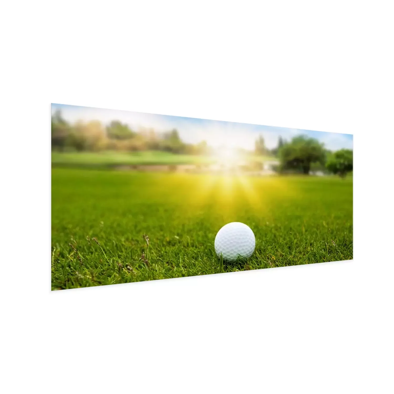 Poster: Golf ball on green grass on blurred beautiful landscape of golf course with sunrise,sunset time on background.