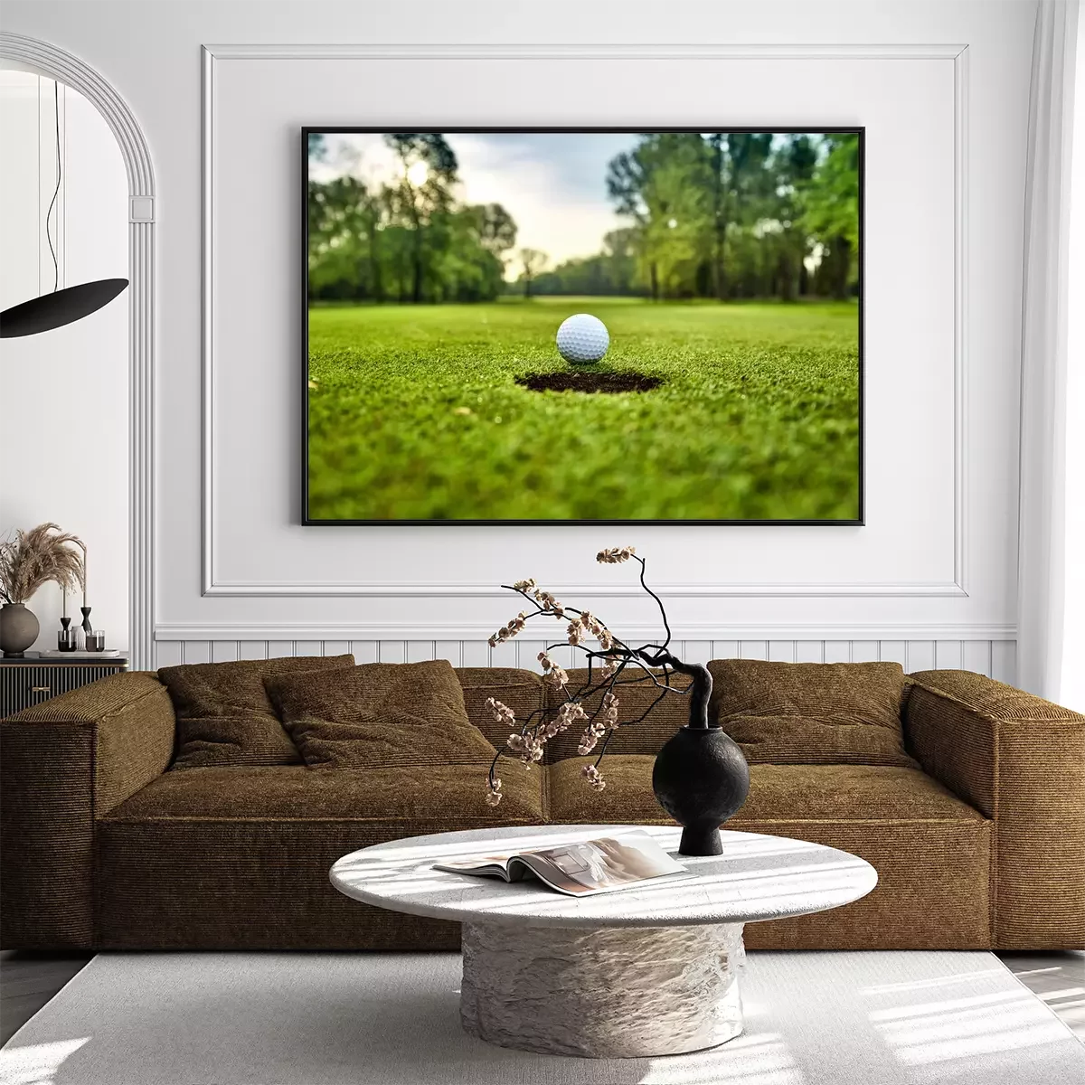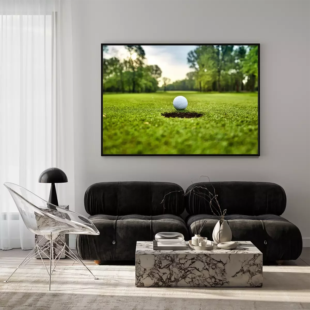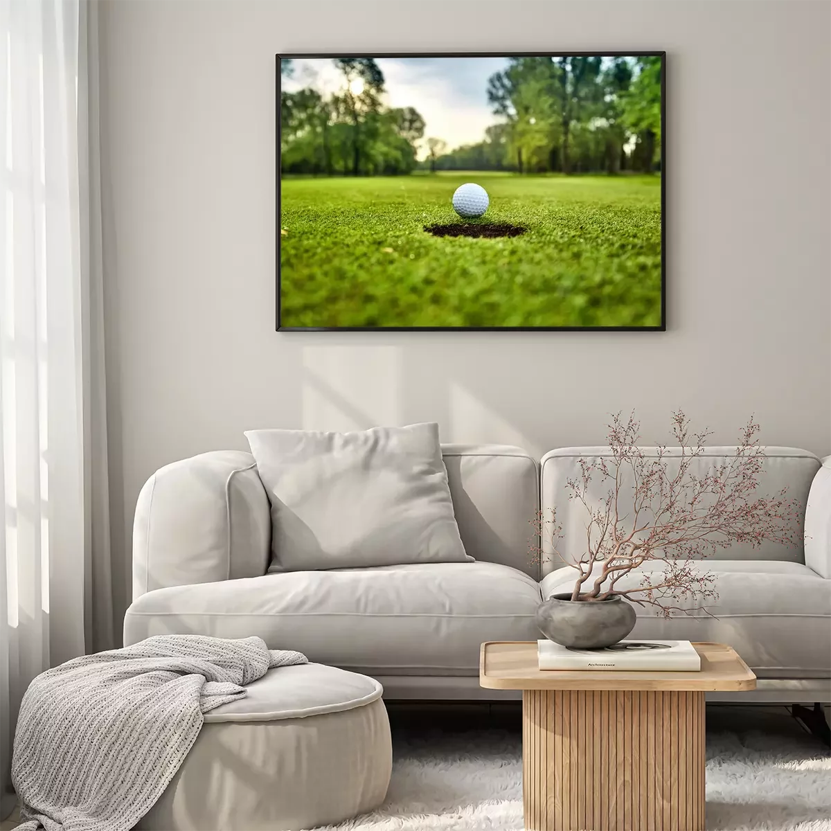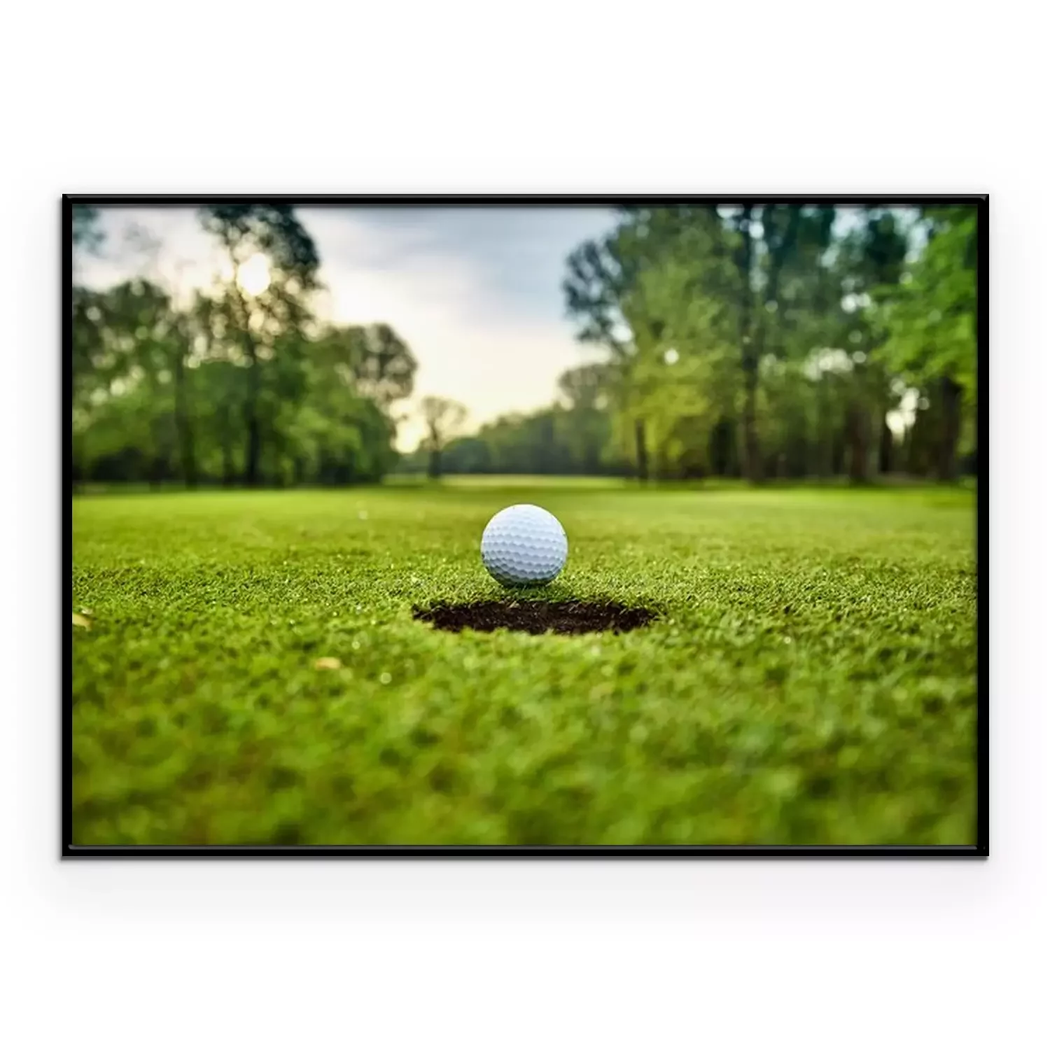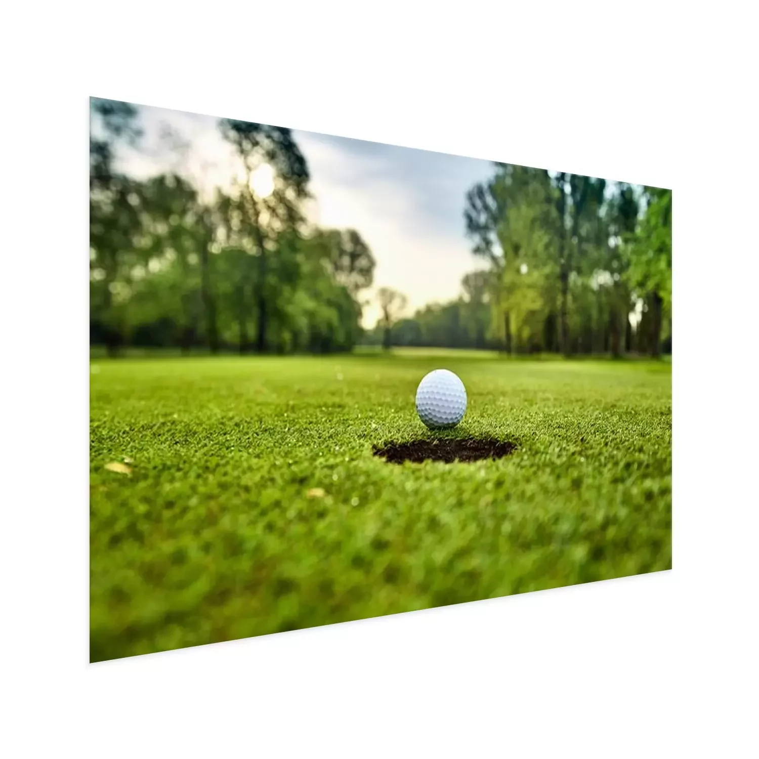 Poster: Golfbal op het groen. Golfbal op de kop van de kop