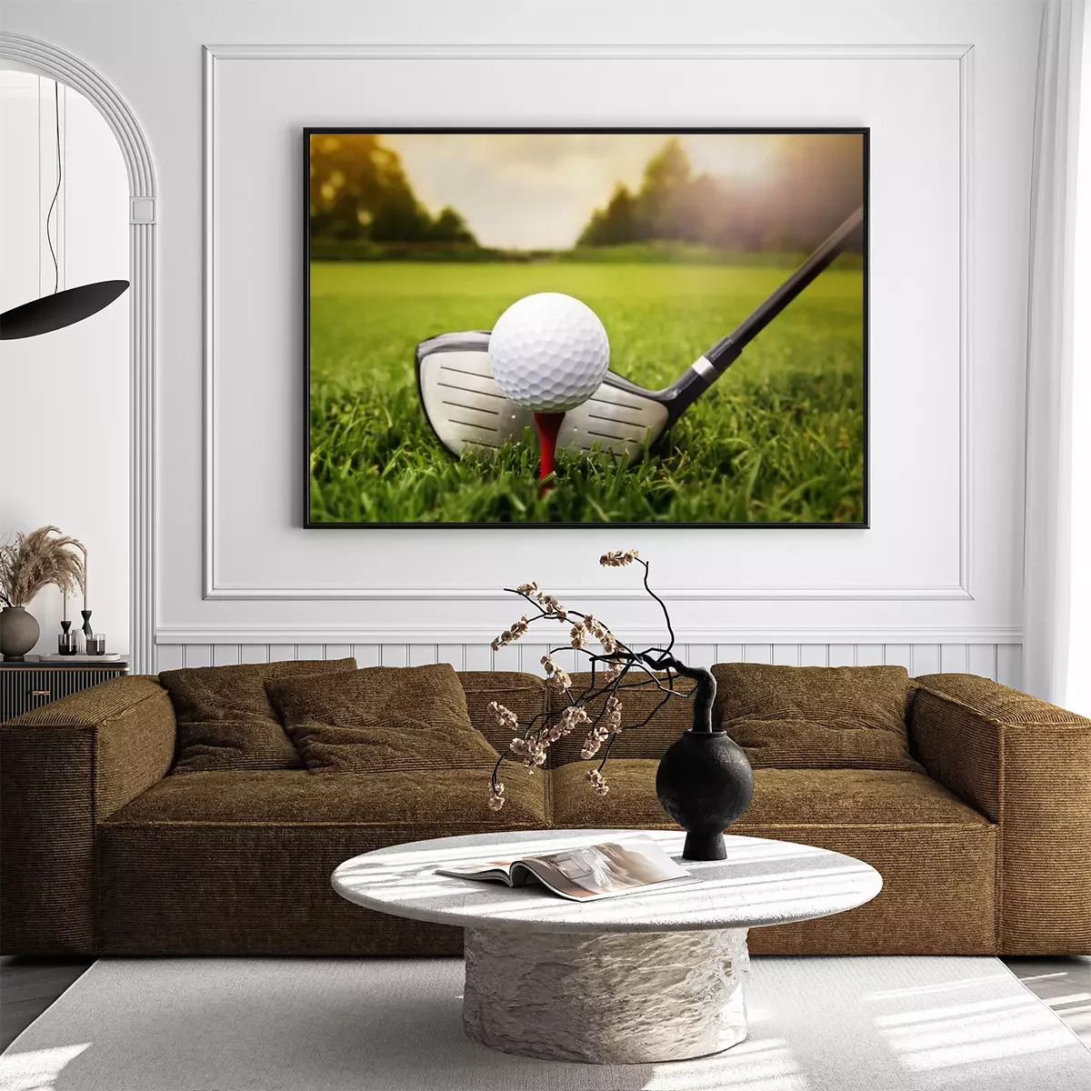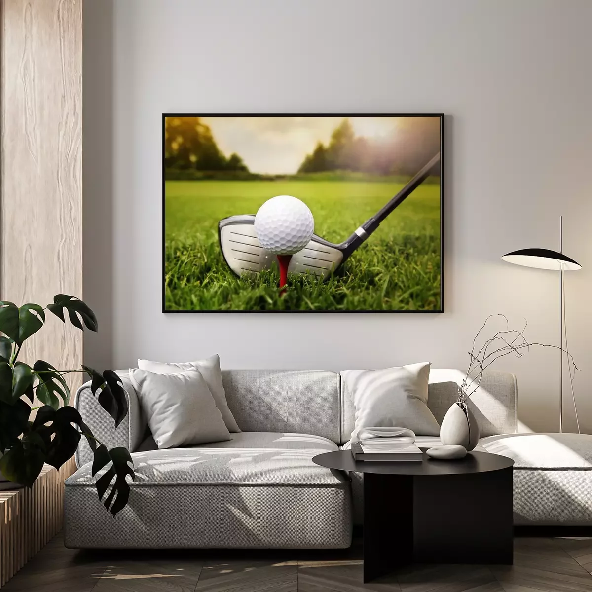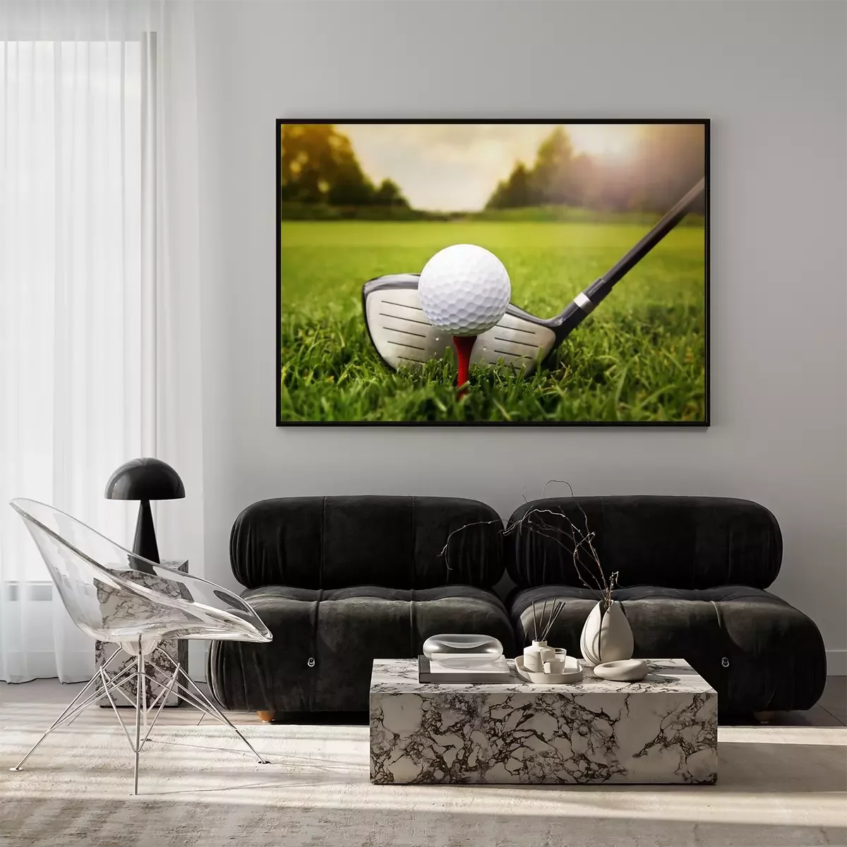 Poster: Golfclub en de bal in het gras