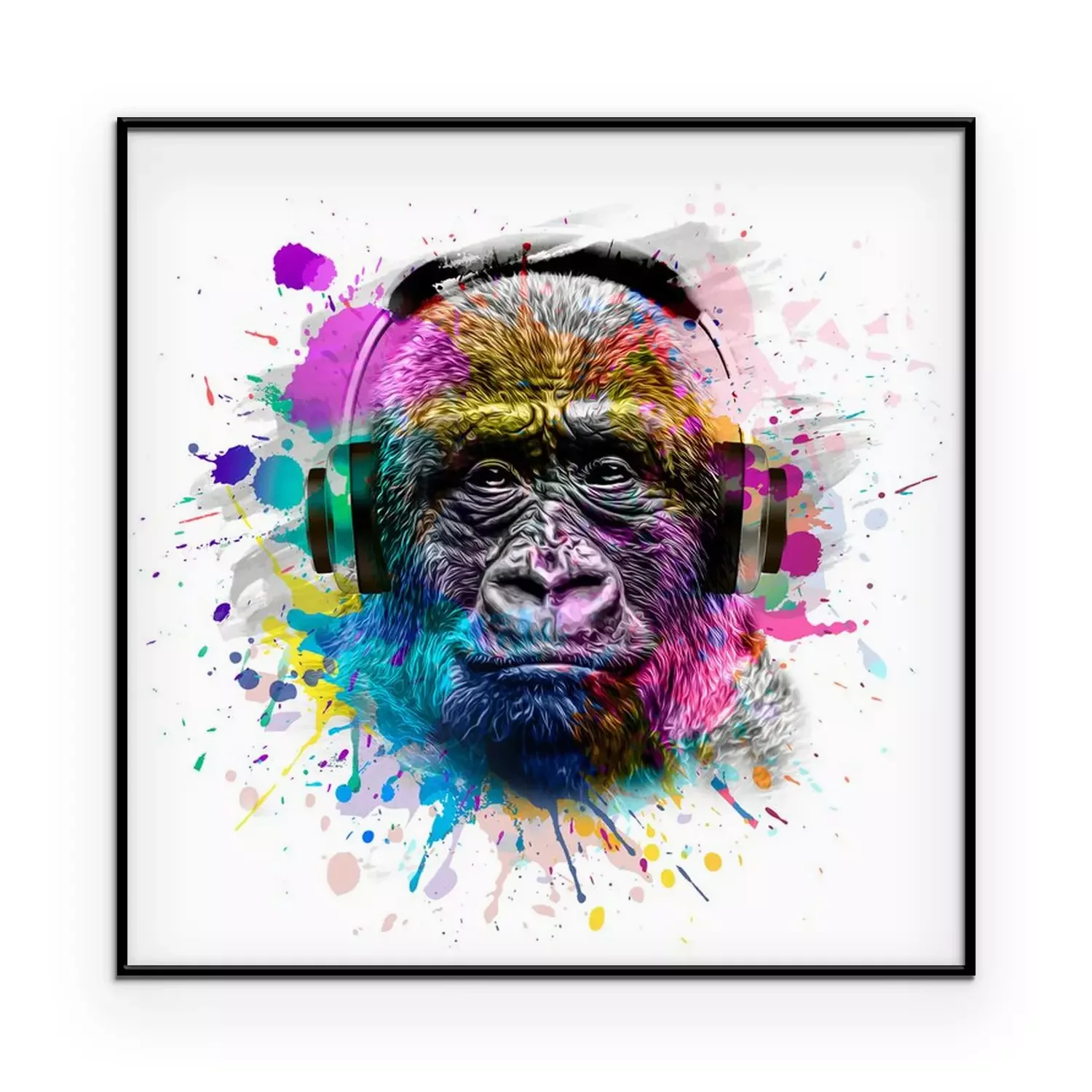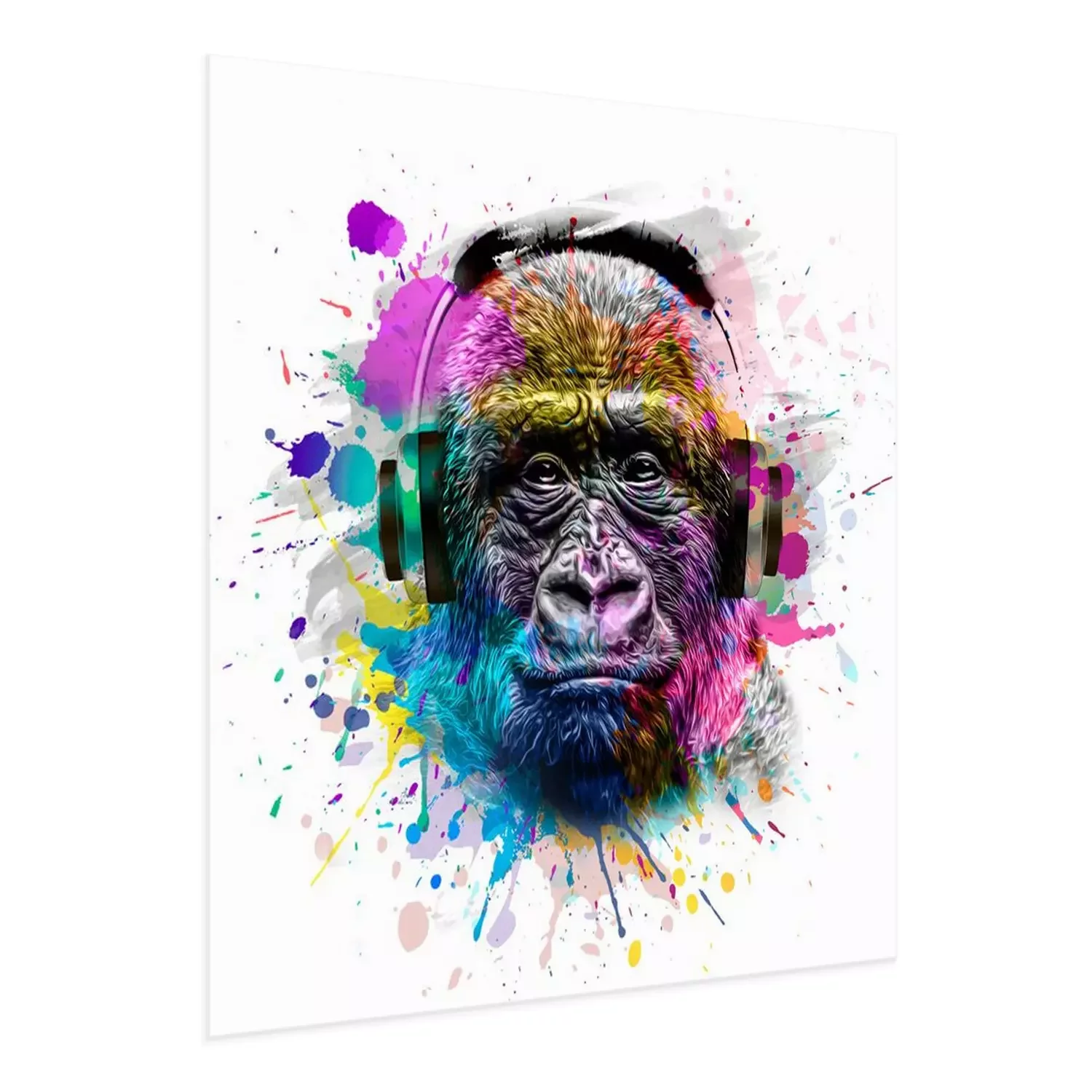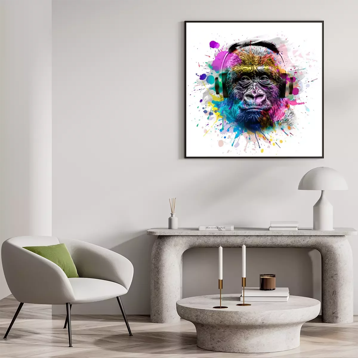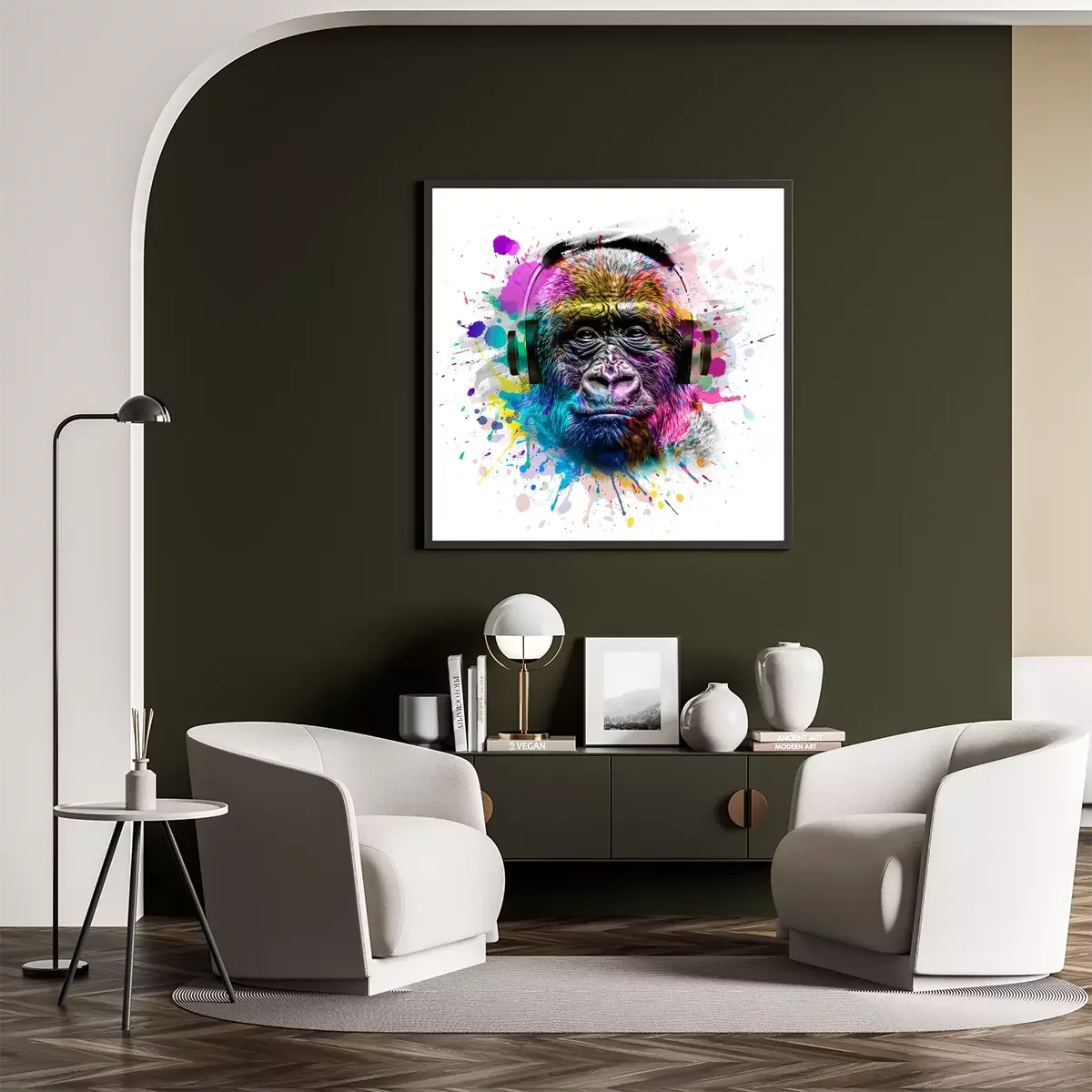 Poster: gorilla monkey head with eyeglasses and headphones with creative colorful abstract elements on dark background
