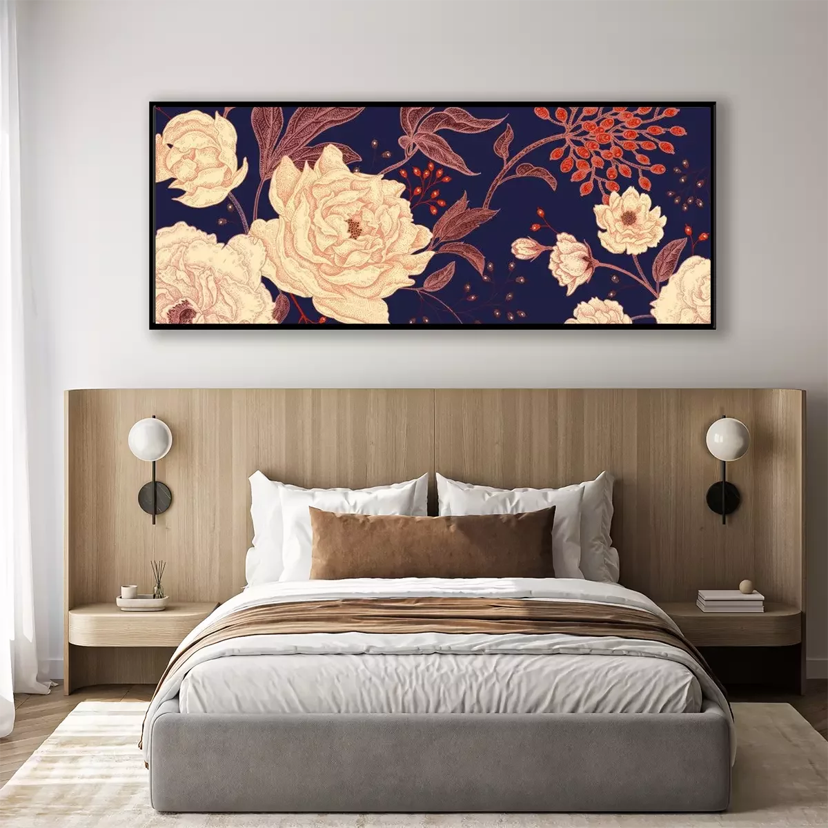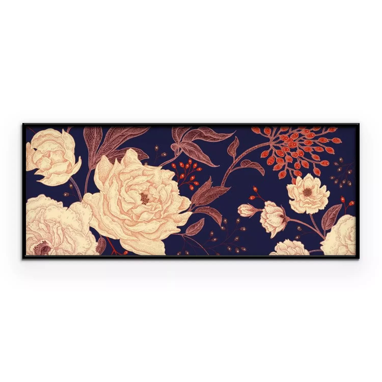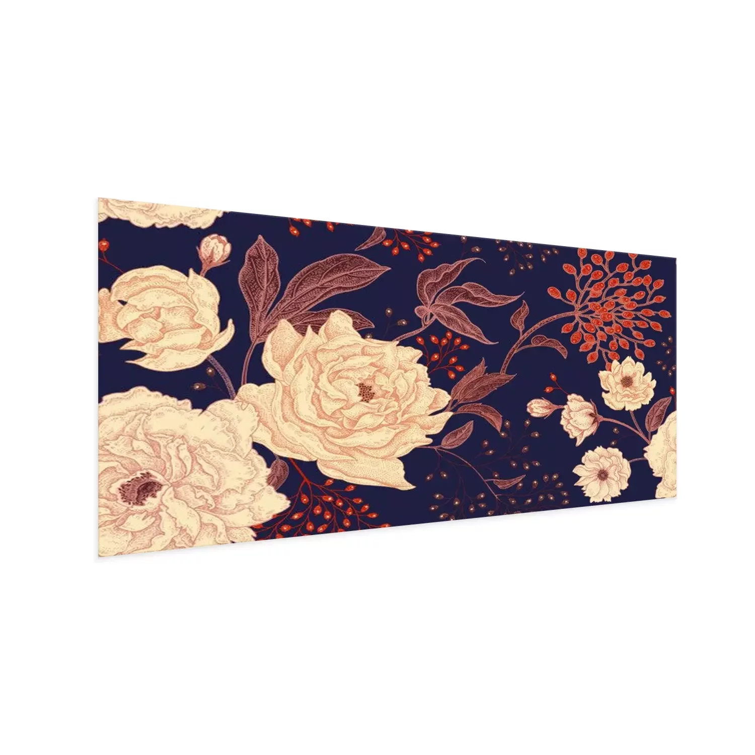 Poster: Gouden pioenrozen en twijgen met rode ballen