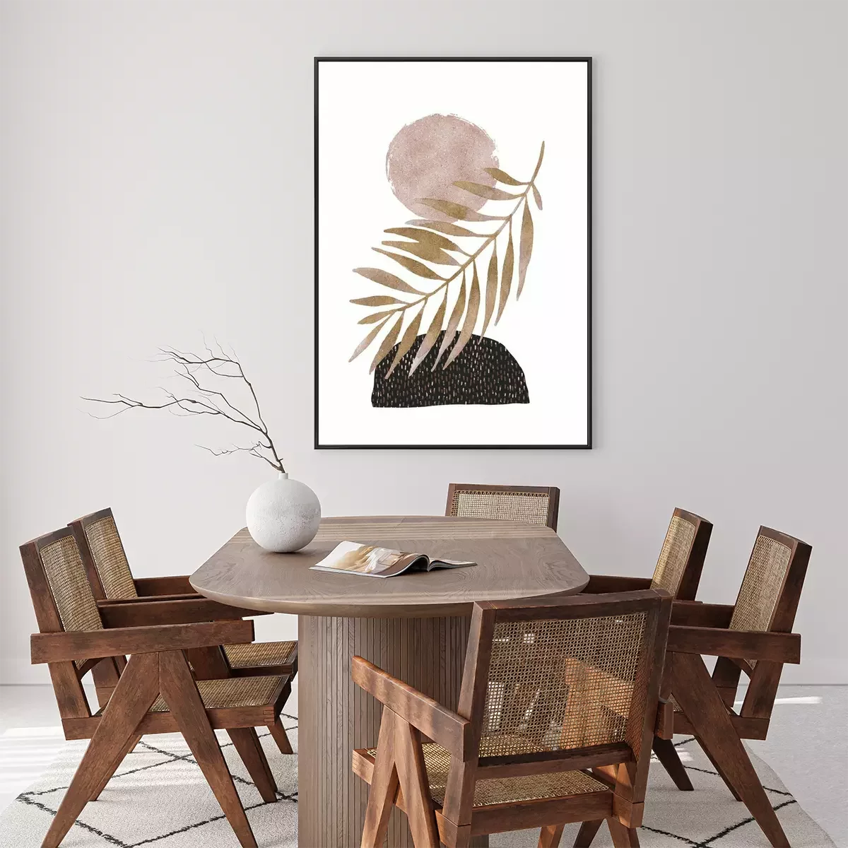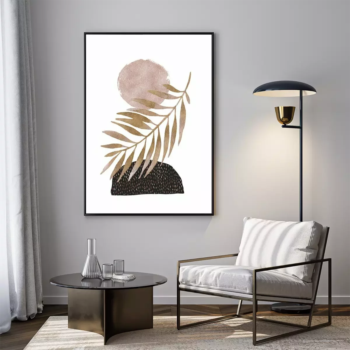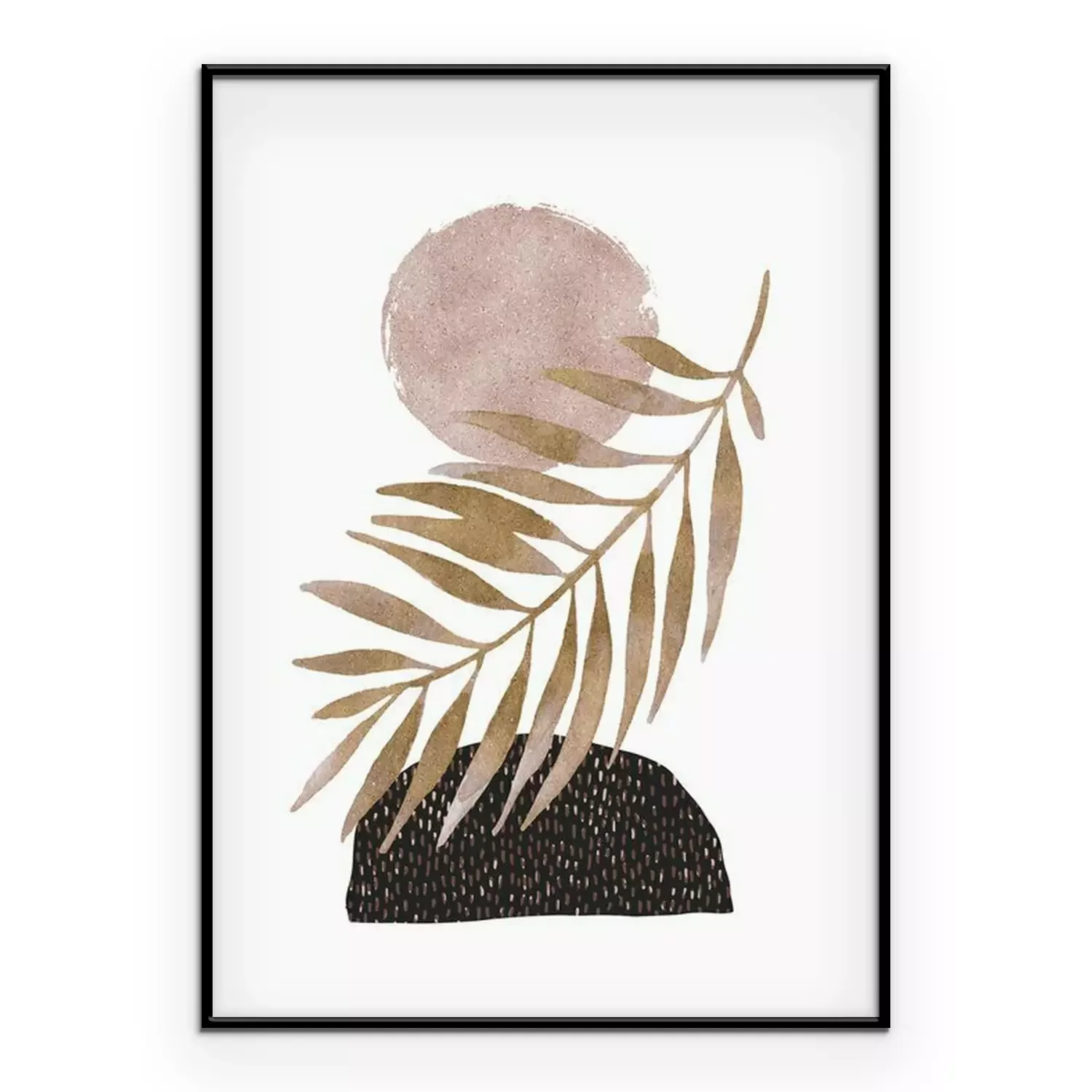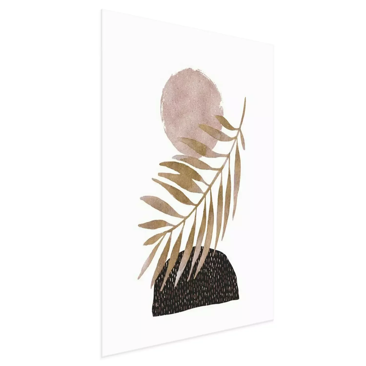 Abstract poster design: minimal shapes, glossy golden tropical leaf.