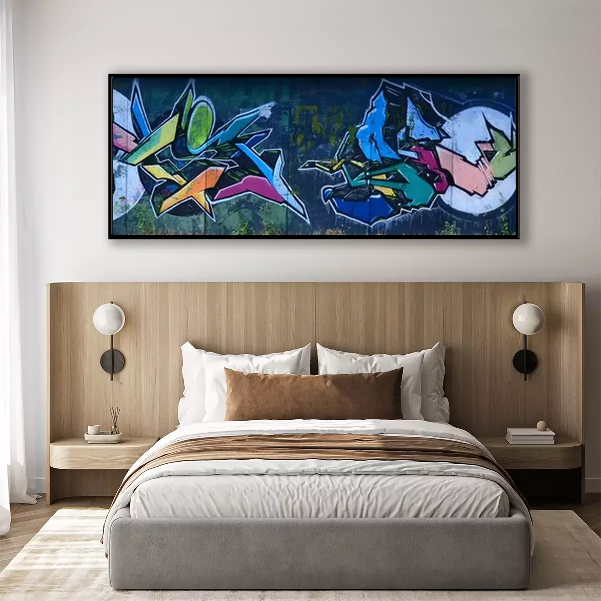 Kunst ondergronds. Prachtige straatkunstgraffiti stijl. De muur is versierd met abstracte tekeningen huisverf. Moderne iconische stedelijke cultuur van straat jeugd. Abstracte stijlvolle foto op de mu