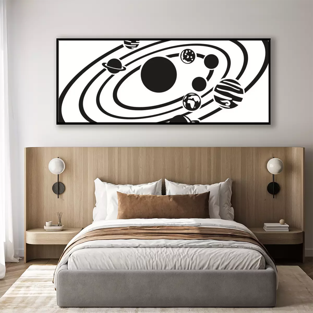 Poster: Grafisch zonnestelsel in zwart-wit