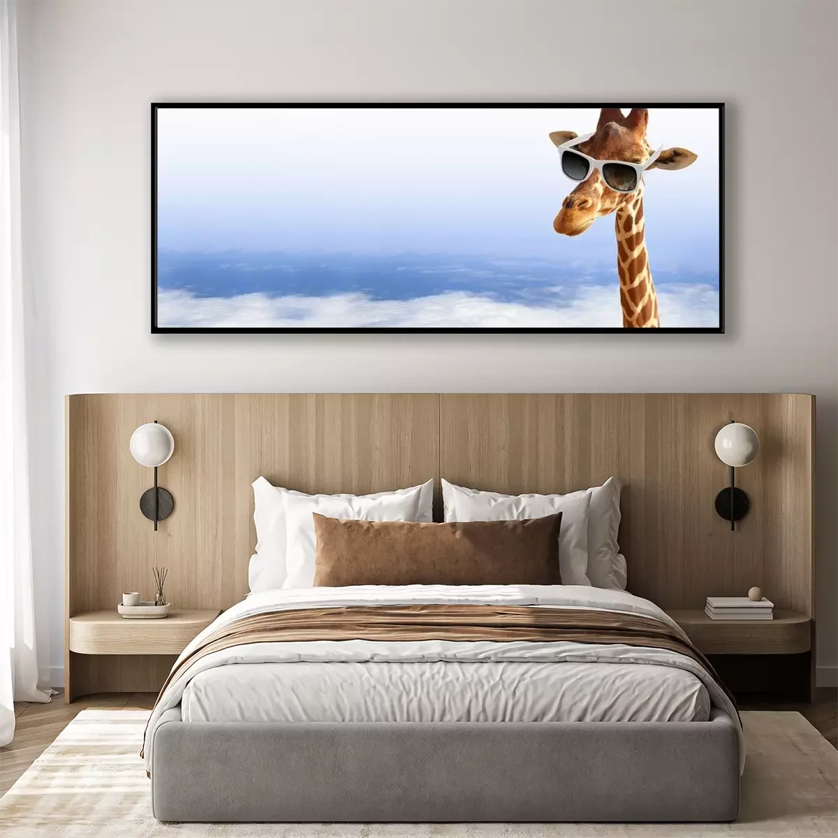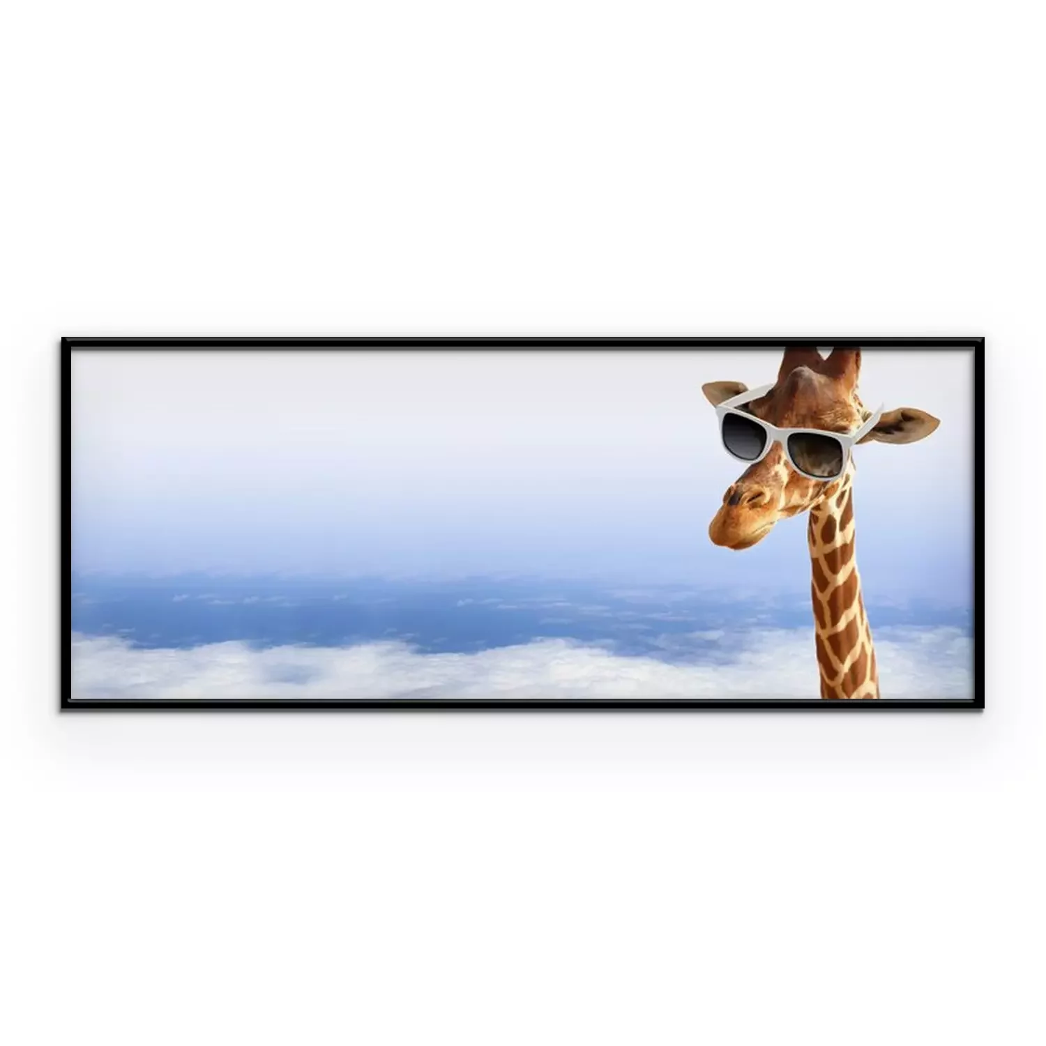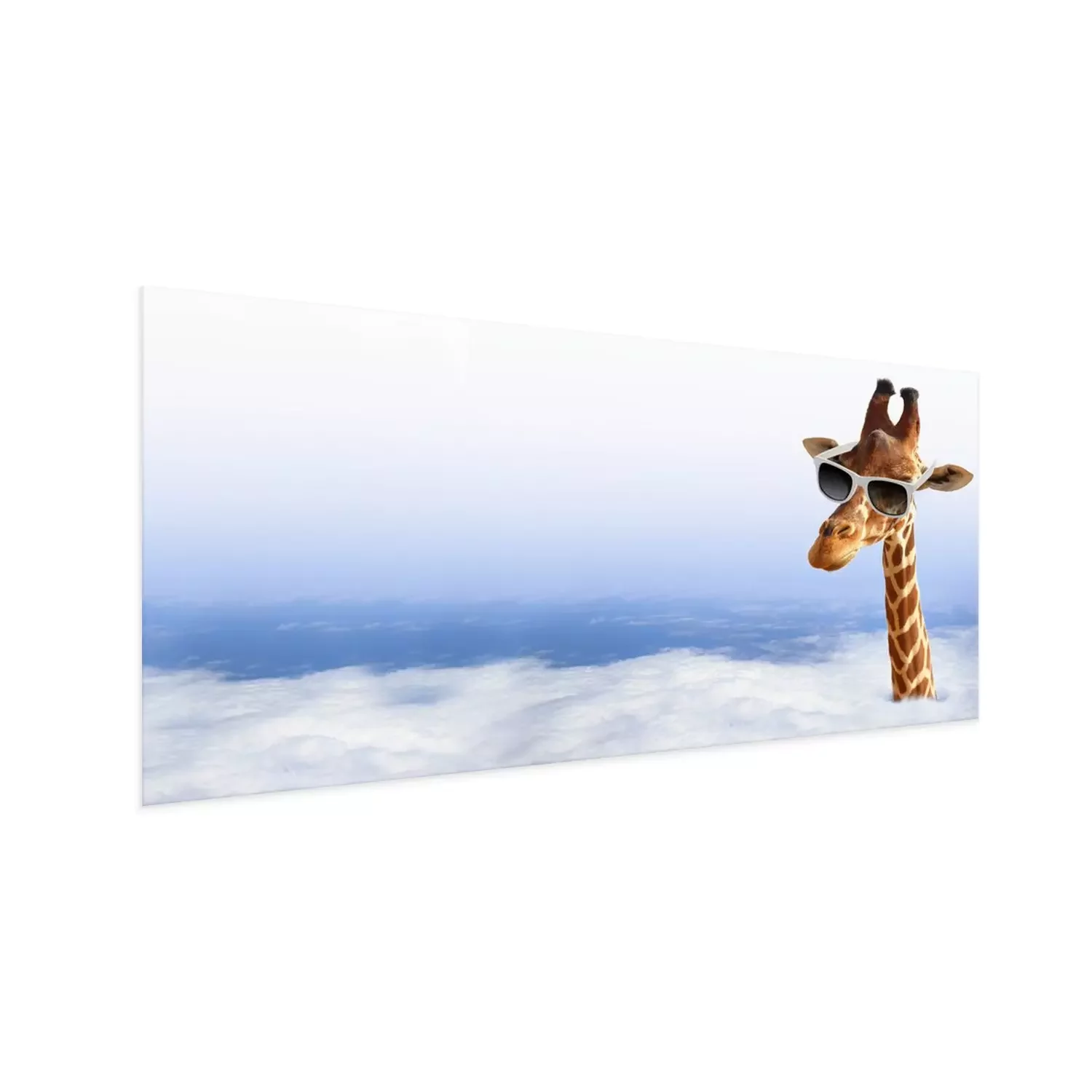 Poster: Grappige giraf met een zonnebril die uit de wolken