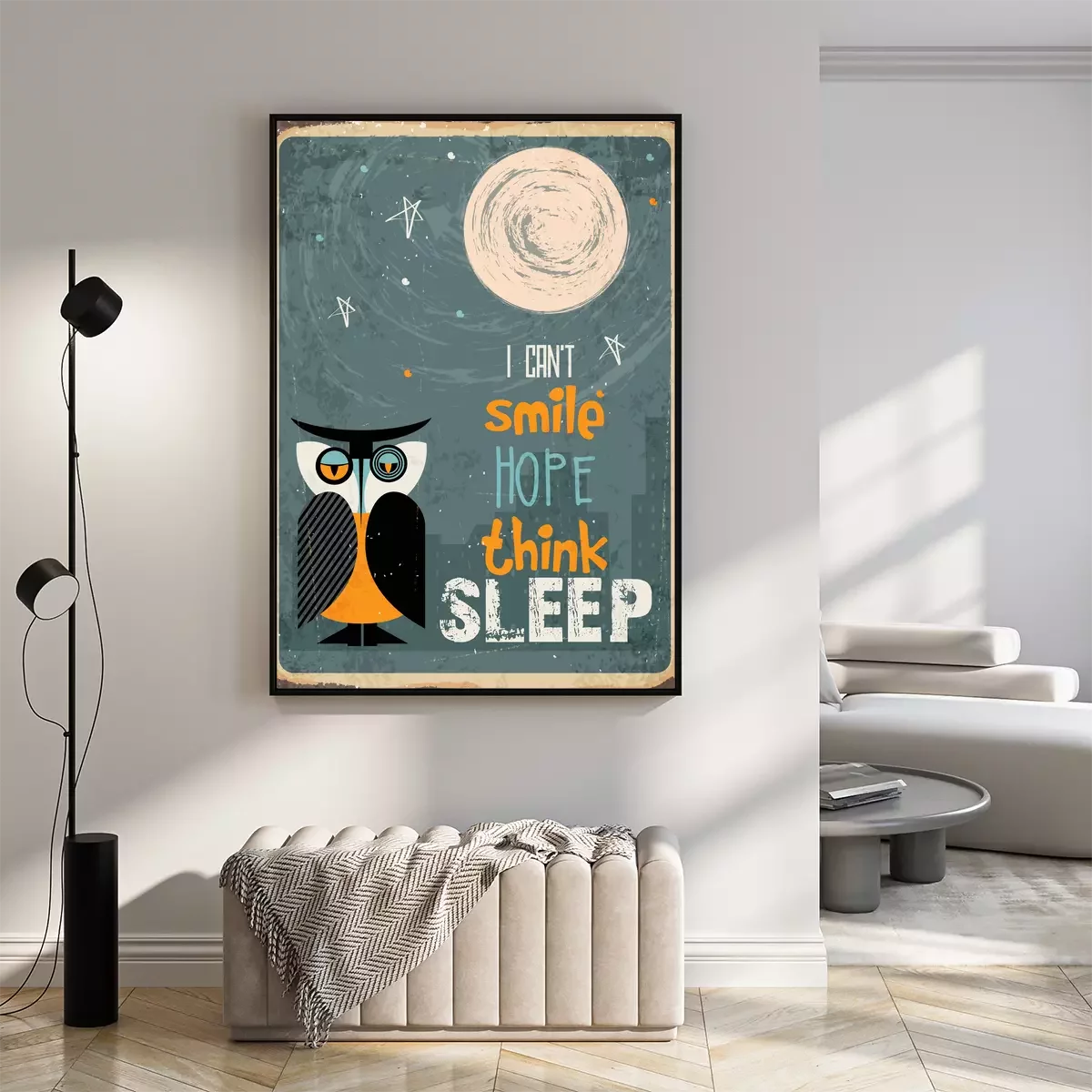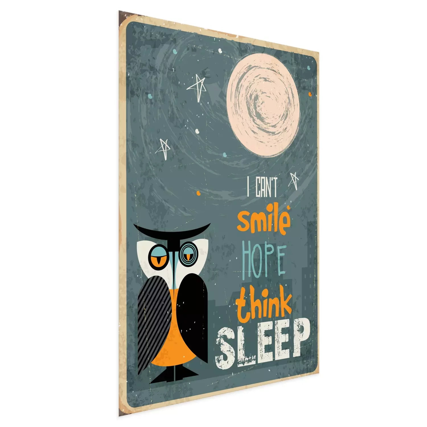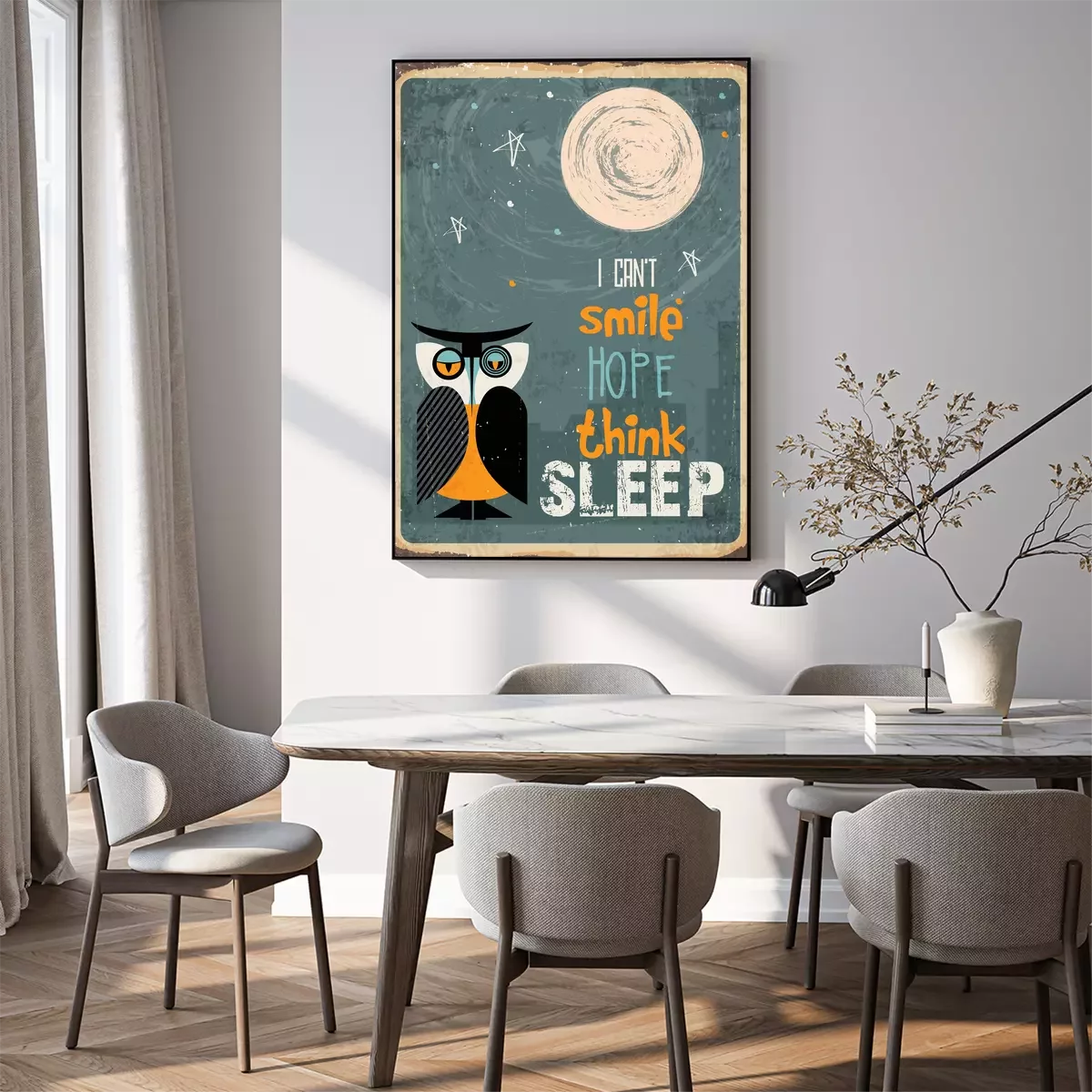 Poster: Grappige slogan en uilillustratie