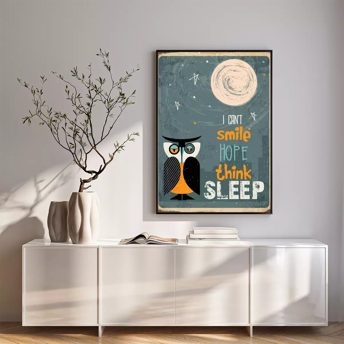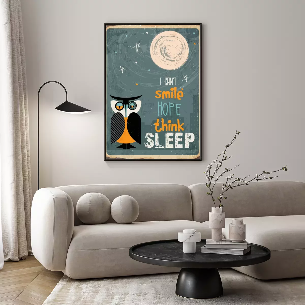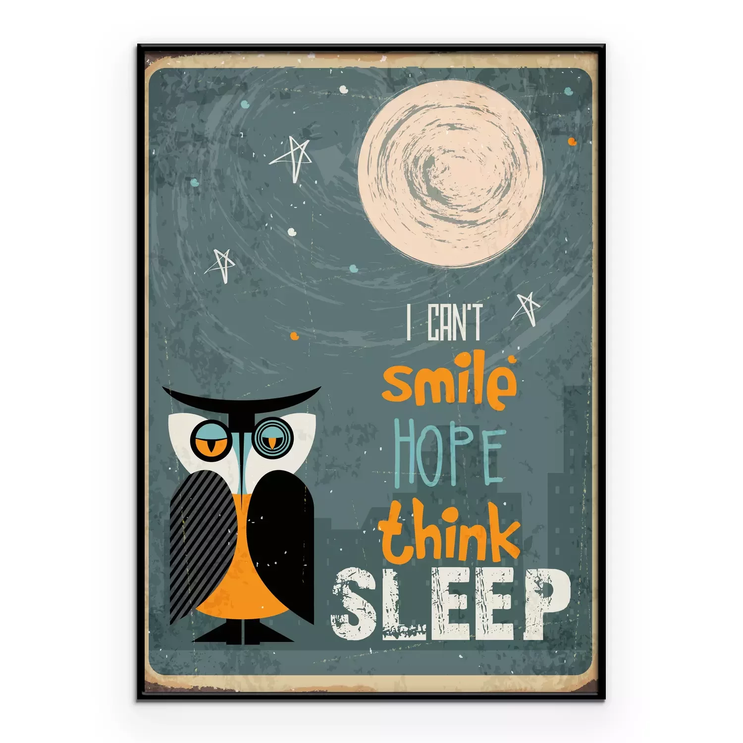 Poster: Grappige slogan en uilillustratie