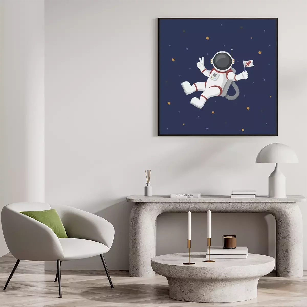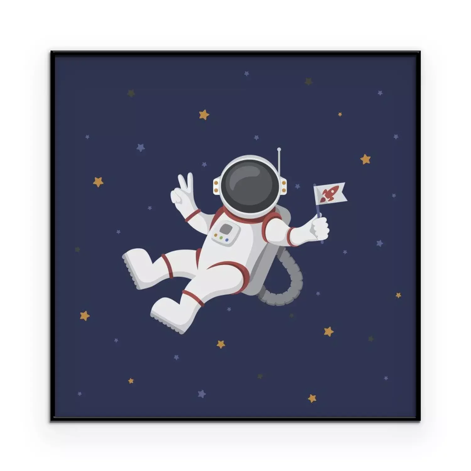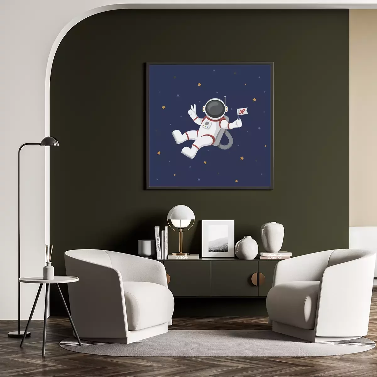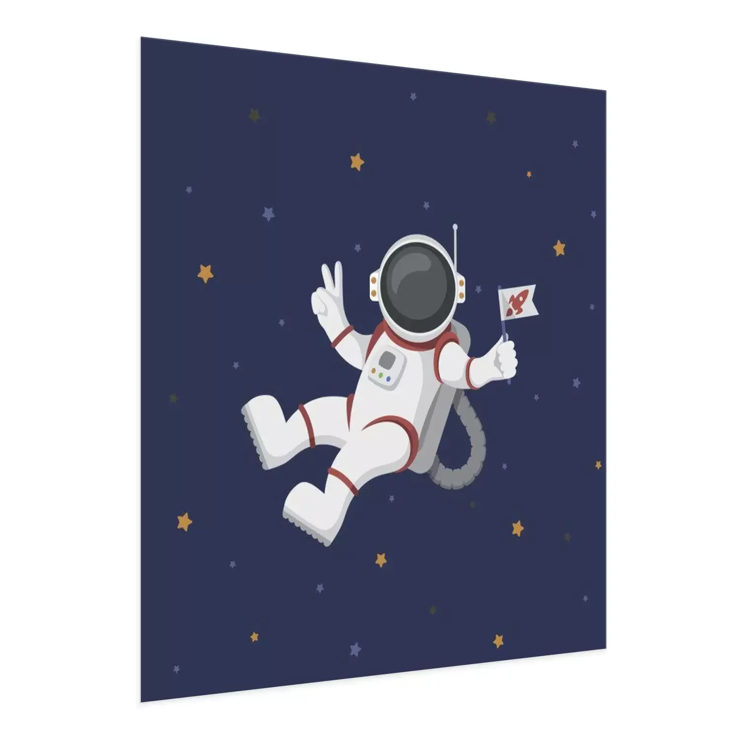 Poster: Grappige vliegende astronaut in de ruimte met rond sterren