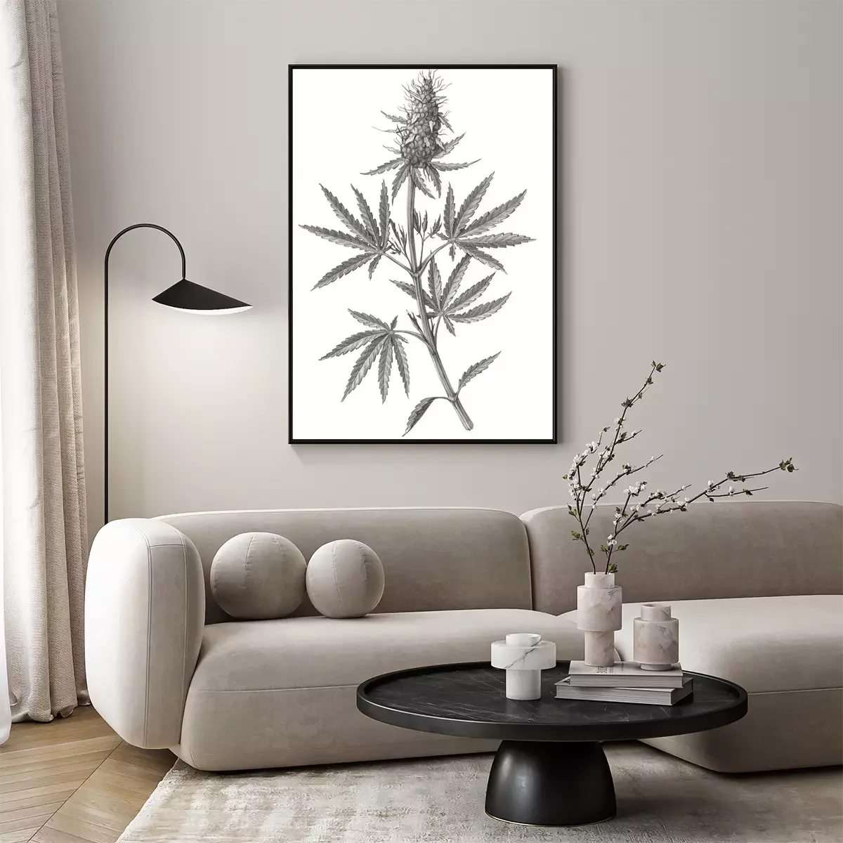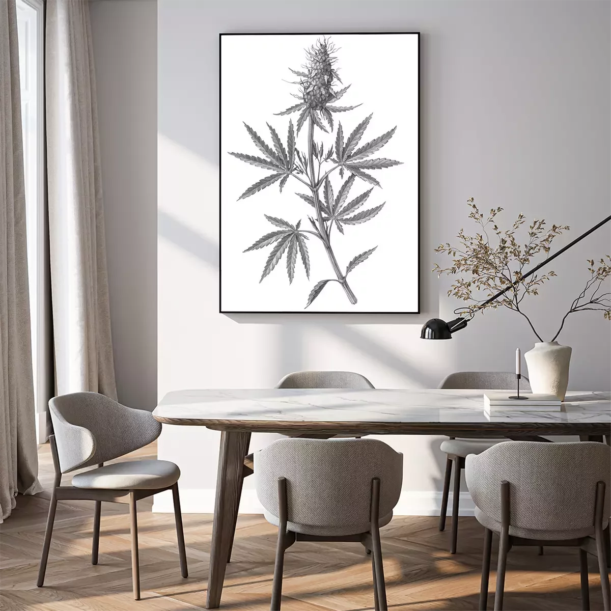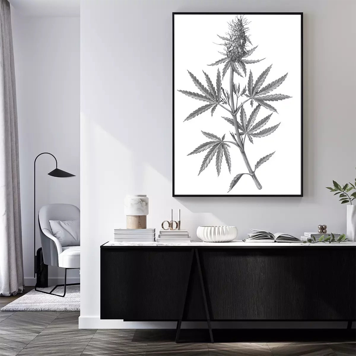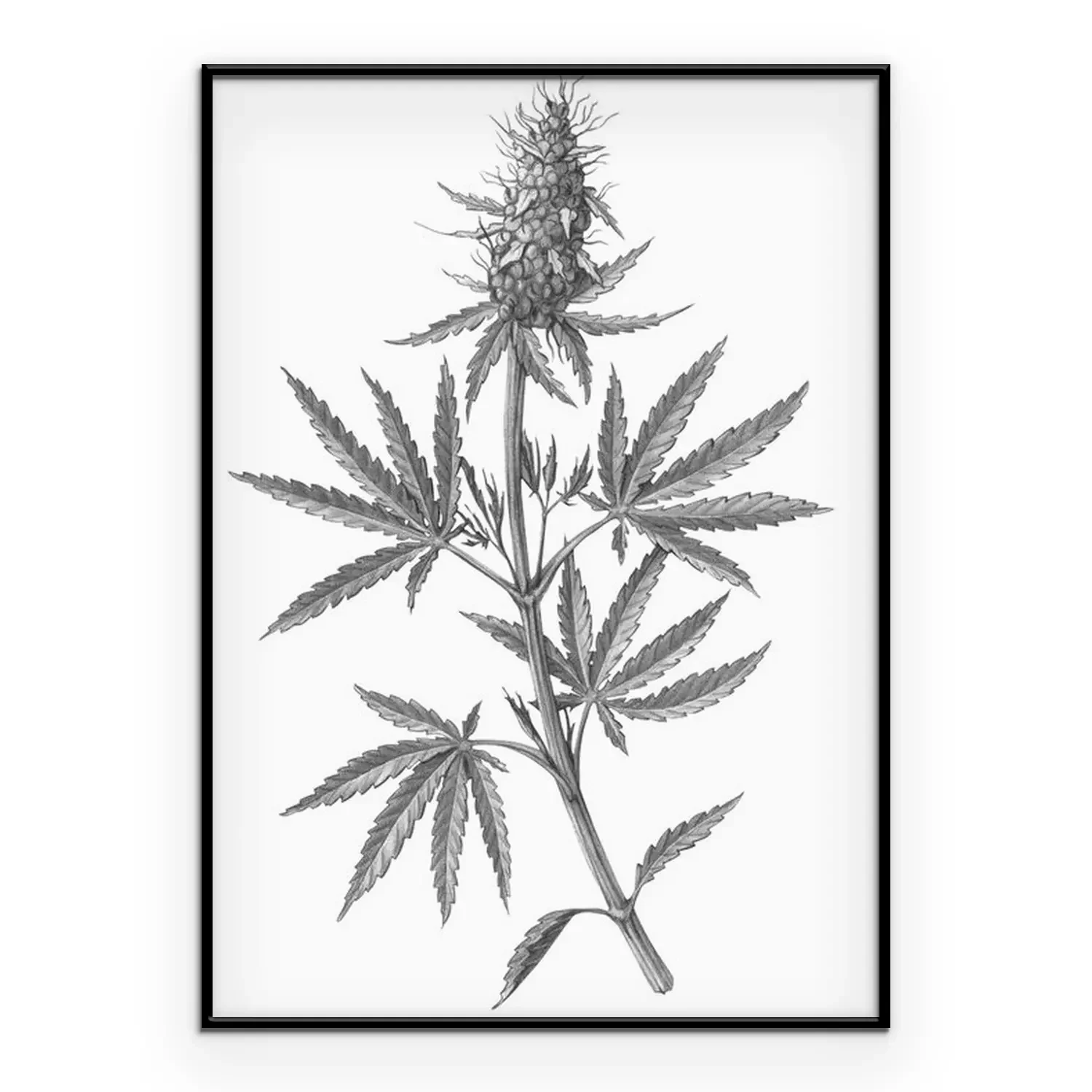 Poster: Gravure van een cannabistak met bladeren en een bloem