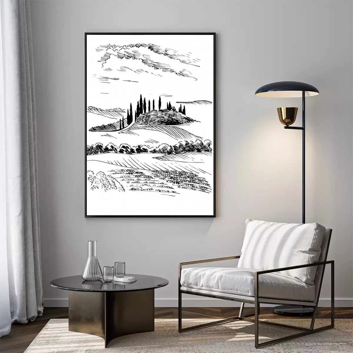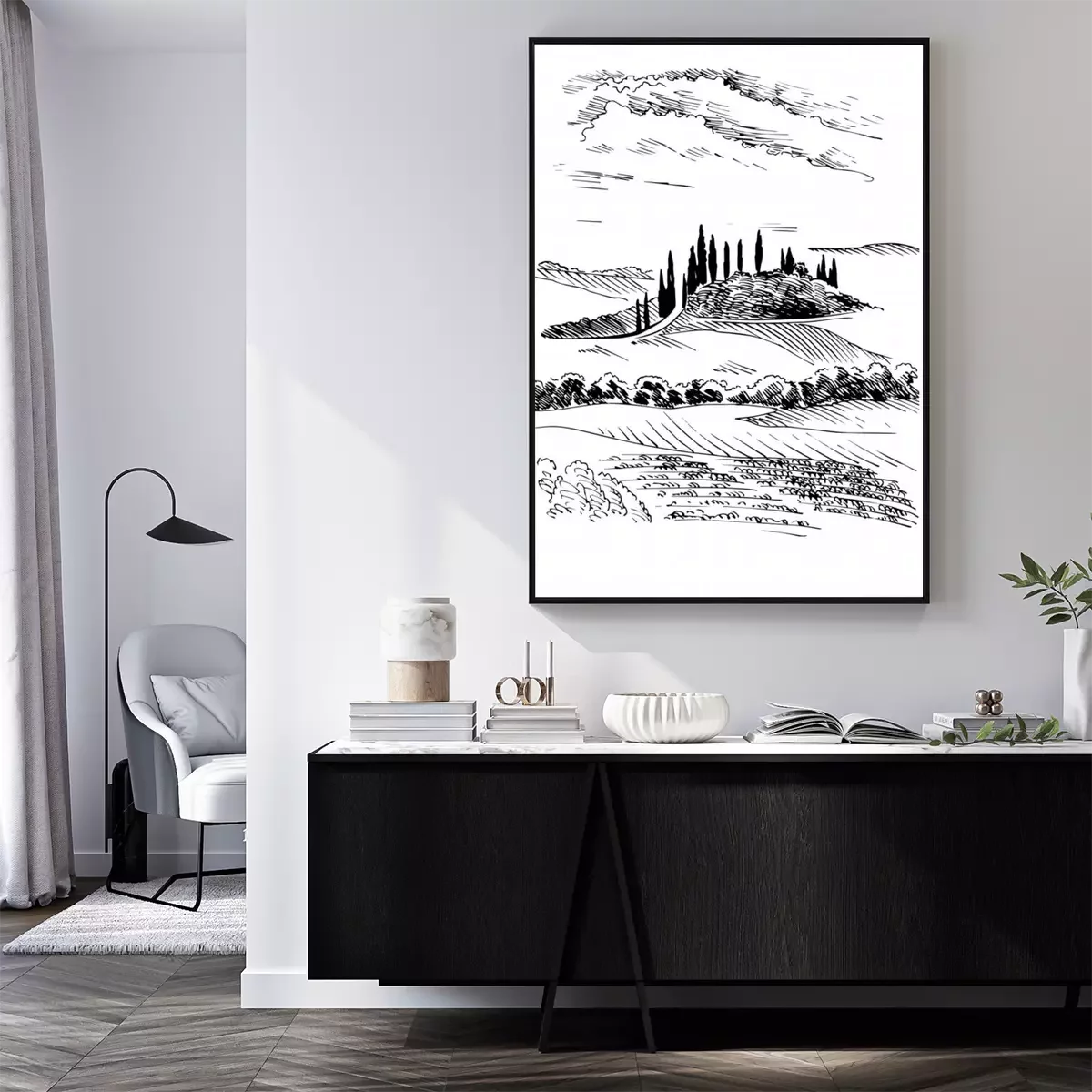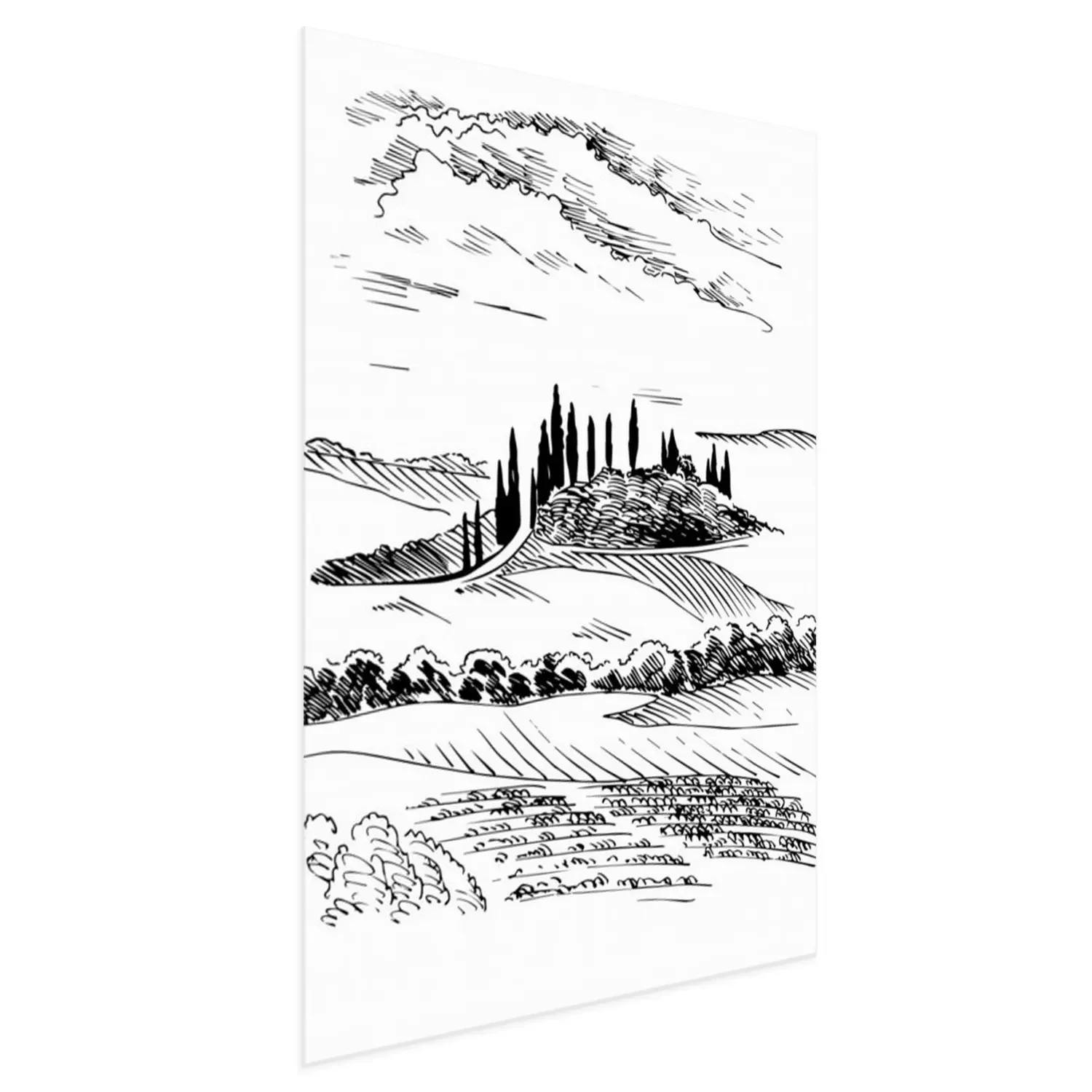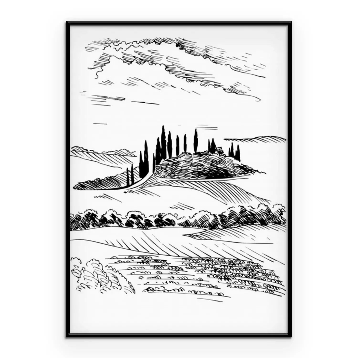 Poster Green grass field on small hills. Meadow, alkali, lye, grassland, pommel, lea, pasturage, farm. Rural scenery landscape panorama of countryside pastures. Vector sketch illustration