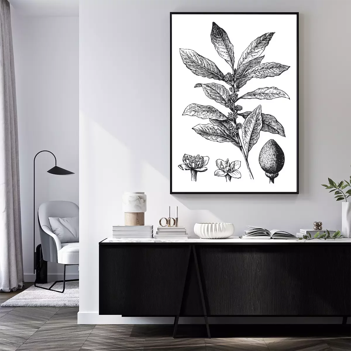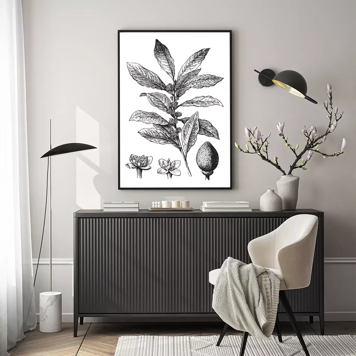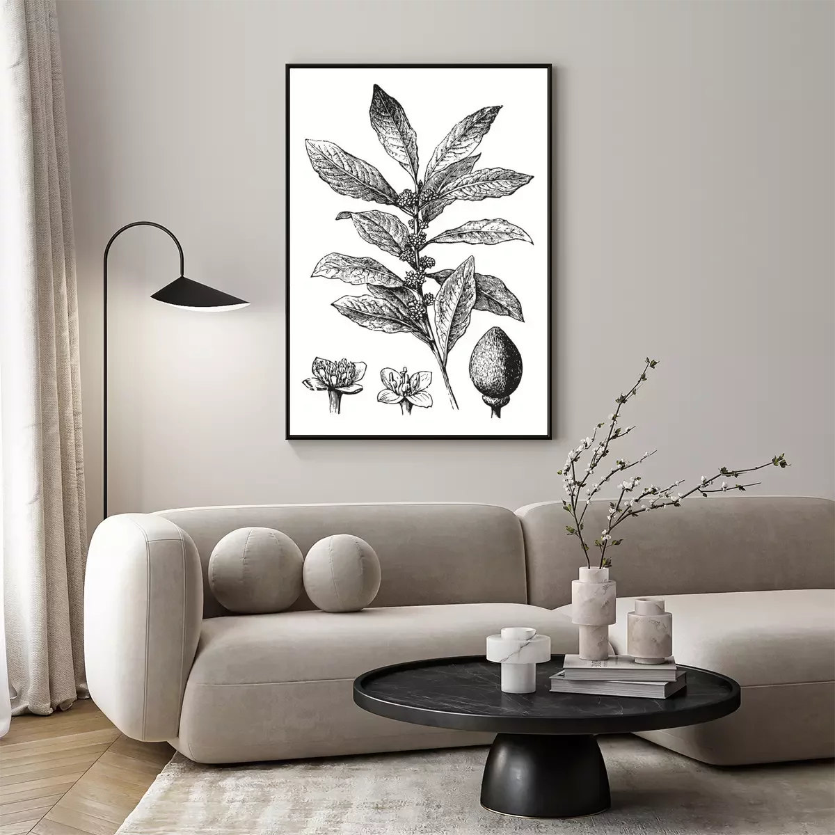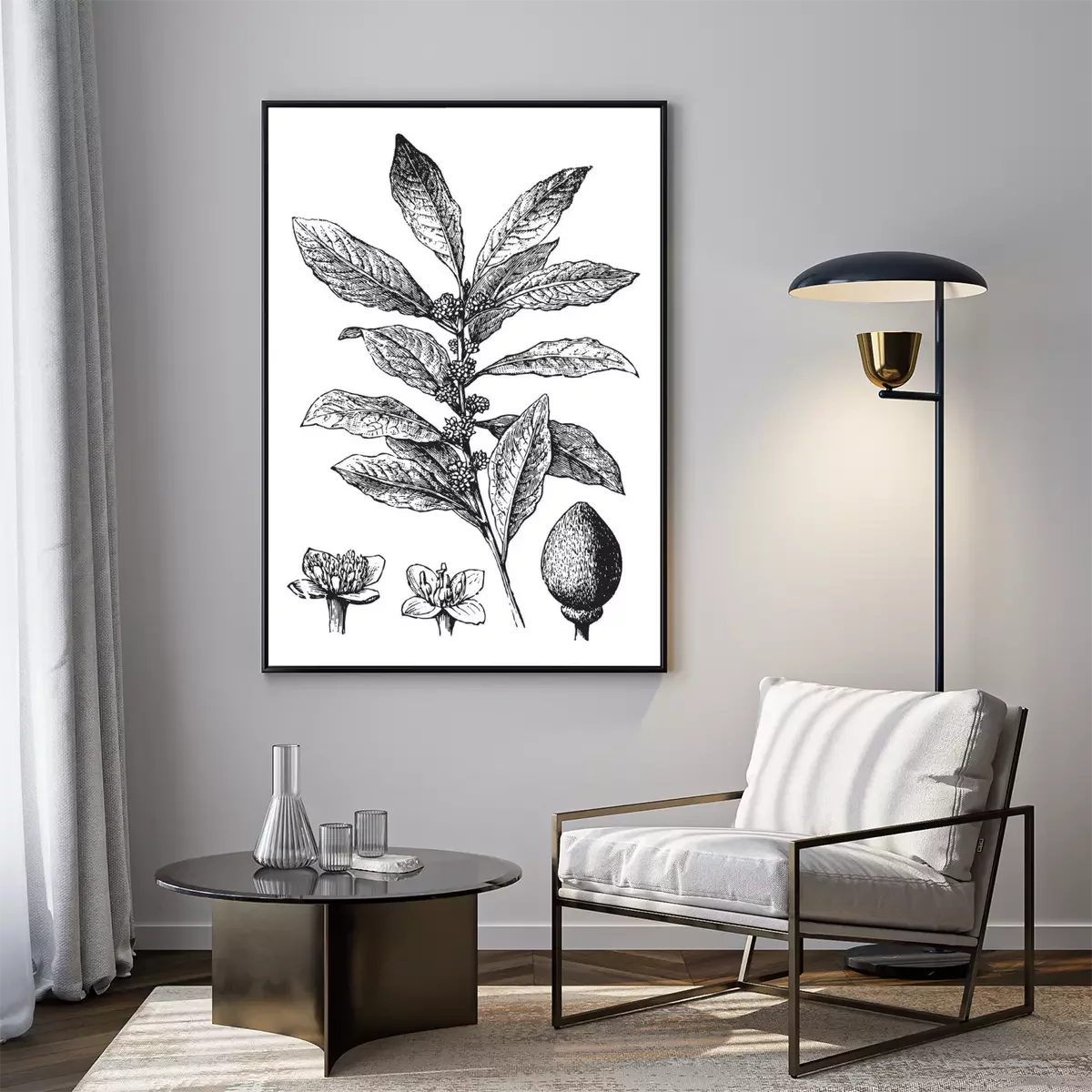 Poster: Grijze gravure met de stengel en bloemen