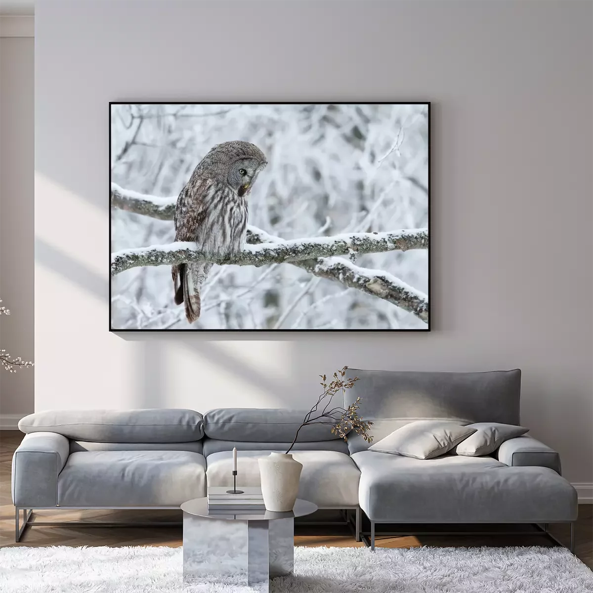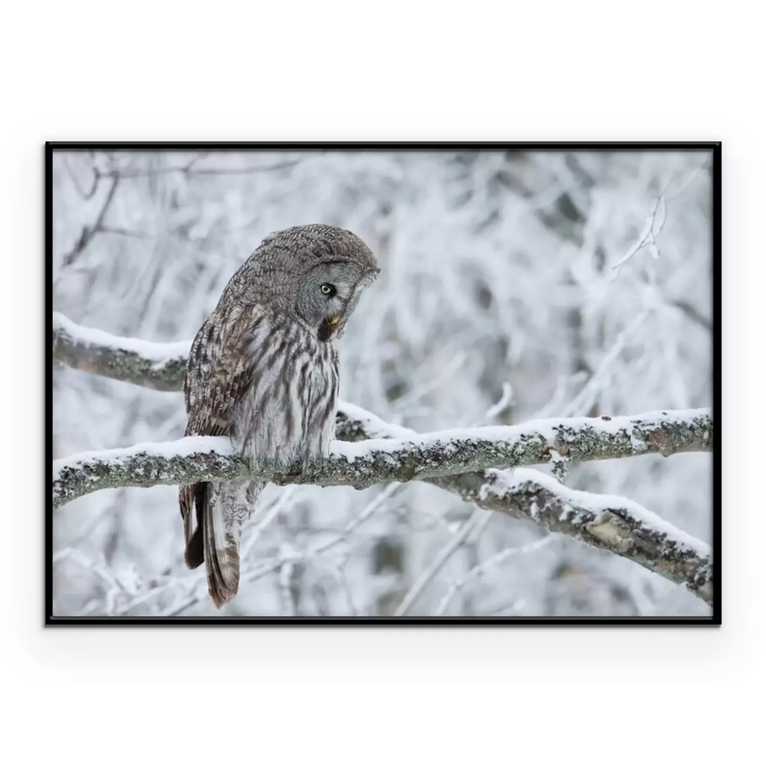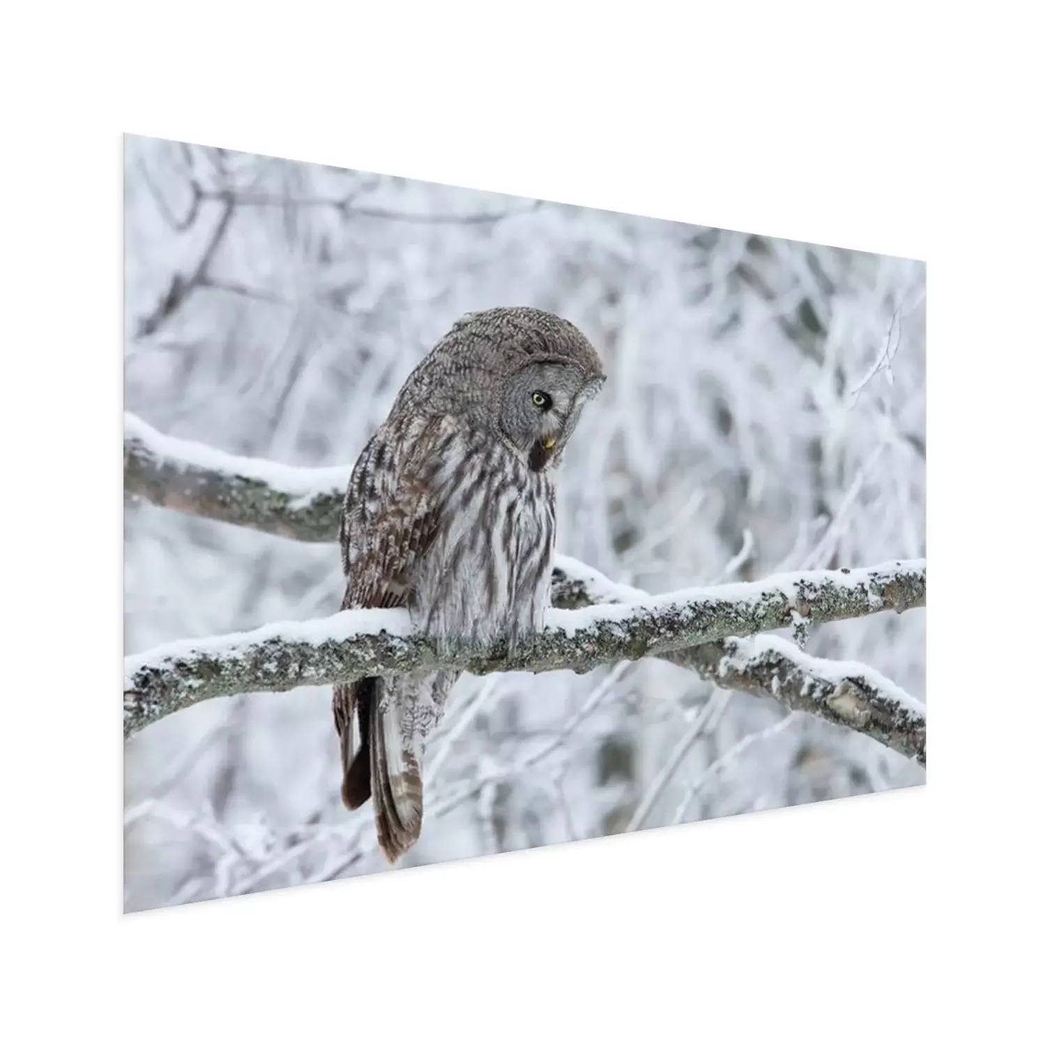 Poster: Grijze uil op een besneeuwde tak