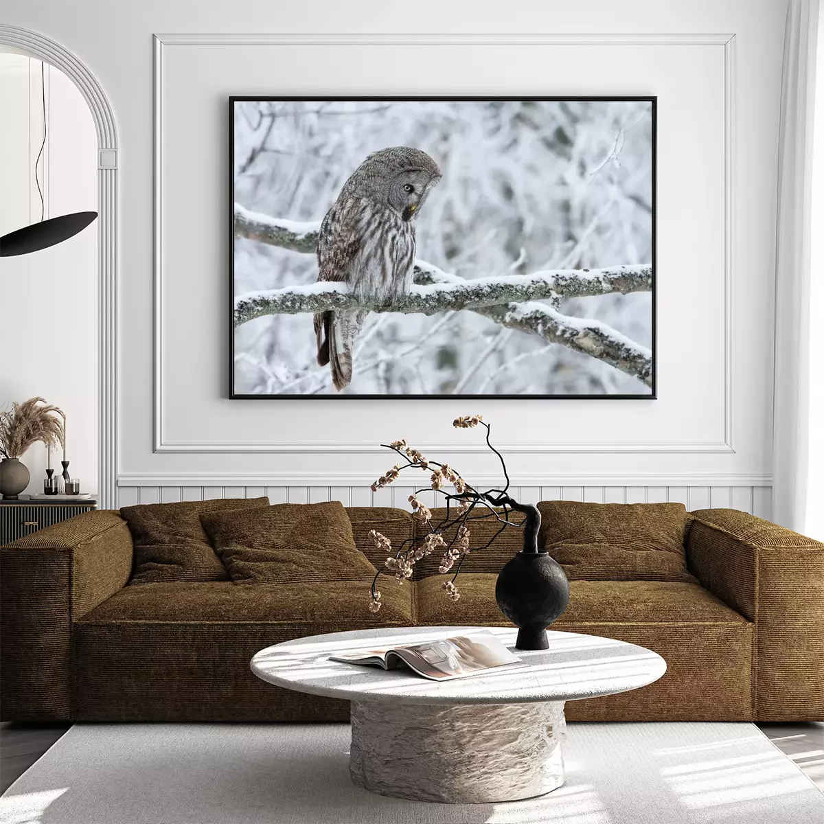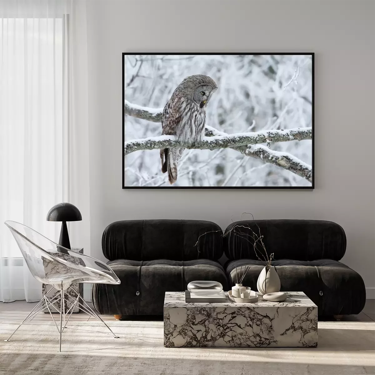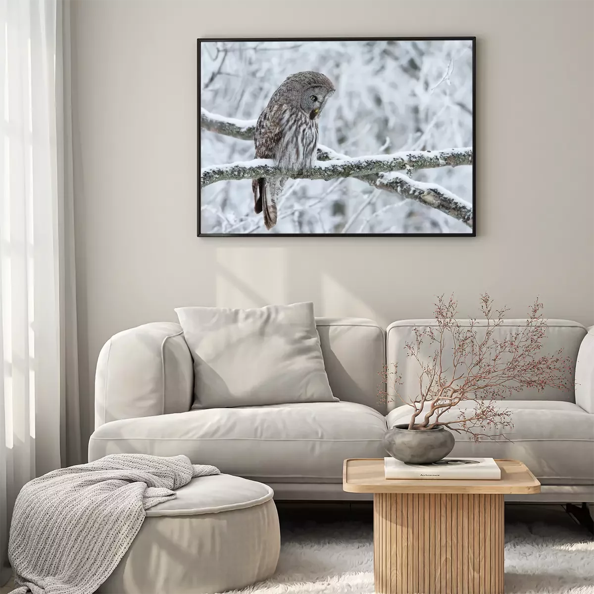 Poster: Grijze uil op een besneeuwde tak