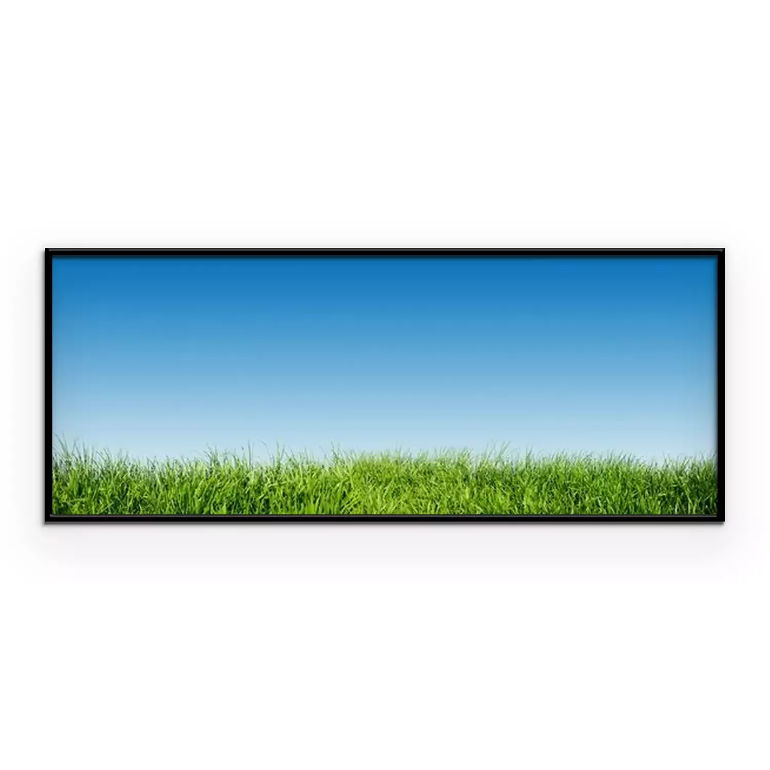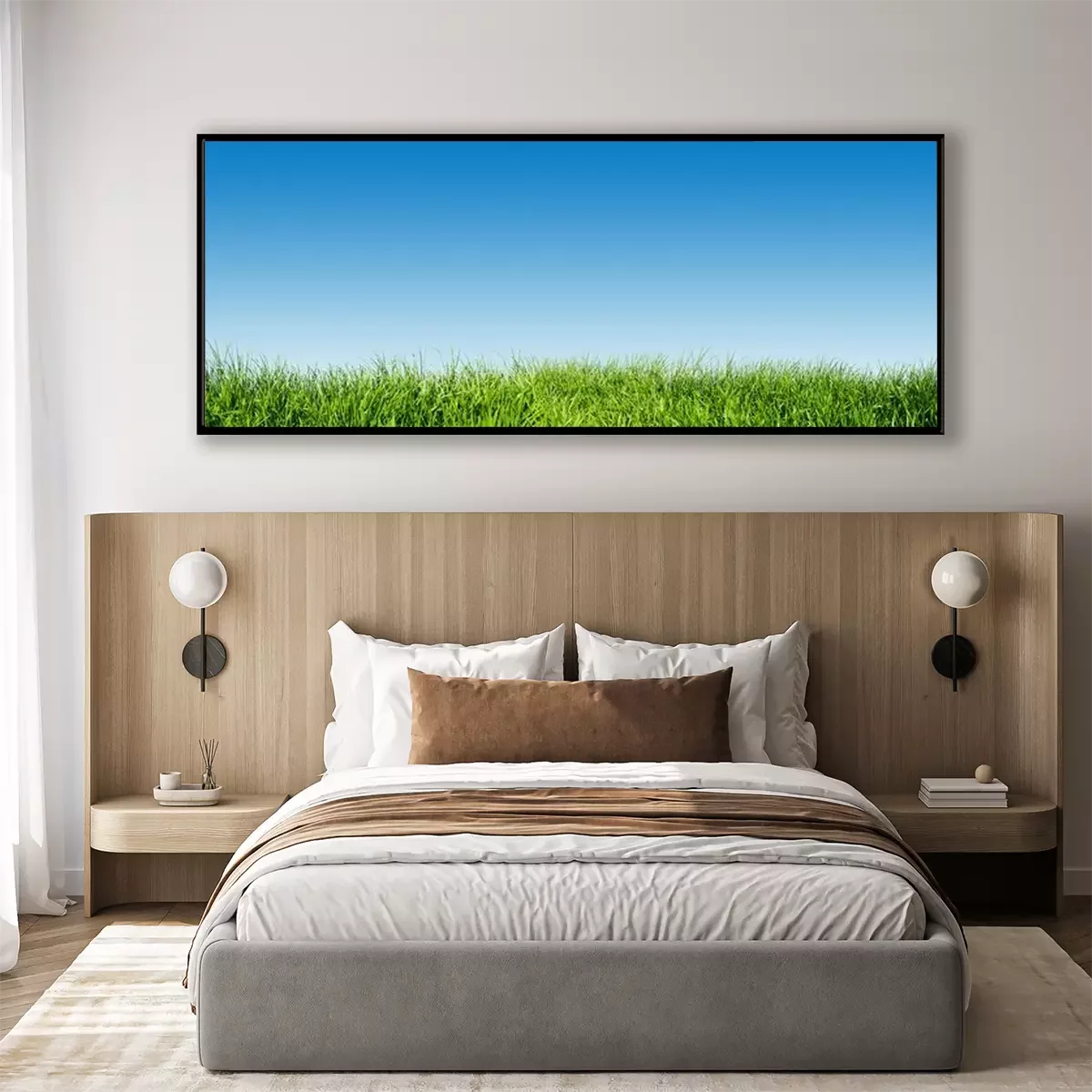 Poster: Groen gras op heldere blauwe hemel, de lente natuur thema. Panorama