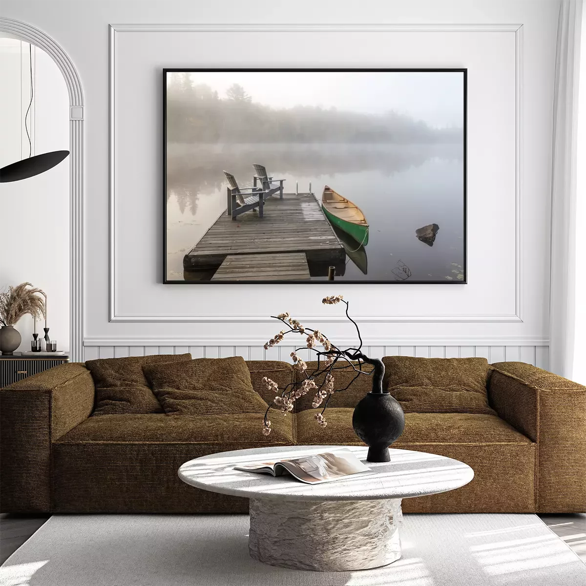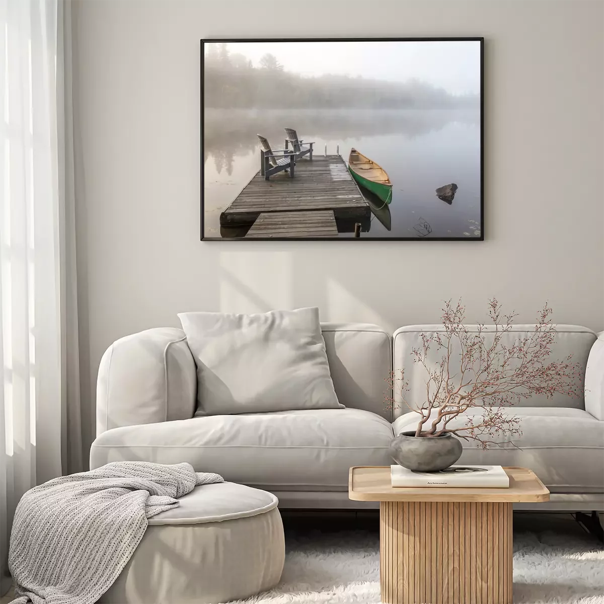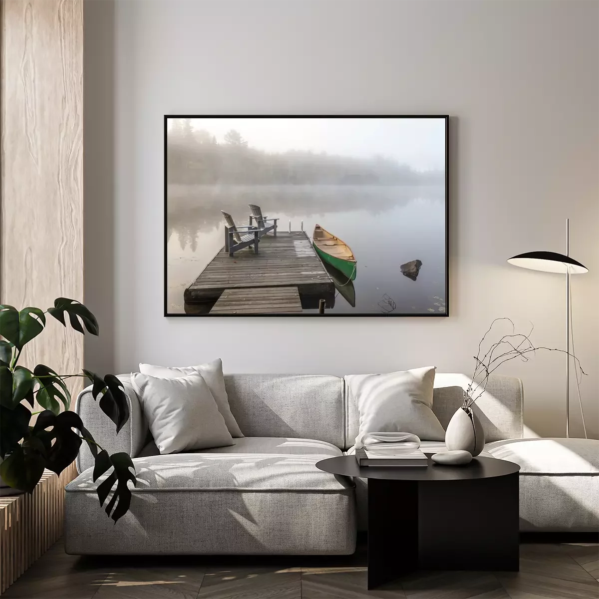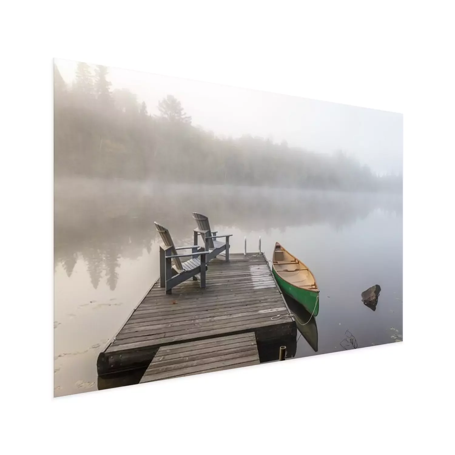 Poster: Groene Kano en Dock op een Misty Morning