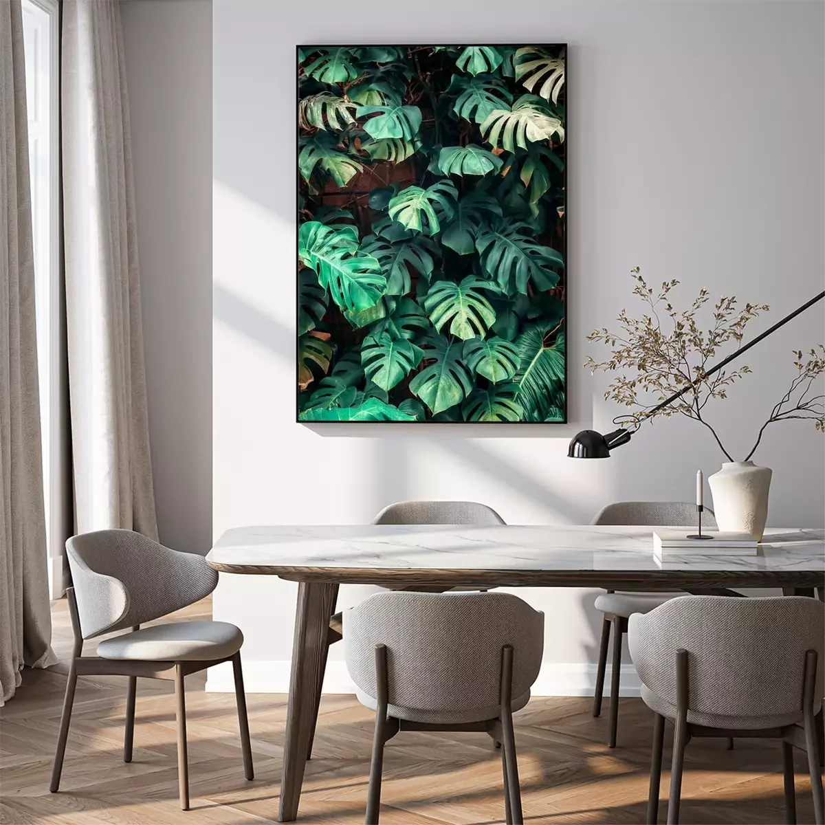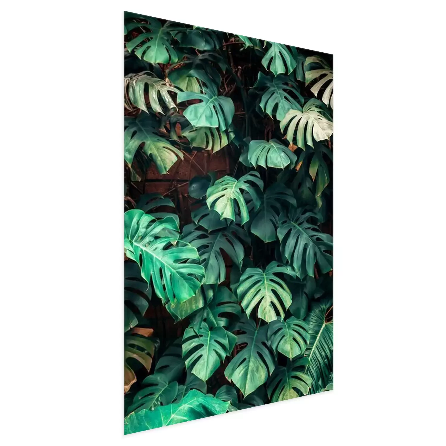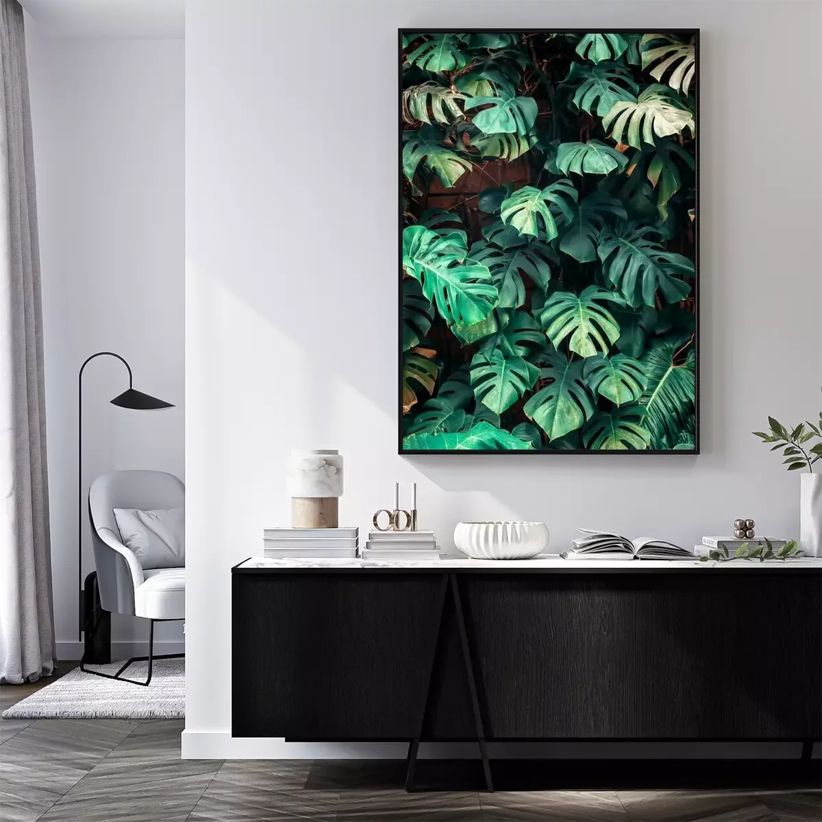 Green leaves of Monstera philodendron, plant growing in botanical garden, tropical forest plants, evergreen vines abstract background.