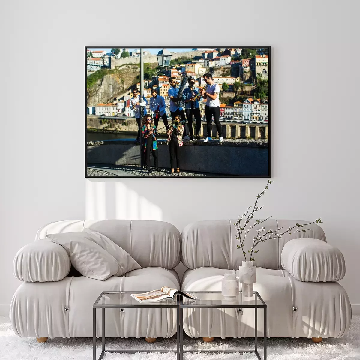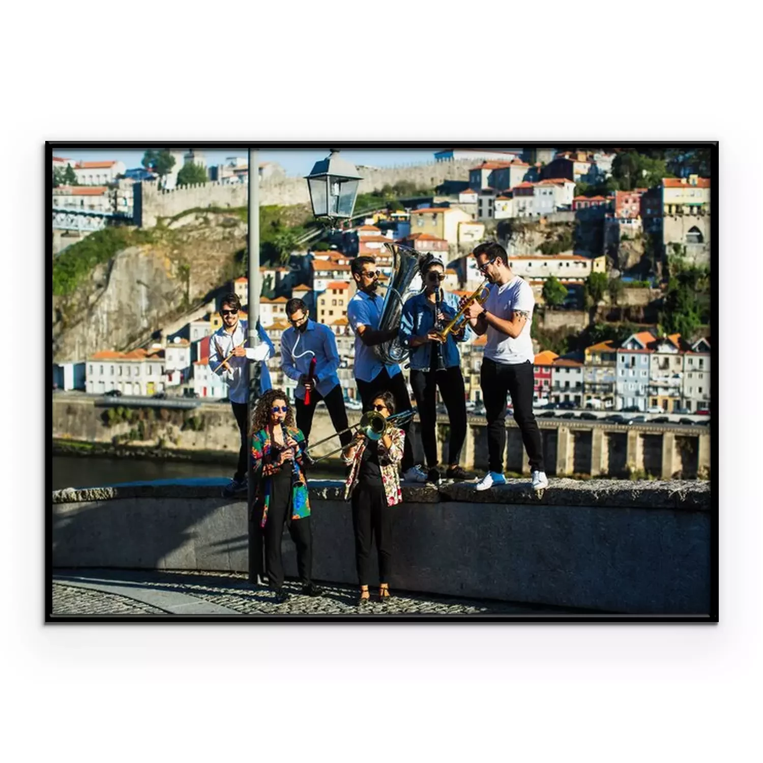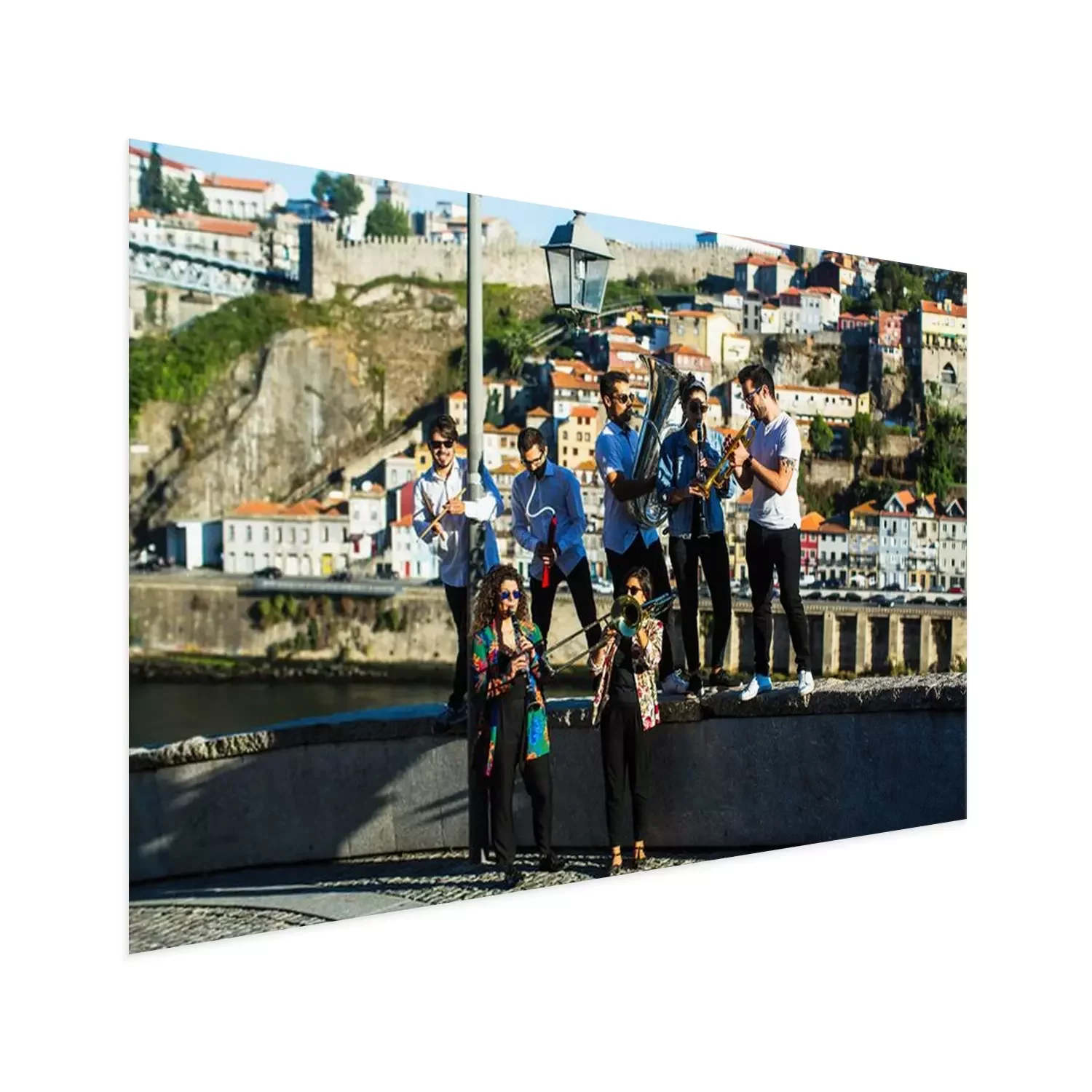 Poster: Groep muzikanten (Jazz band) spelen muziek in de straat van het oude centrum van Porto, Portugal.