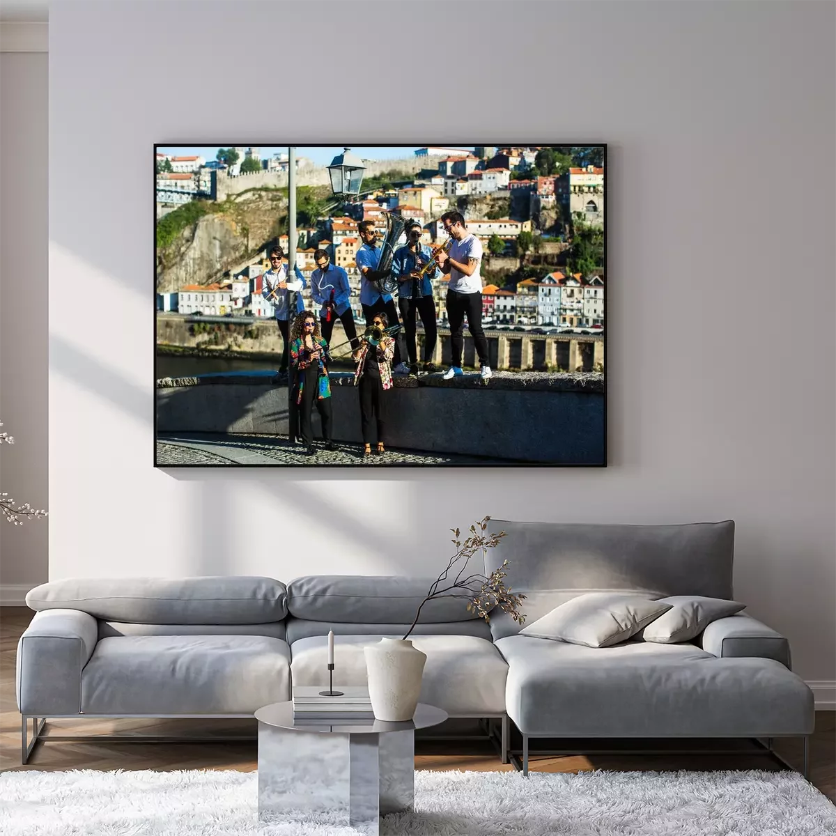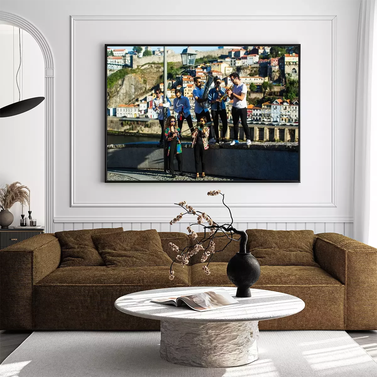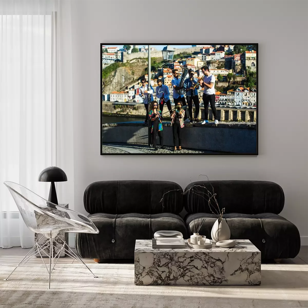 Poster: Groep muzikanten (Jazz band) spelen muziek in de straat van het oude centrum van Porto, Portugal.