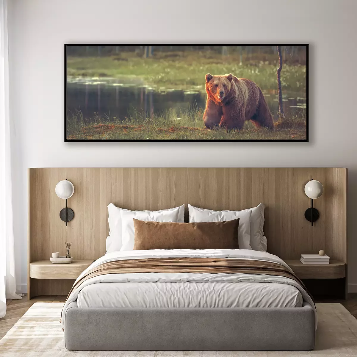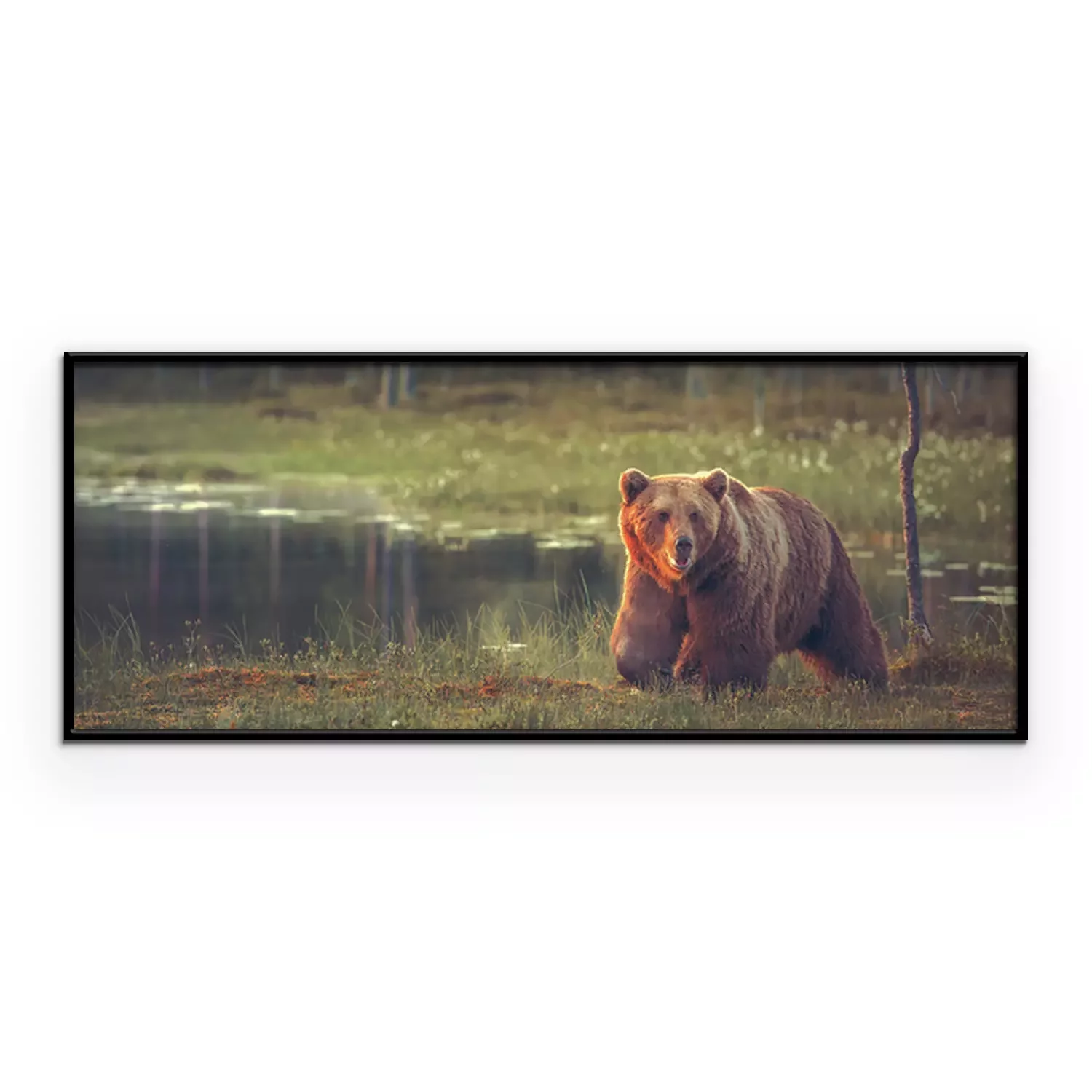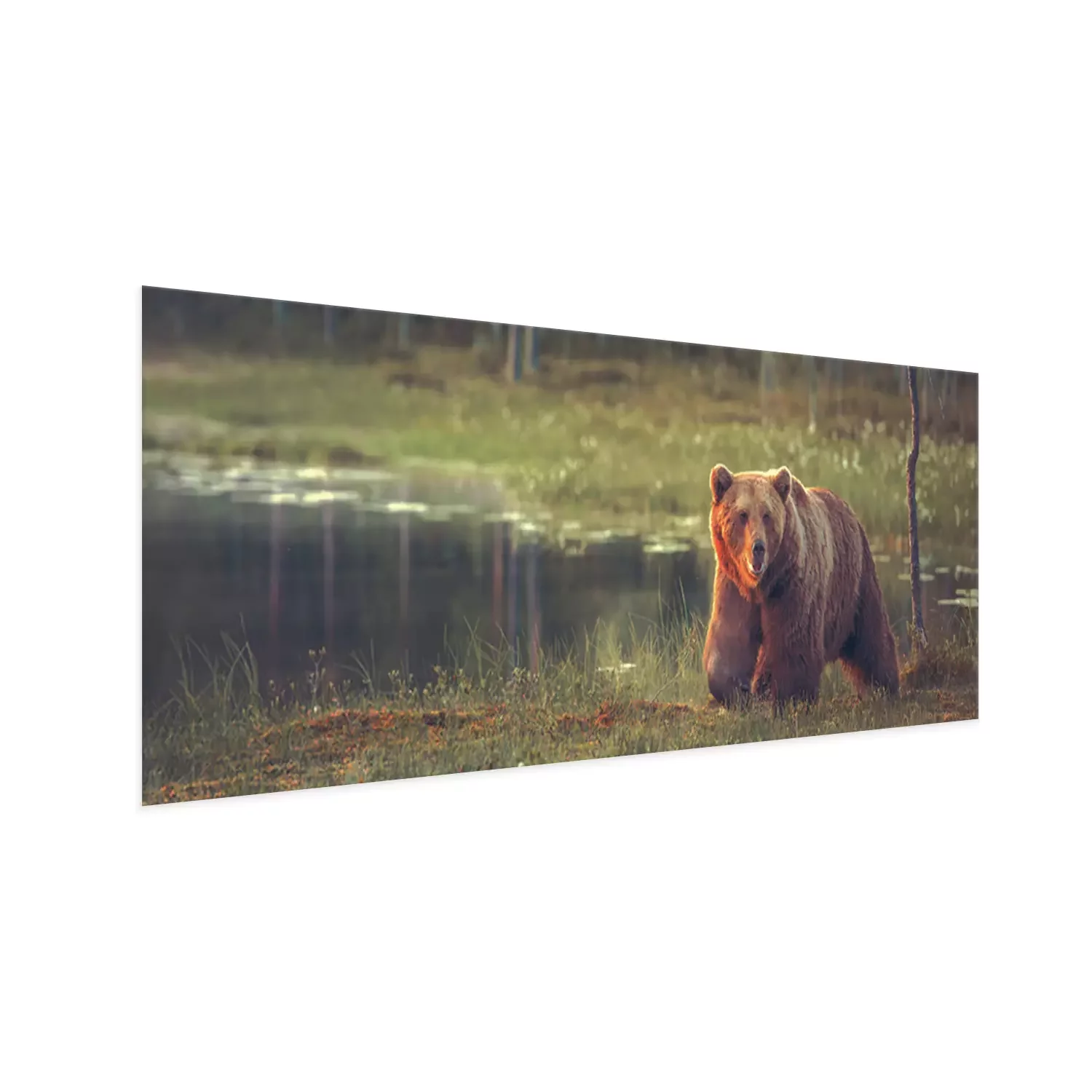Poster: Grote mannelijke beer lopen in het veen bij zonsondergang. Sized te passen cover image voor op populaire sociale media site