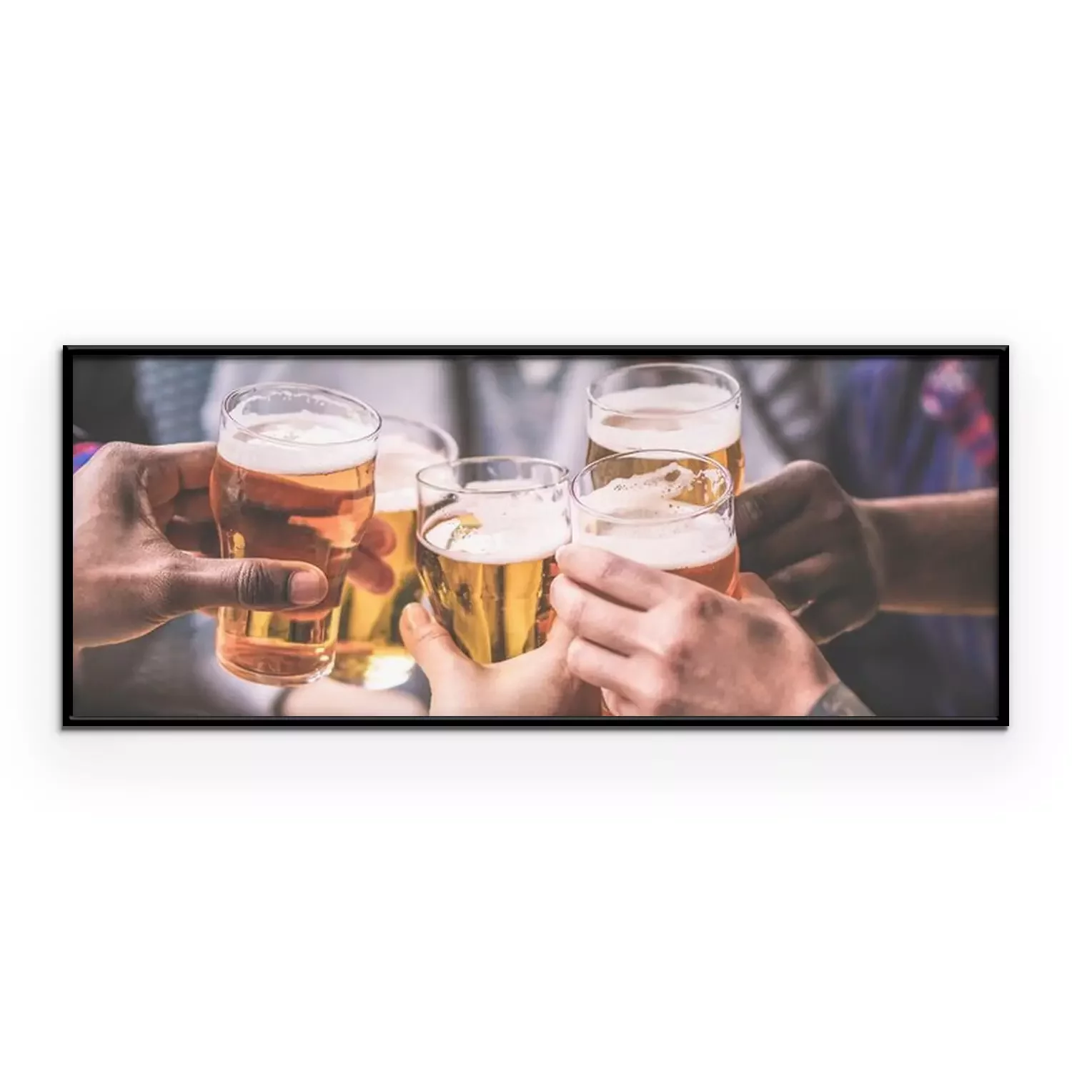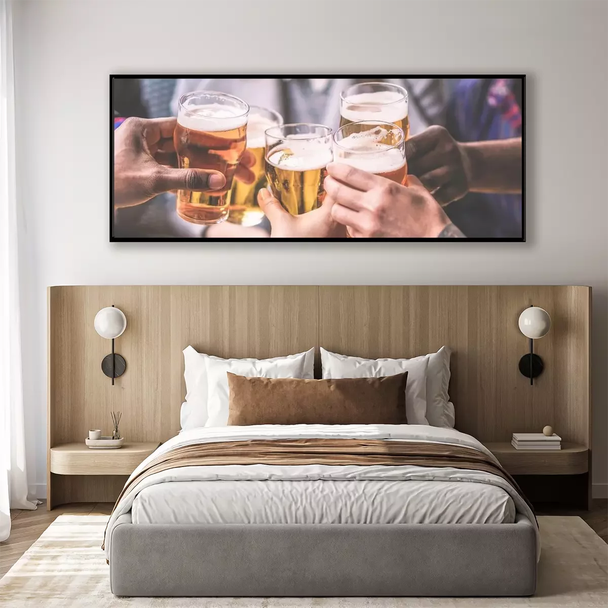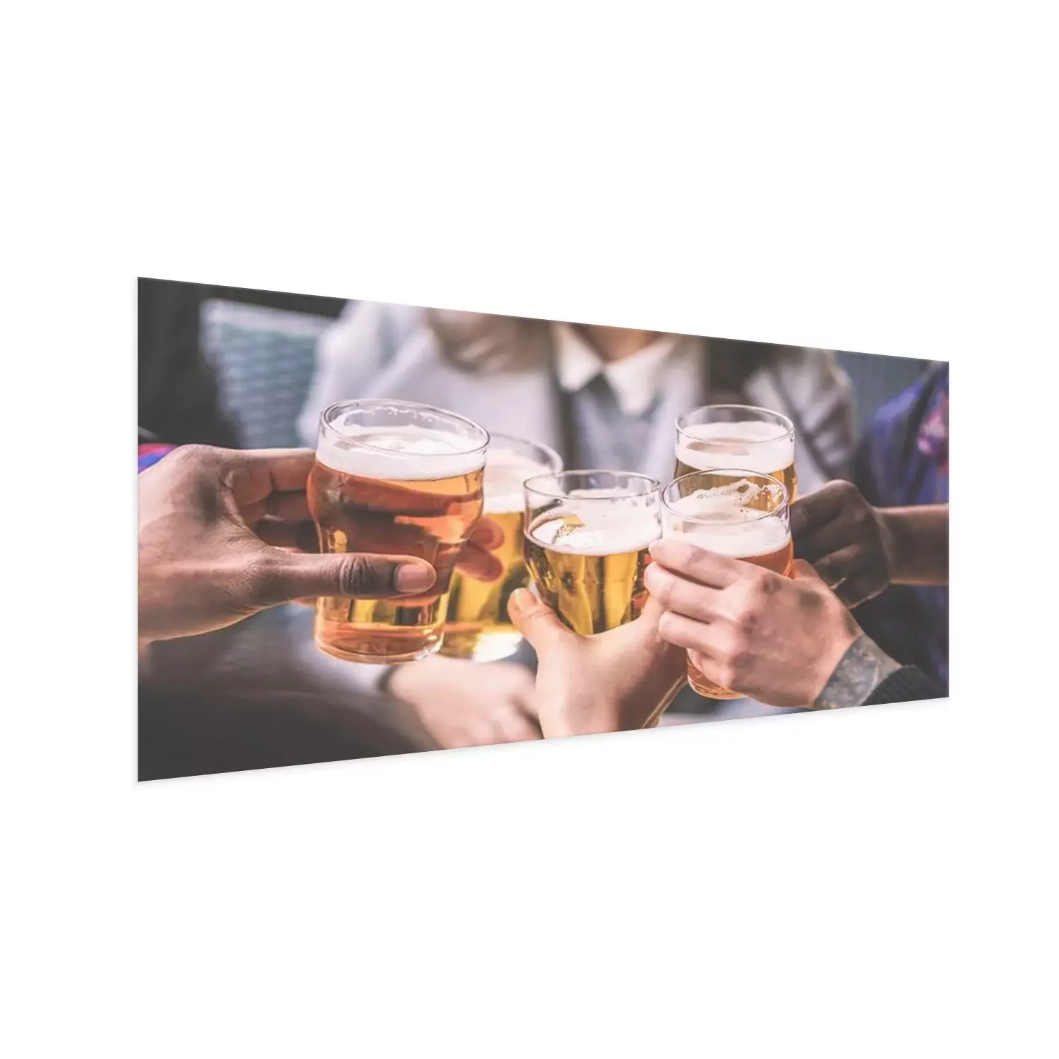 Poster Group of friends enjoying a beer glasses in brewery english pub - Young people cheering at bar restaurant - Friendship and youth concept - Warm vintage filter - Main focus on left black hand