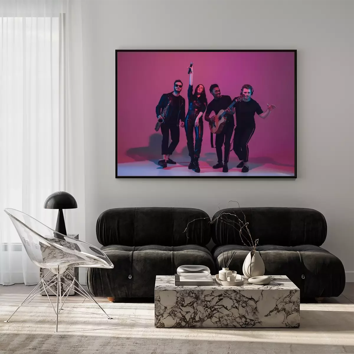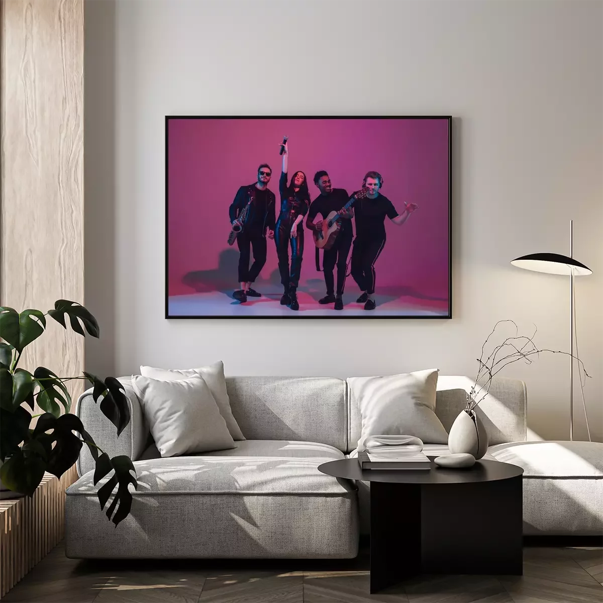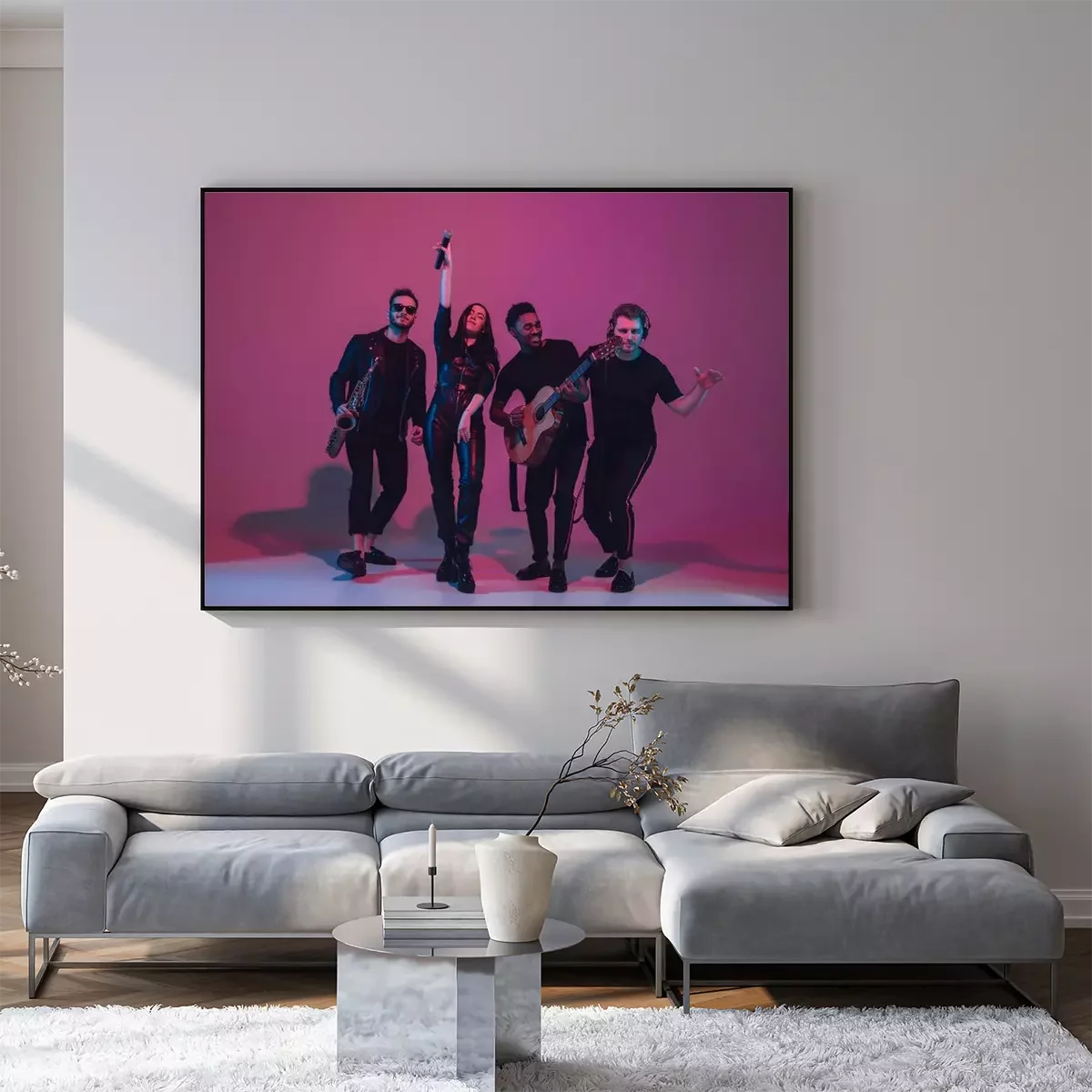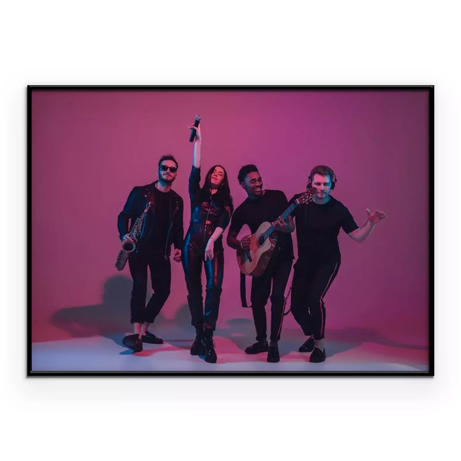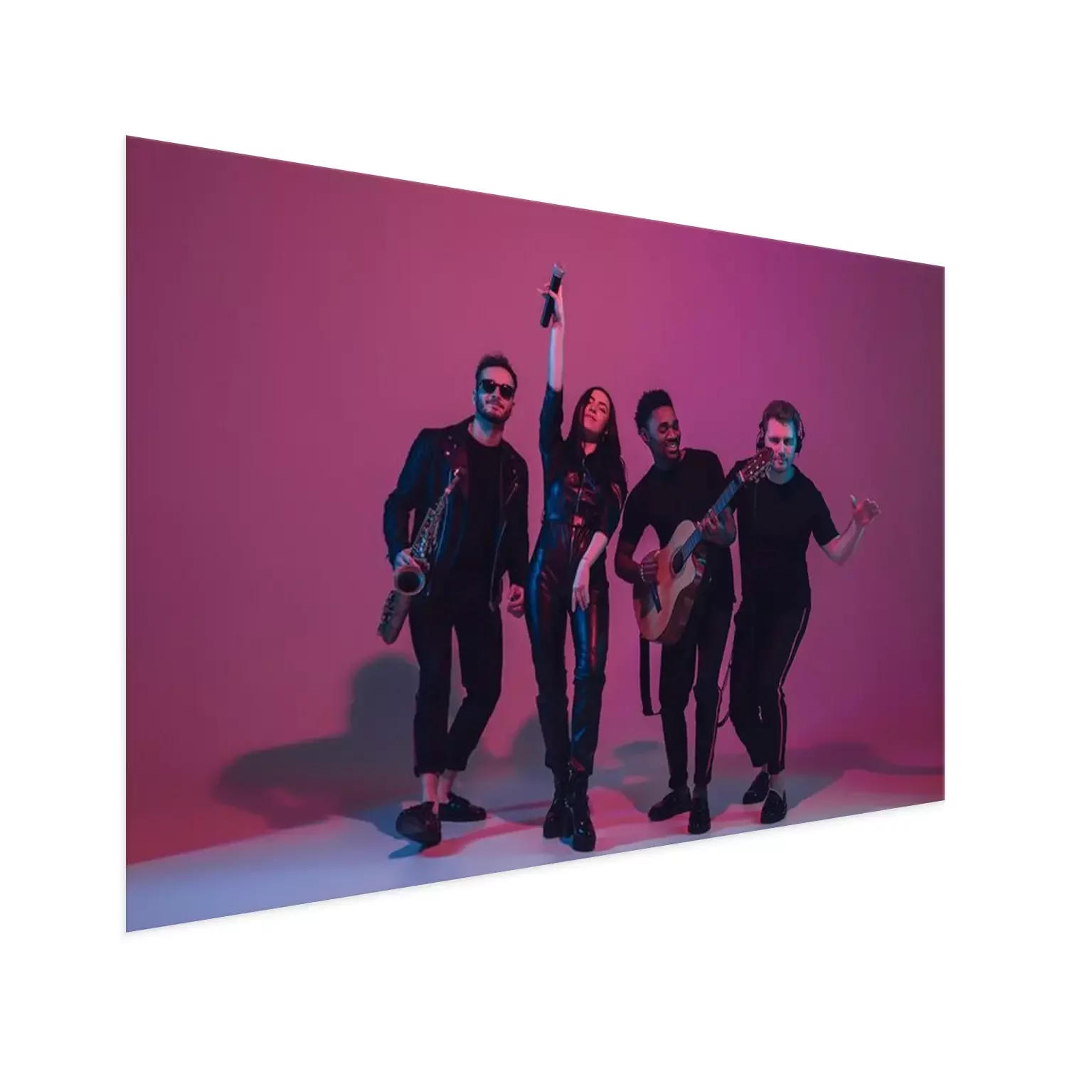 Poster Group of young multiethnic musicians created band, dancing in neon light on pink background. Concept of music, hobby, festival, wellness. Joyful party host, dancer, singer, guitarist, saxophonist.