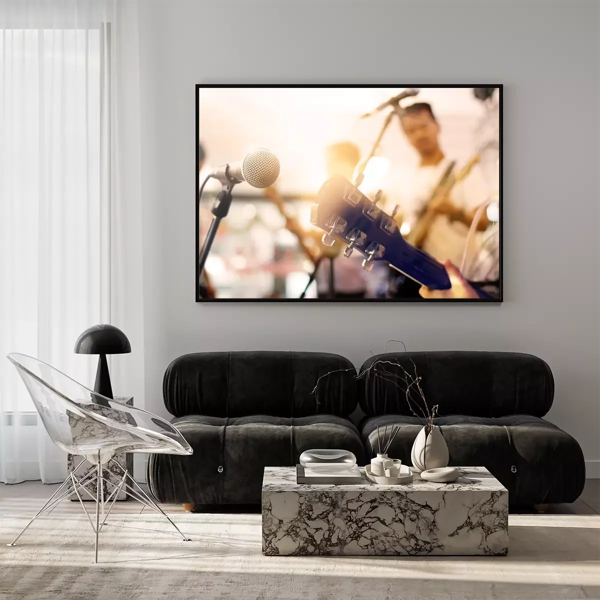 Gitarist op het podium voor de achtergrond, zacht en onscherpte concept, vintage toon